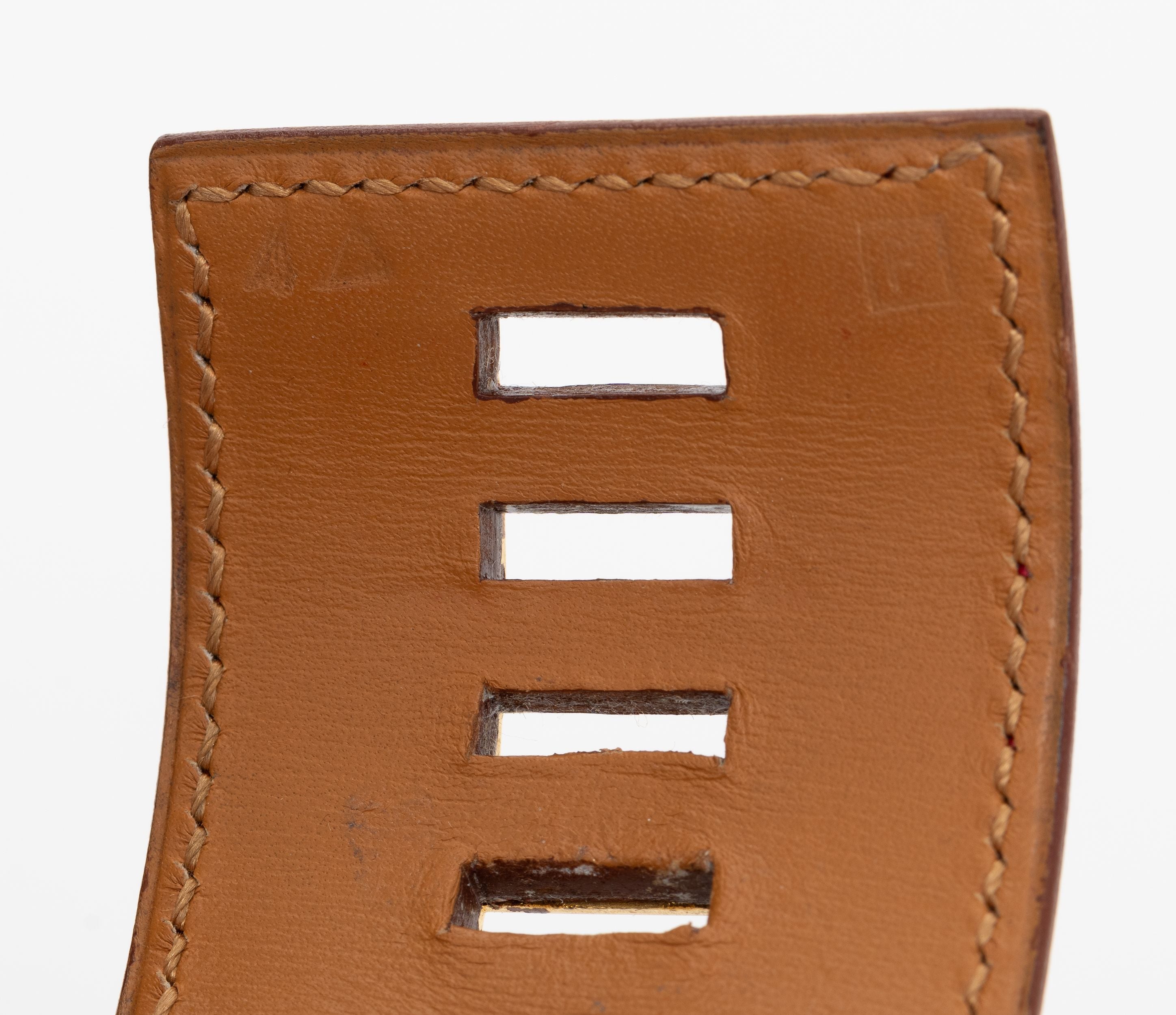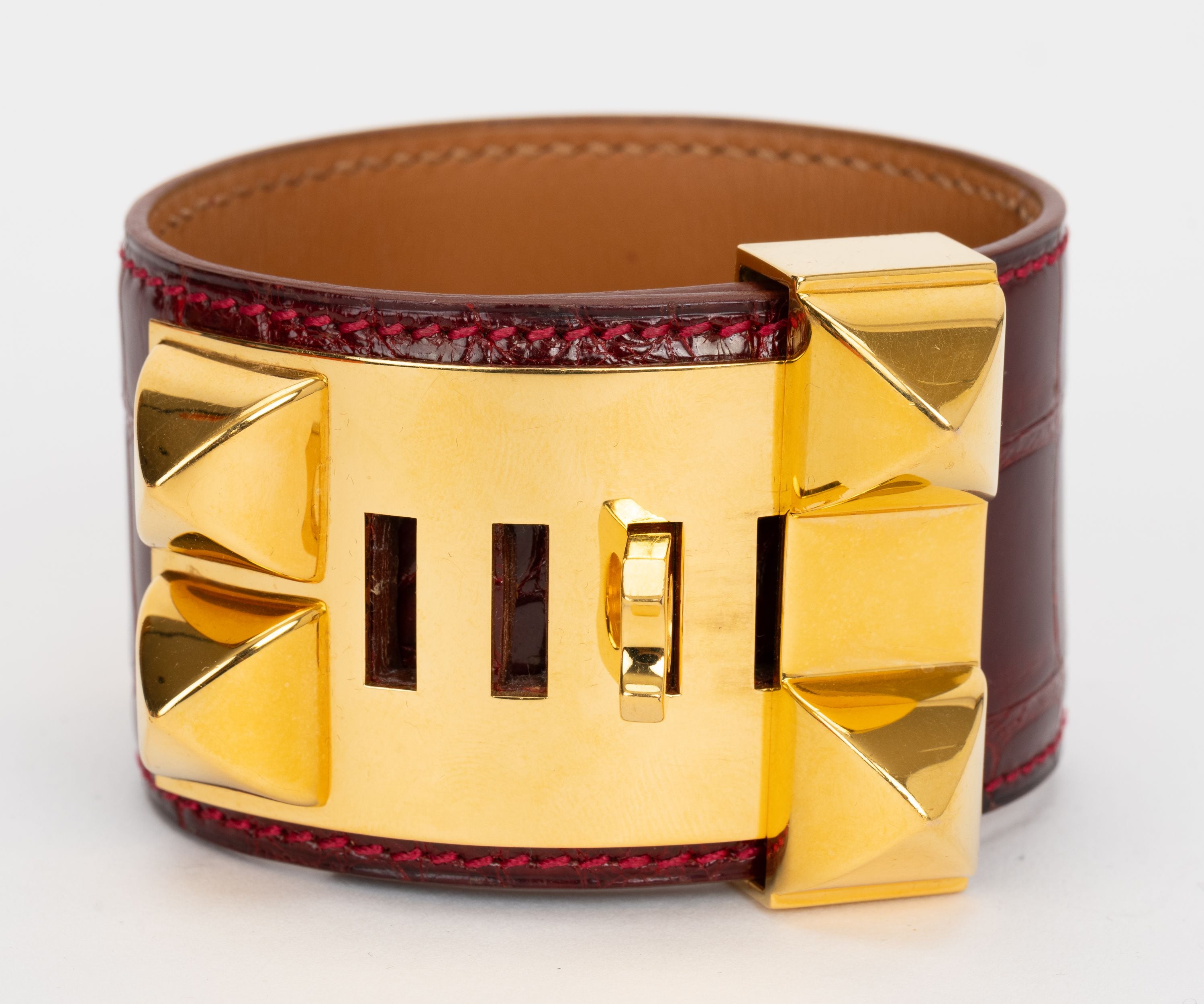 The Hermès Collier De Chien in burgundy red Alligator and gold tone hardware. Date stamp F. Comes with original dust cover and box.
