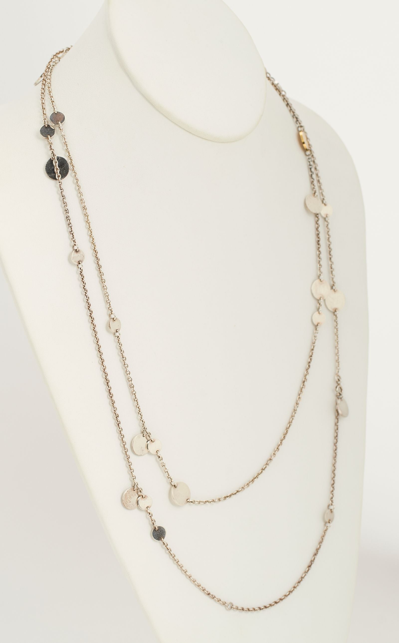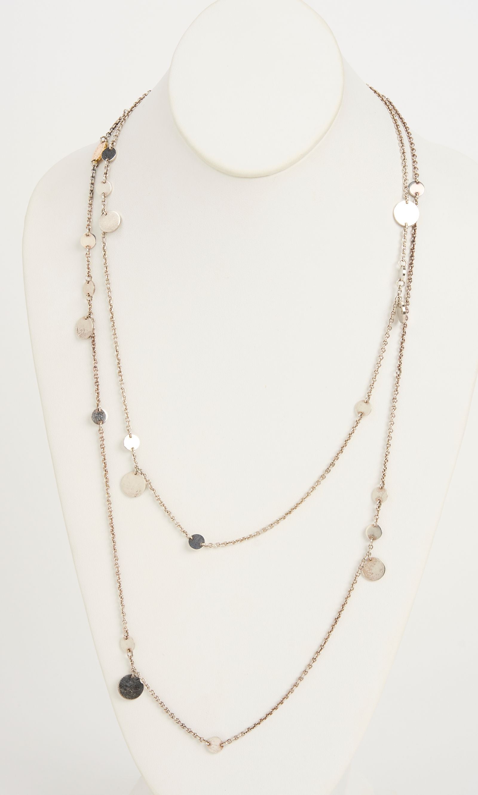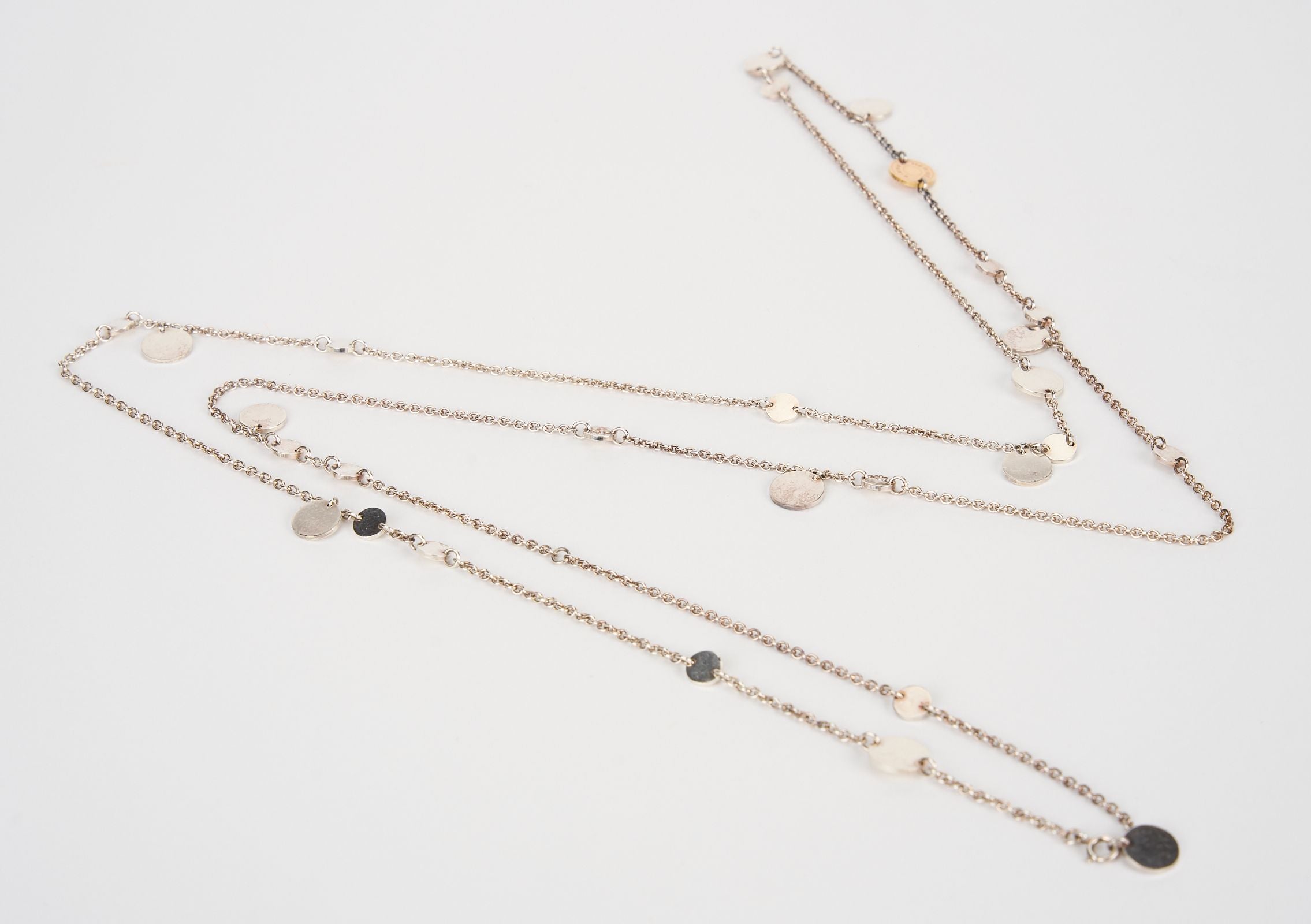 This necklace is done in Sterling Silver and 18k Rose Gold, featuring one 18k Rose Gold station disc and a lobster clasp closure. This necklace includes an Hermès jewelry box and a leather travel pouch.