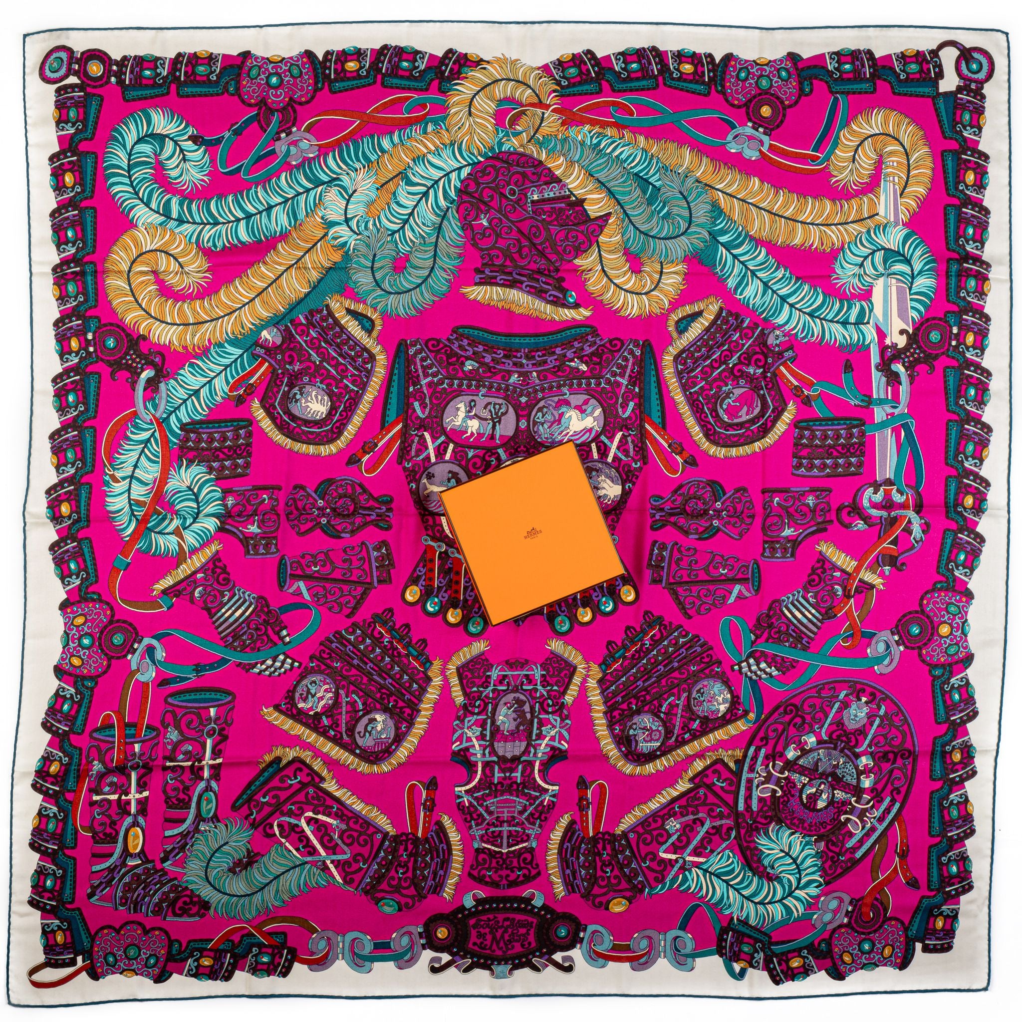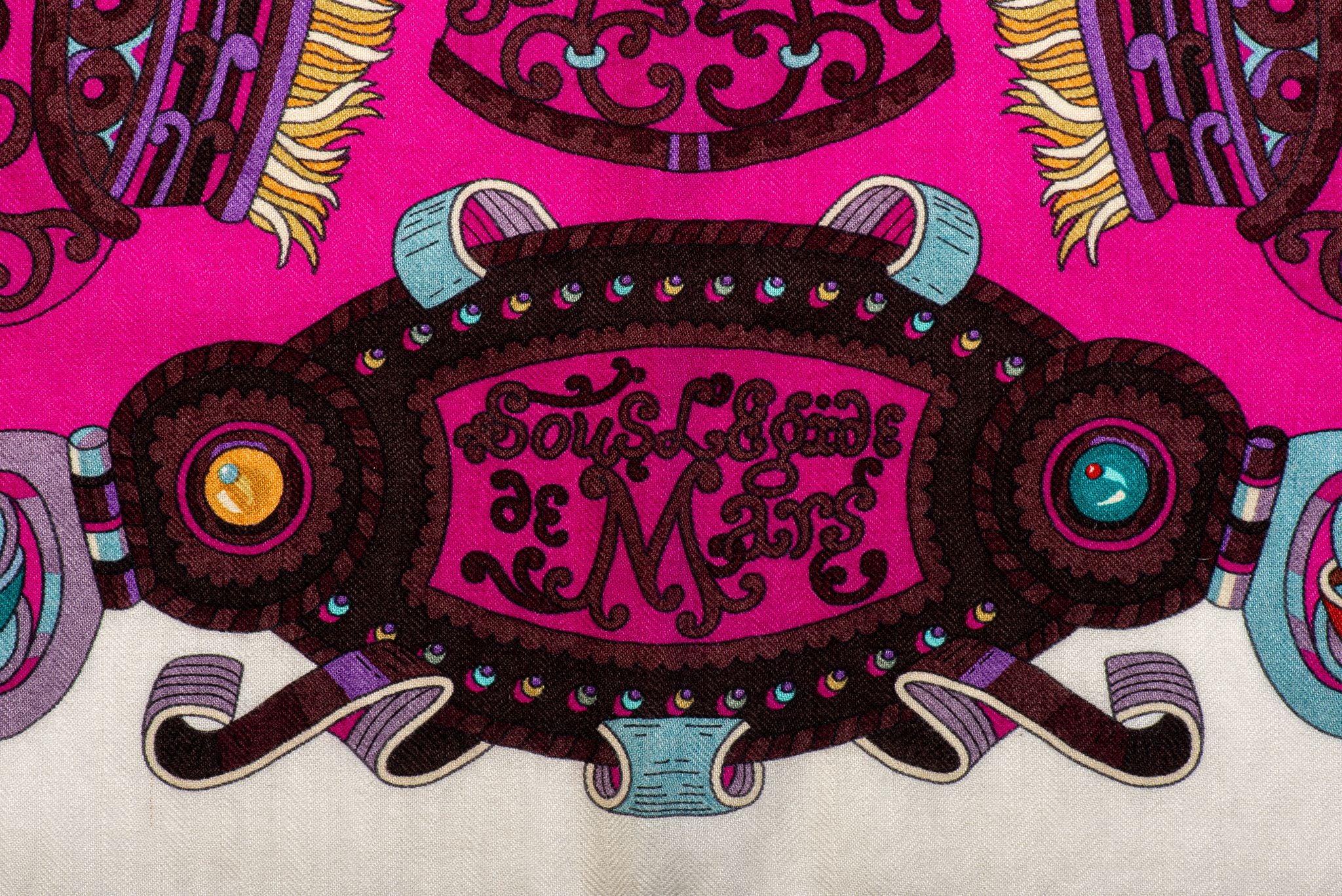 Hermès cashmere/silk blend oversize 54" square shawl Sous l’egide de mars. Comes with original box.