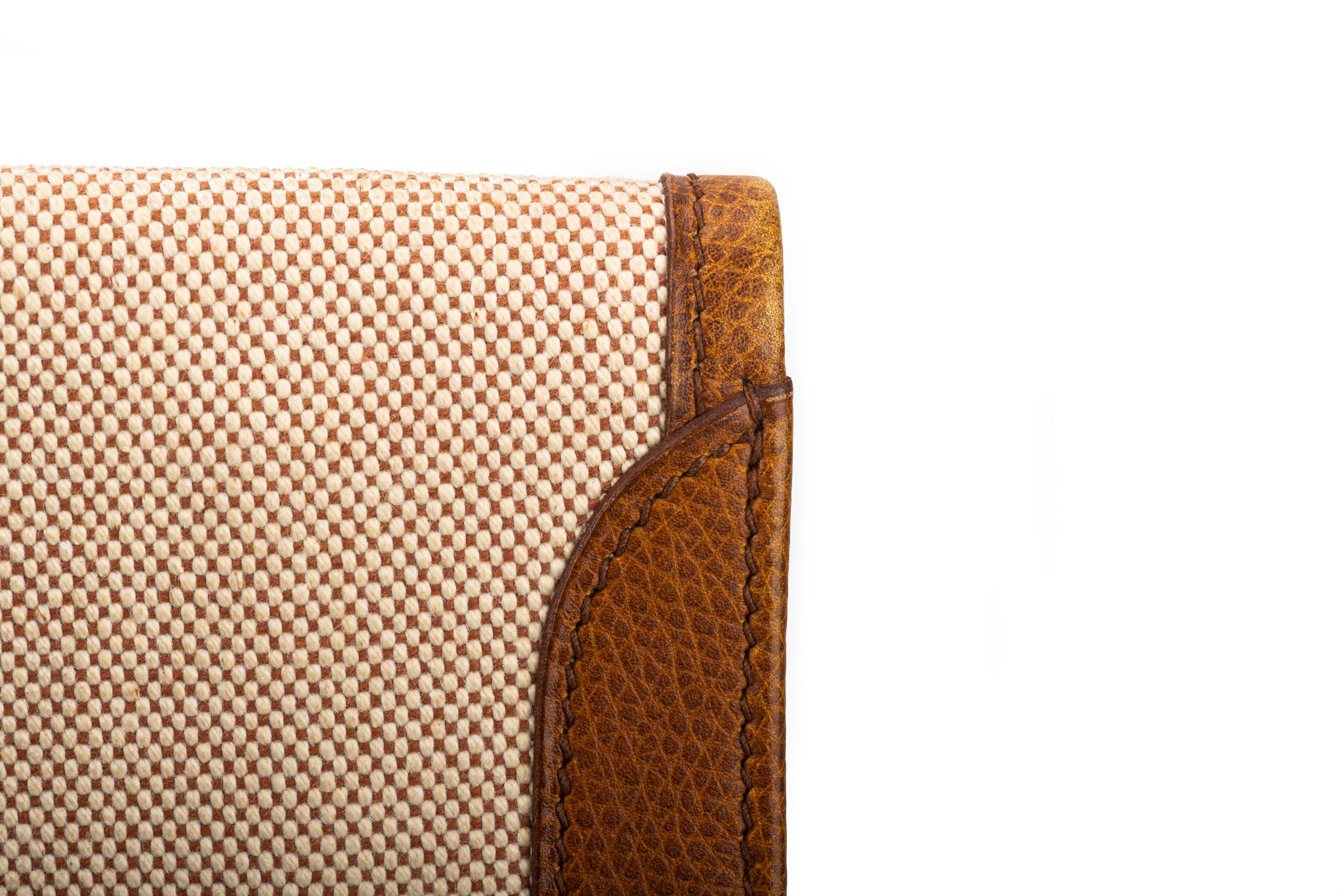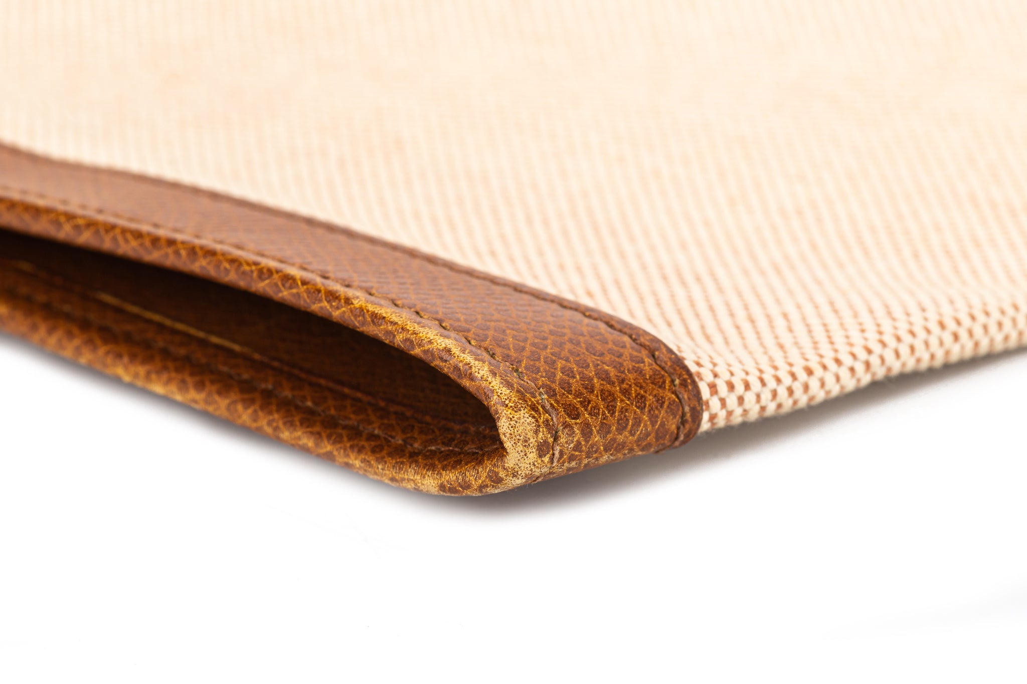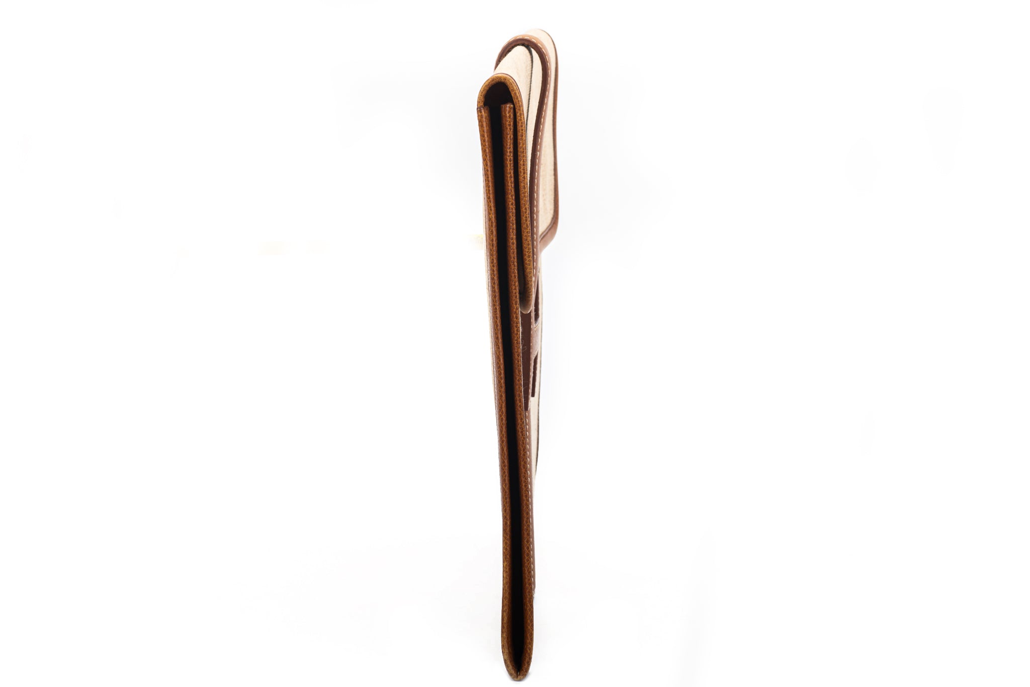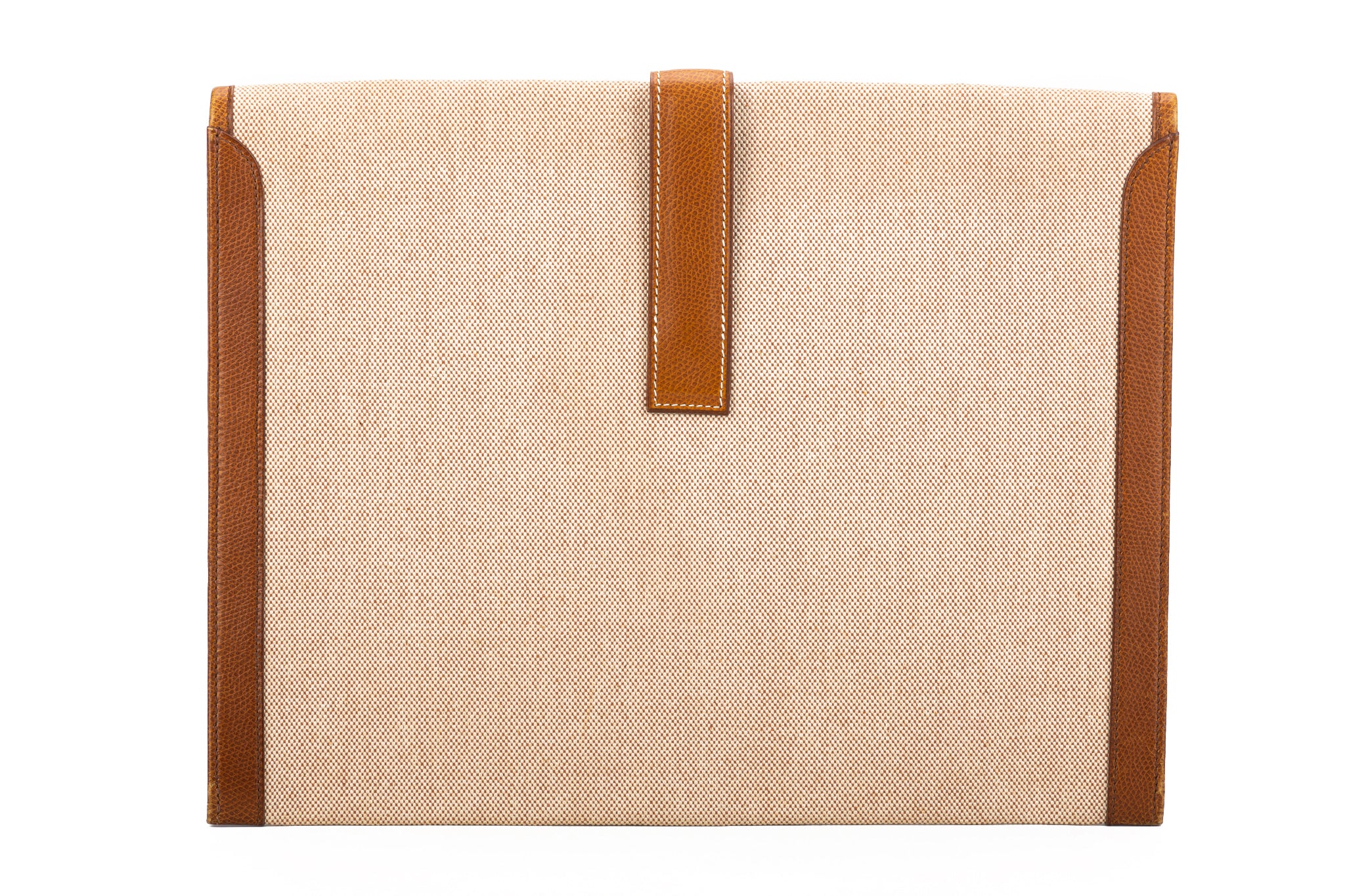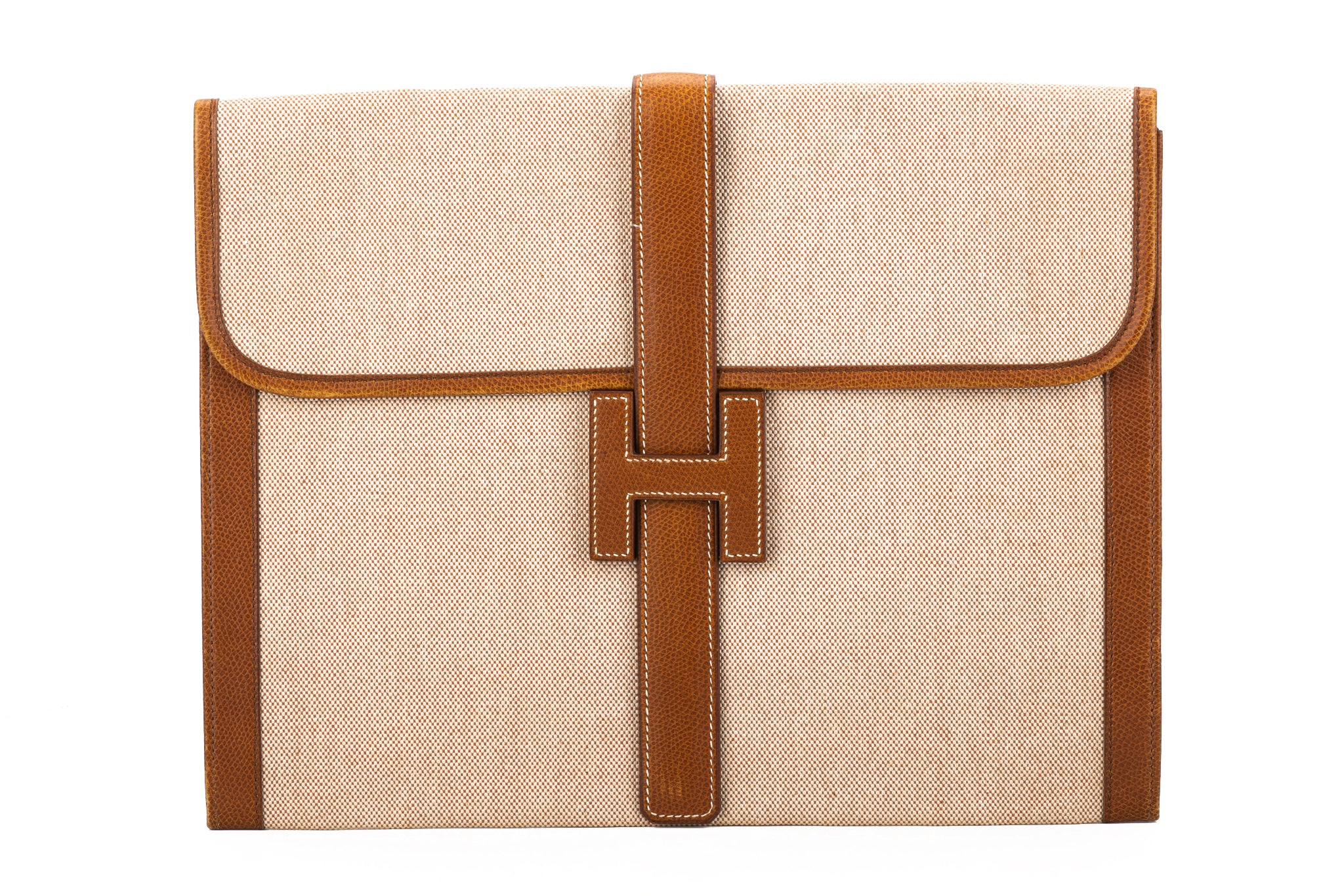 Hermès vintage large jige clutch, discontinued size. Natural toile and caramel epsom leather, minor wear on corners. No box, no dustcover.