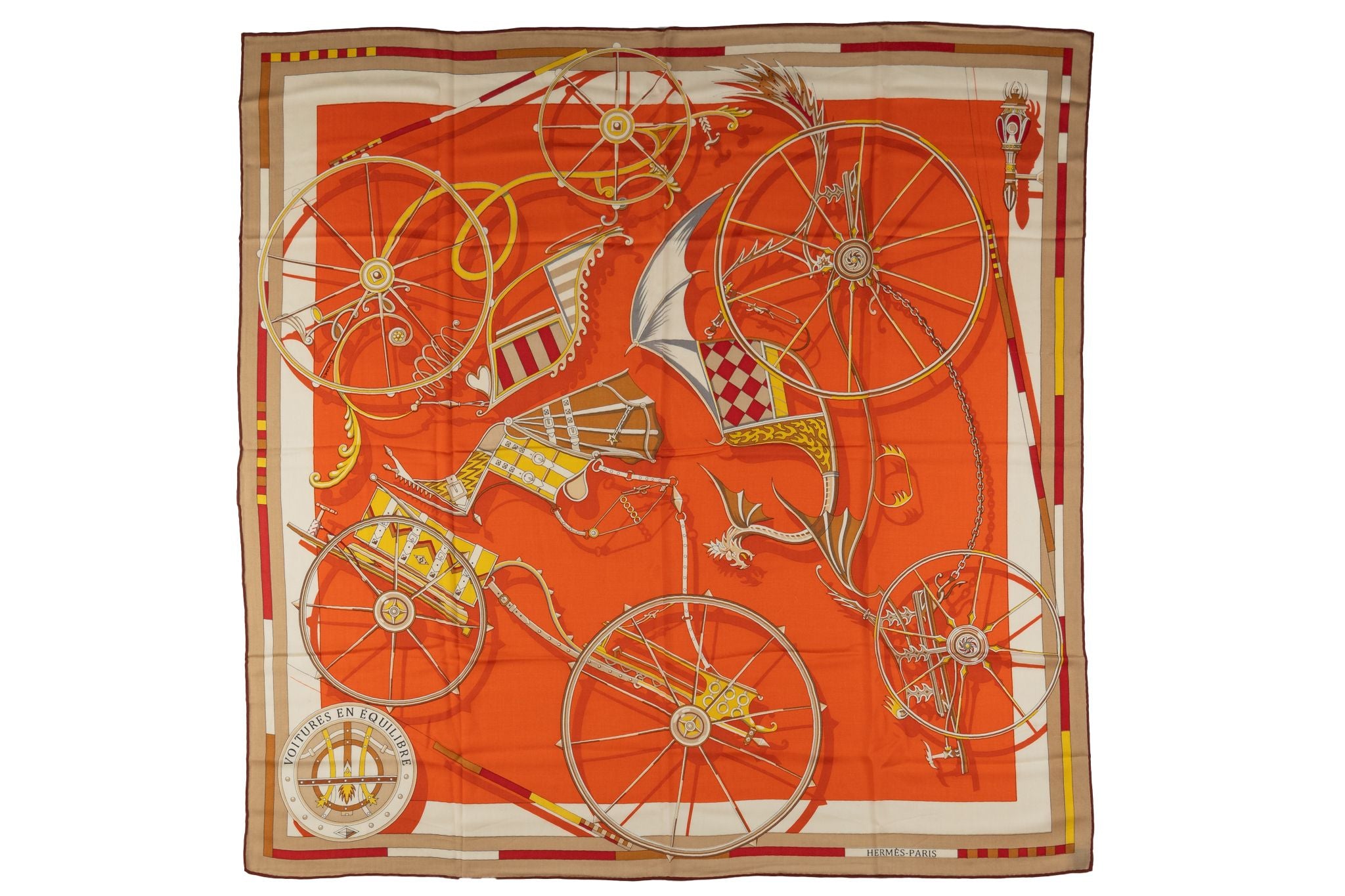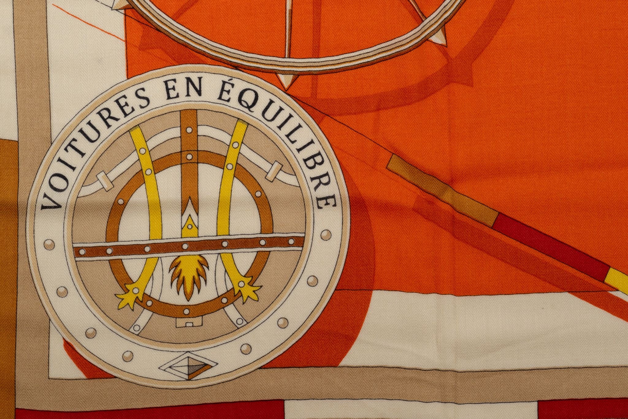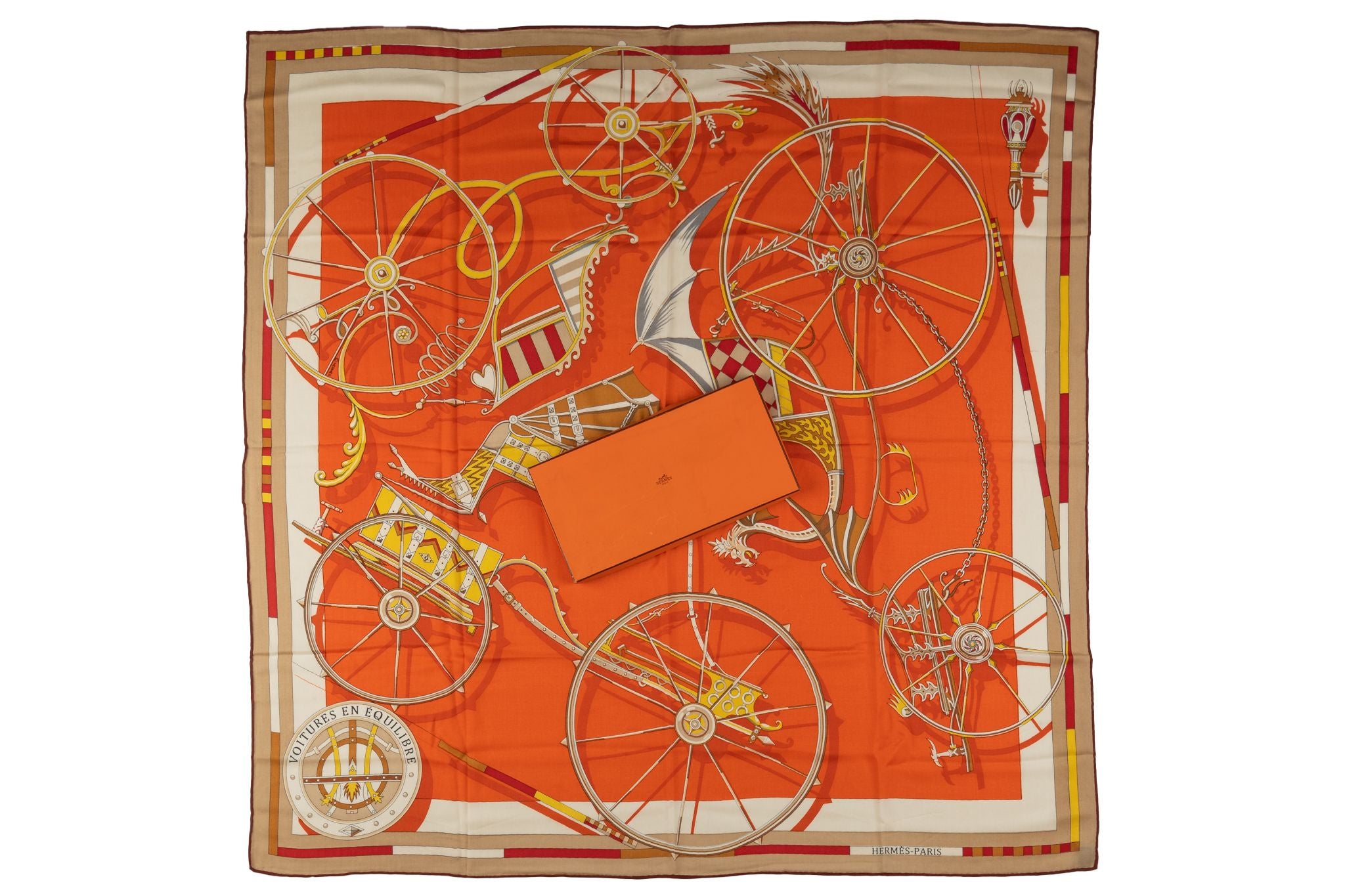 Hermès "Voitures En Equilibre" scarf in silk twill designed by Daiske Nomurawith. Features hand-rolled edges and is made in France. Whether it's in your hair, around your neck or on a bag, this scarf will instantly transforms your look. Comes with the original box, slightly damaged.