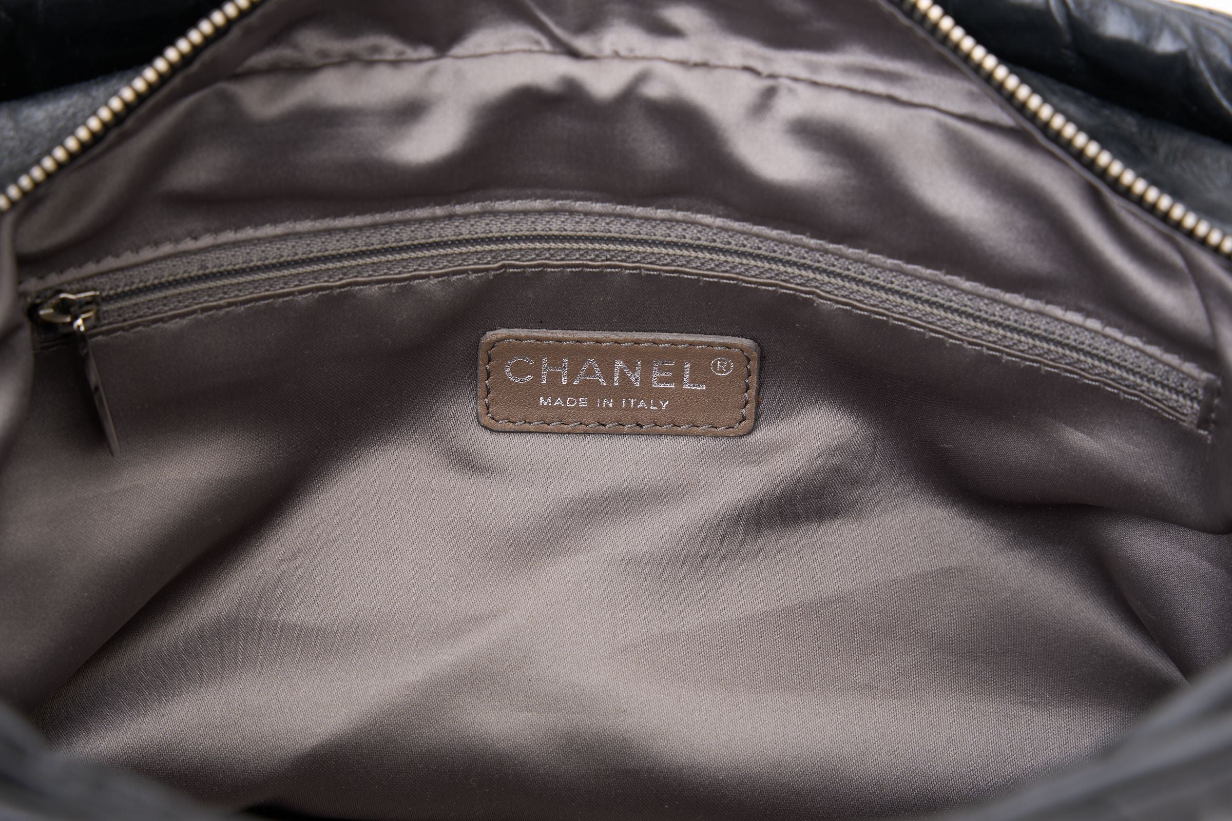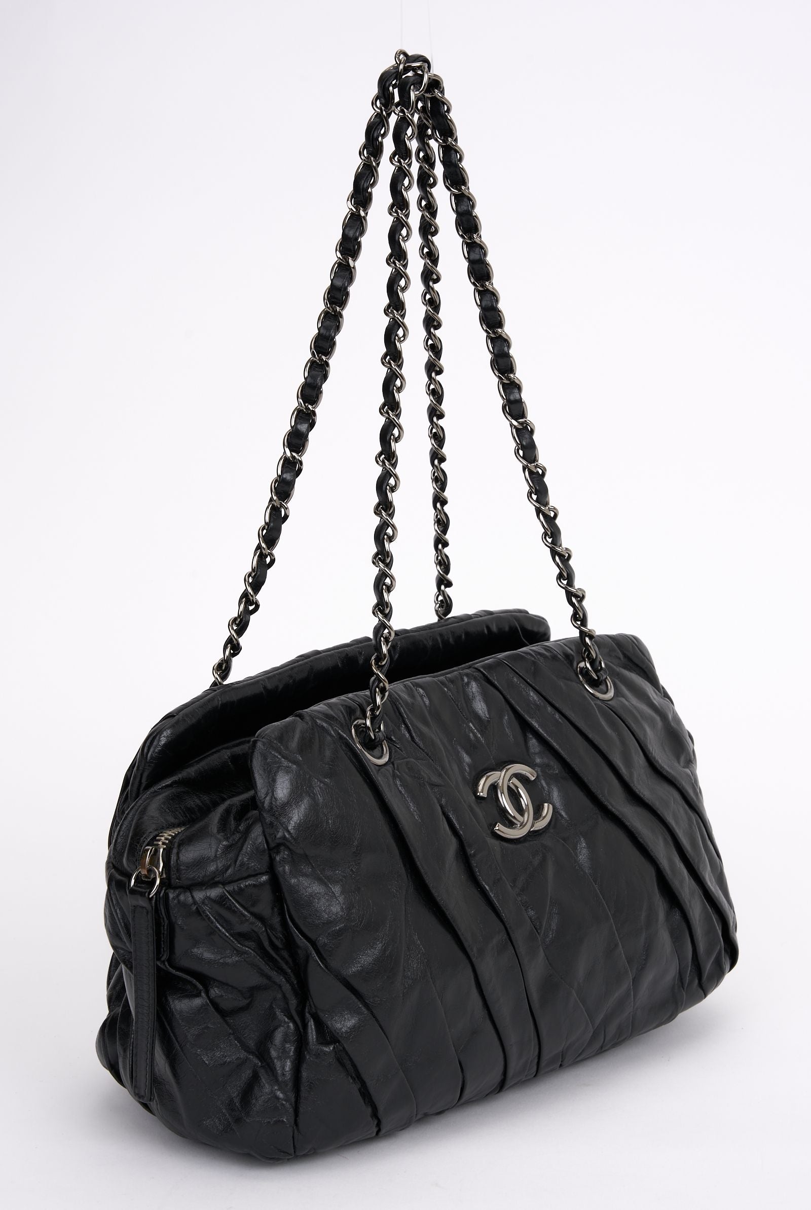 The Chanel Twisted Large Tote, features black glazed calfskin, silver hardware, dual chain-link shoulder straps, interlocking CC accent at the front, pleated accents at the exterior, three compartments; one with zip closure, grey satin lining, three pockets at the interior. A zip closure and open top. Comes with a dust cover and, Hologram. The first two numbers of hologram are 14. Strap drop - 9"