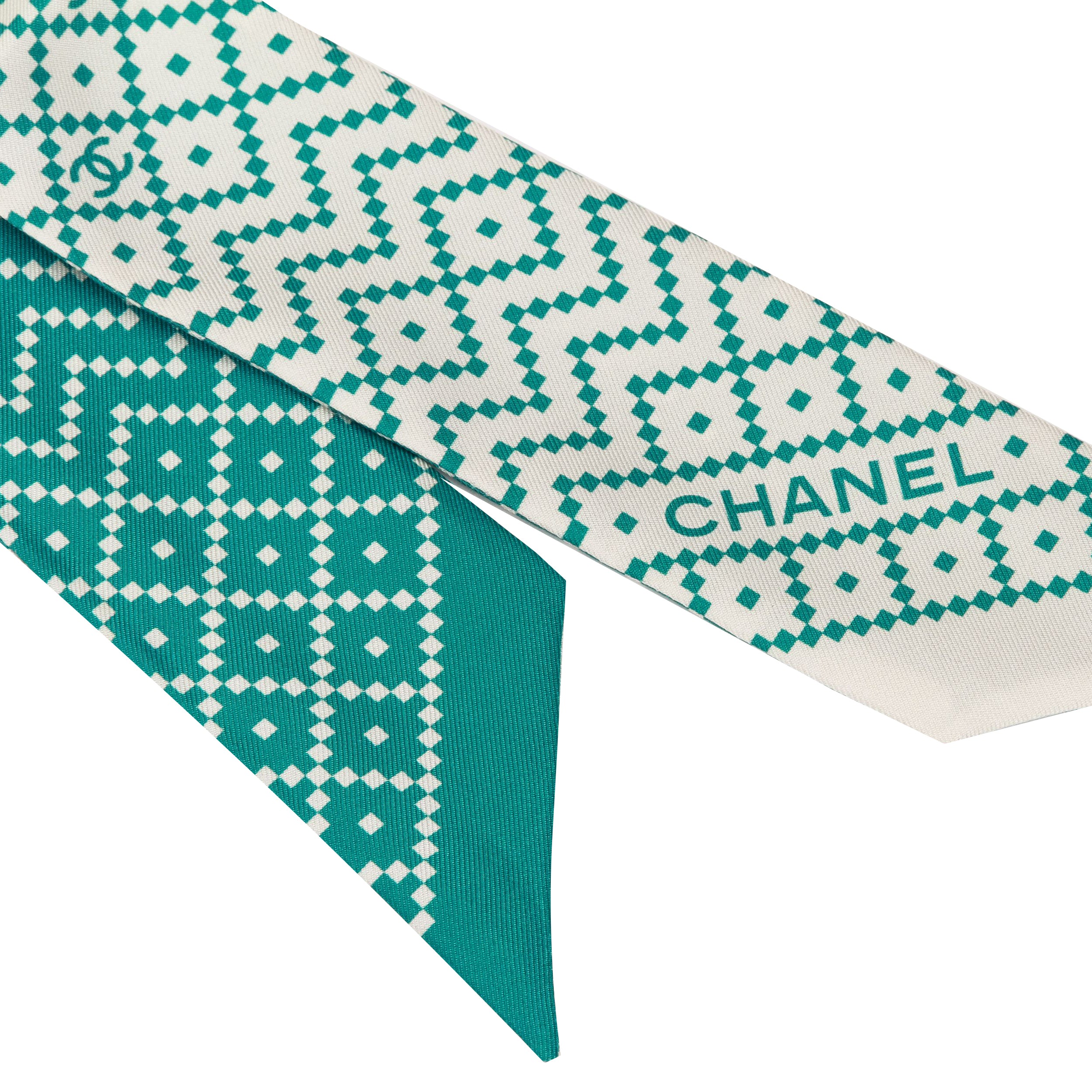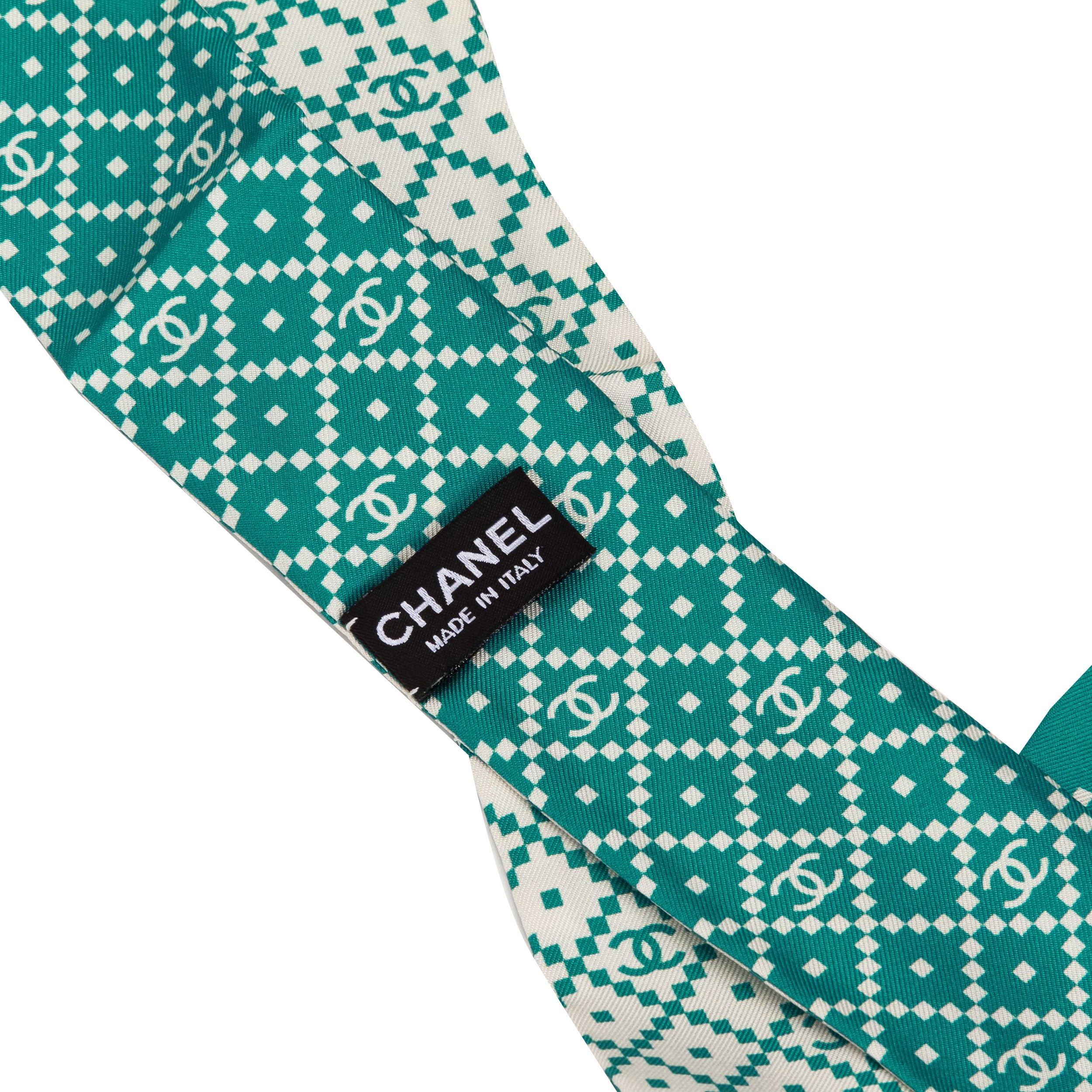 Chanel new green and white logo twilly (headband/scarf), 100%silk, 48" x 2"