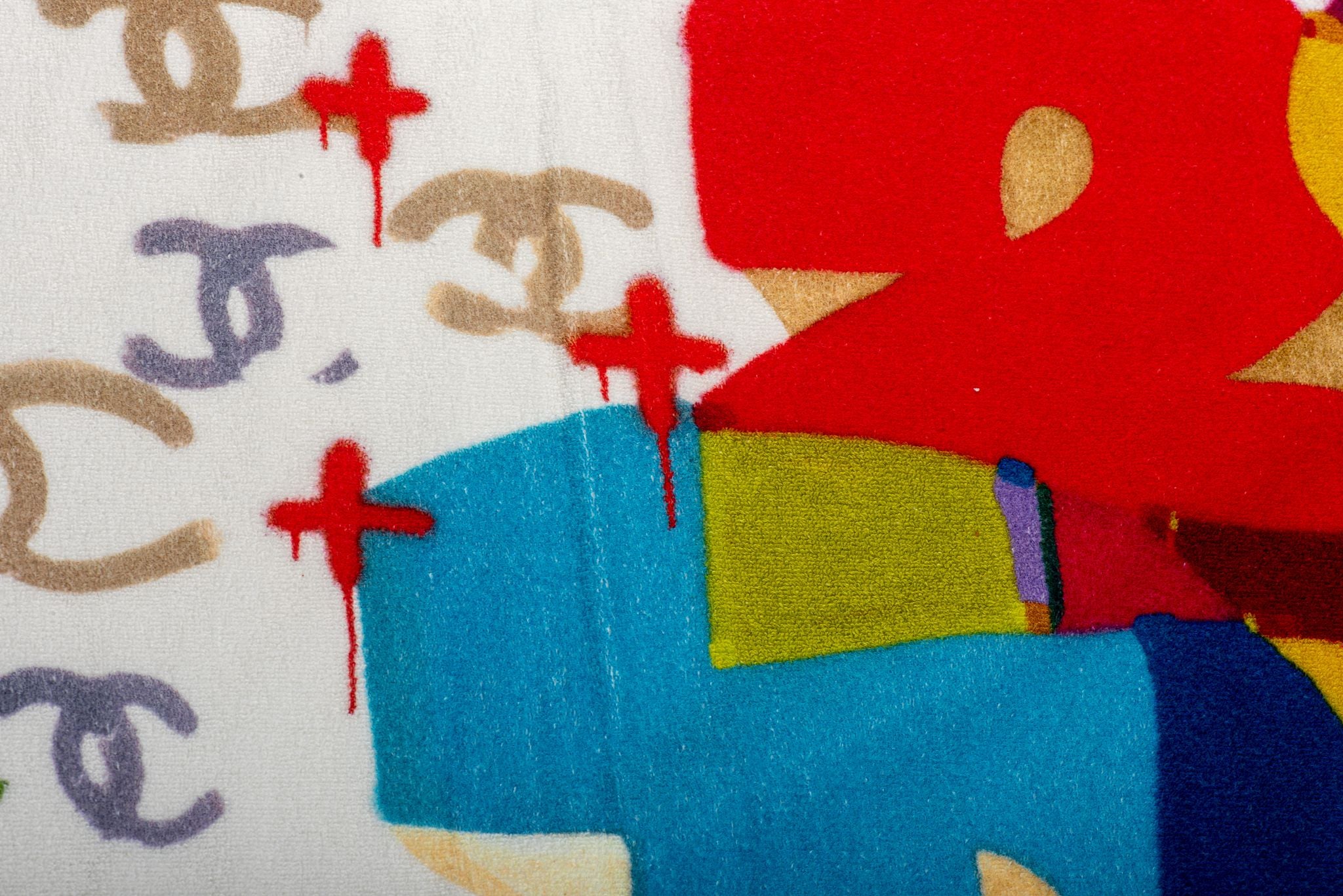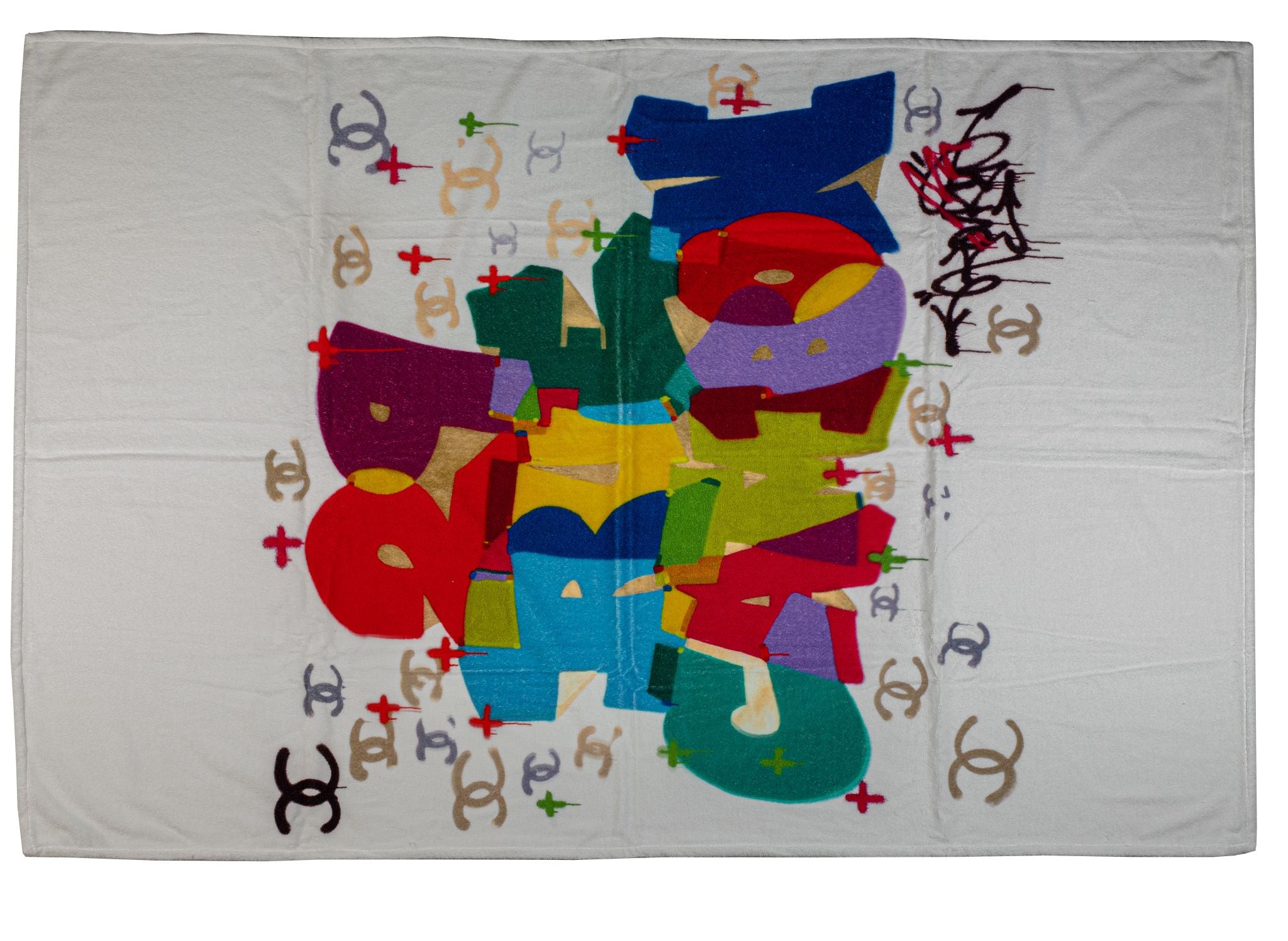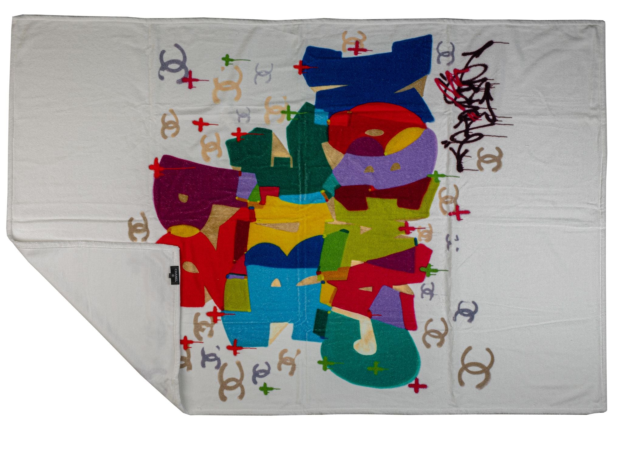 Chanel brand new oversize graffiti beach set. White with multicolor pattern, lined in white cotton. Terry cloth towel 70" x 48". Sometimes imperfections in the print might be visible.