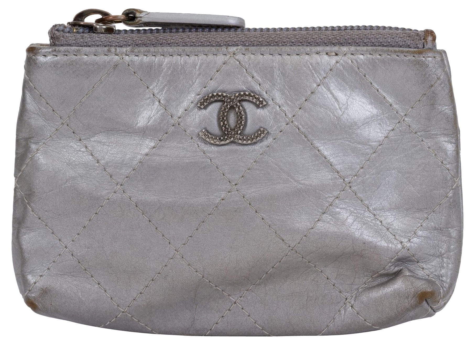 Chanel silver metallic flat quilted small pochette with keychain ring. Comes with original box. Wear on corners.
