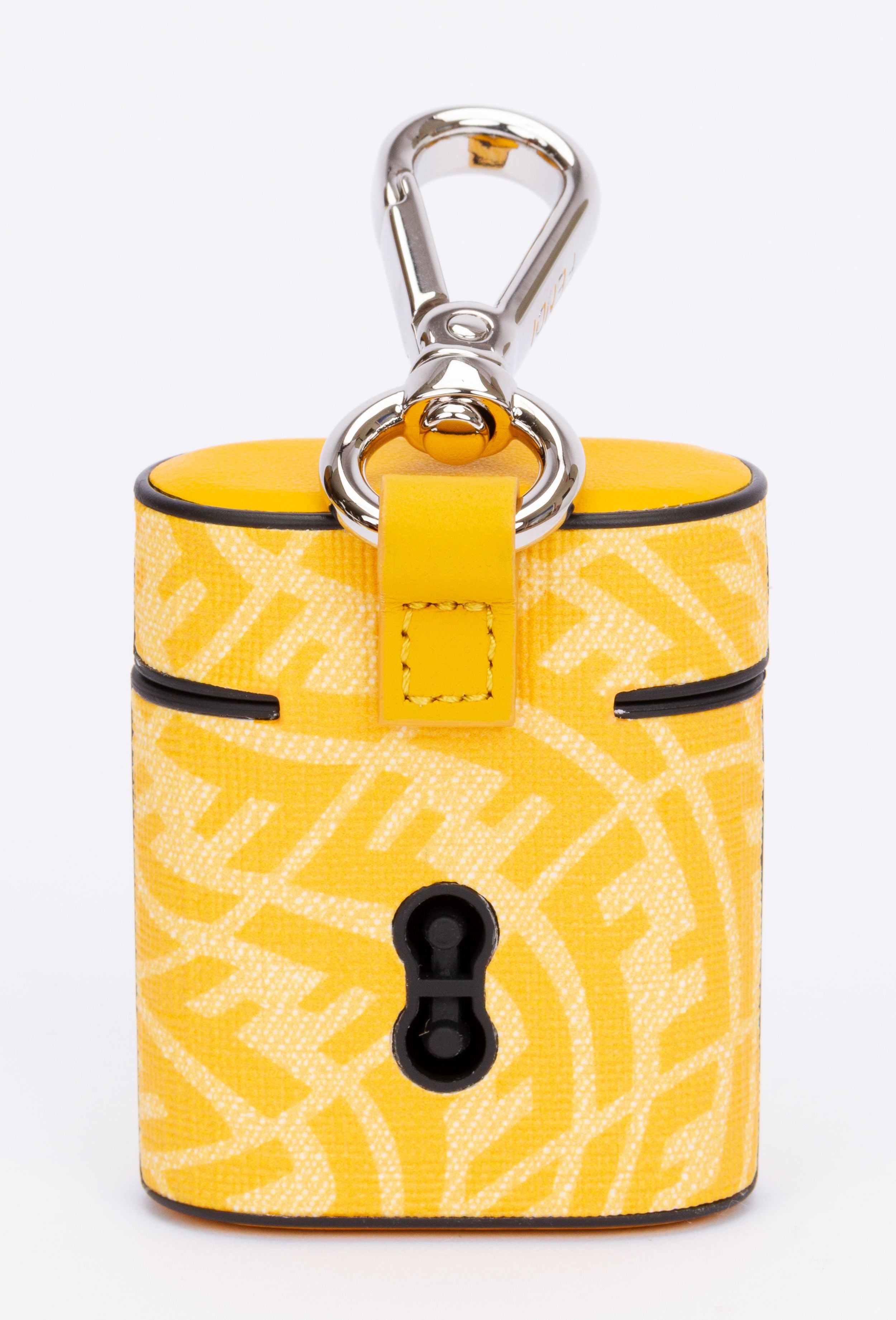 Fendi air pods charm to attach to a bag. This piece can clip on all different sizes of bags. It has a zip so it's perfect to store stuff. The charm comes in a vibrant vertigo yellow print. It is brand new and comes with the booklet, original box and dust cover