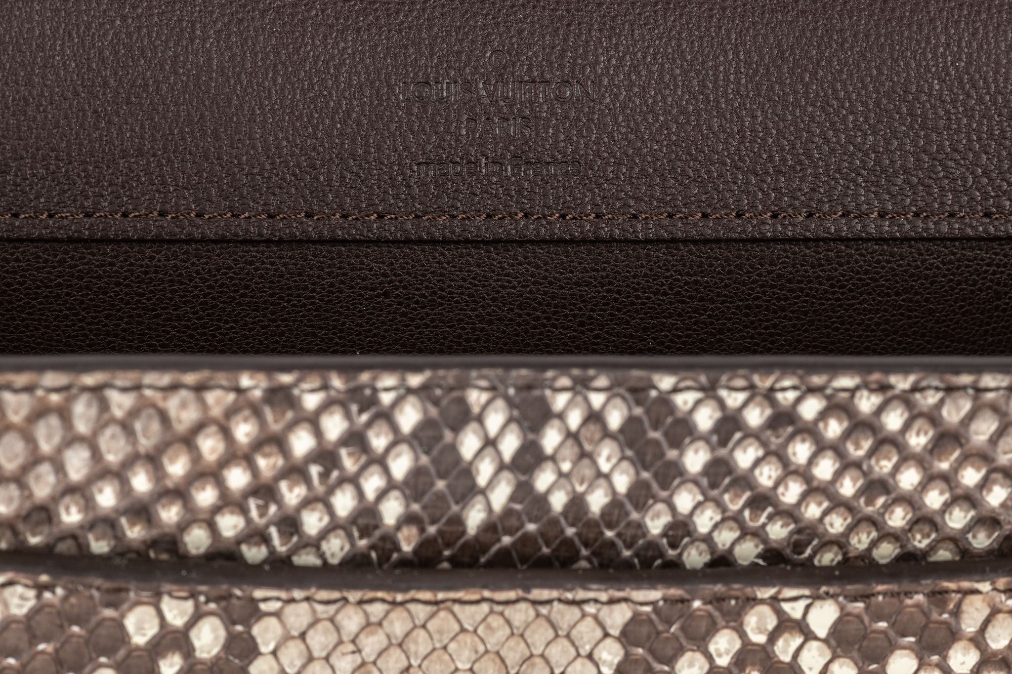 This bag is done in natural Python with gold hardware, featuring a chain shoulder strap (drop 15") and a flap top with a flip clasp closure. The interior is done in dark brown leather, featuring one front slip pocket, one zip pocket, and six card slots. There is moderate scratching to the hardware, and lifting to the python scales throughout. Comes with original box and certificate of authenticity. Due to wildlife regulation, this bag does not ship to California.