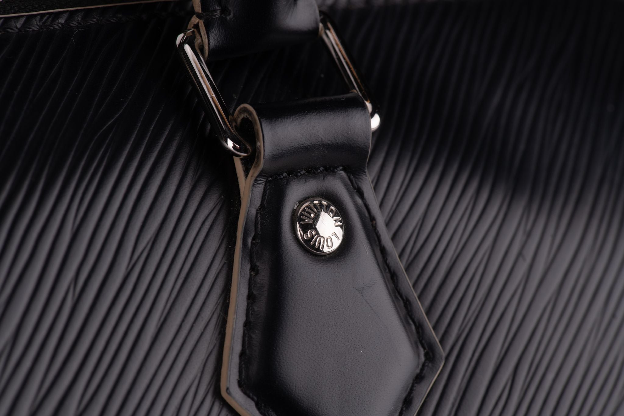This Louis Vuitton Epi World Tour Speedy 30 in Black. This stylish tote is finely crafted of Louis Vuitton's signature textured epi leather in black, with travel patches embossed throughout. This bag features rolled leather top handles and polished silver hardware. The top zipper opens to a black microfiber interior with a patch pocket. Comes with original dust cover.