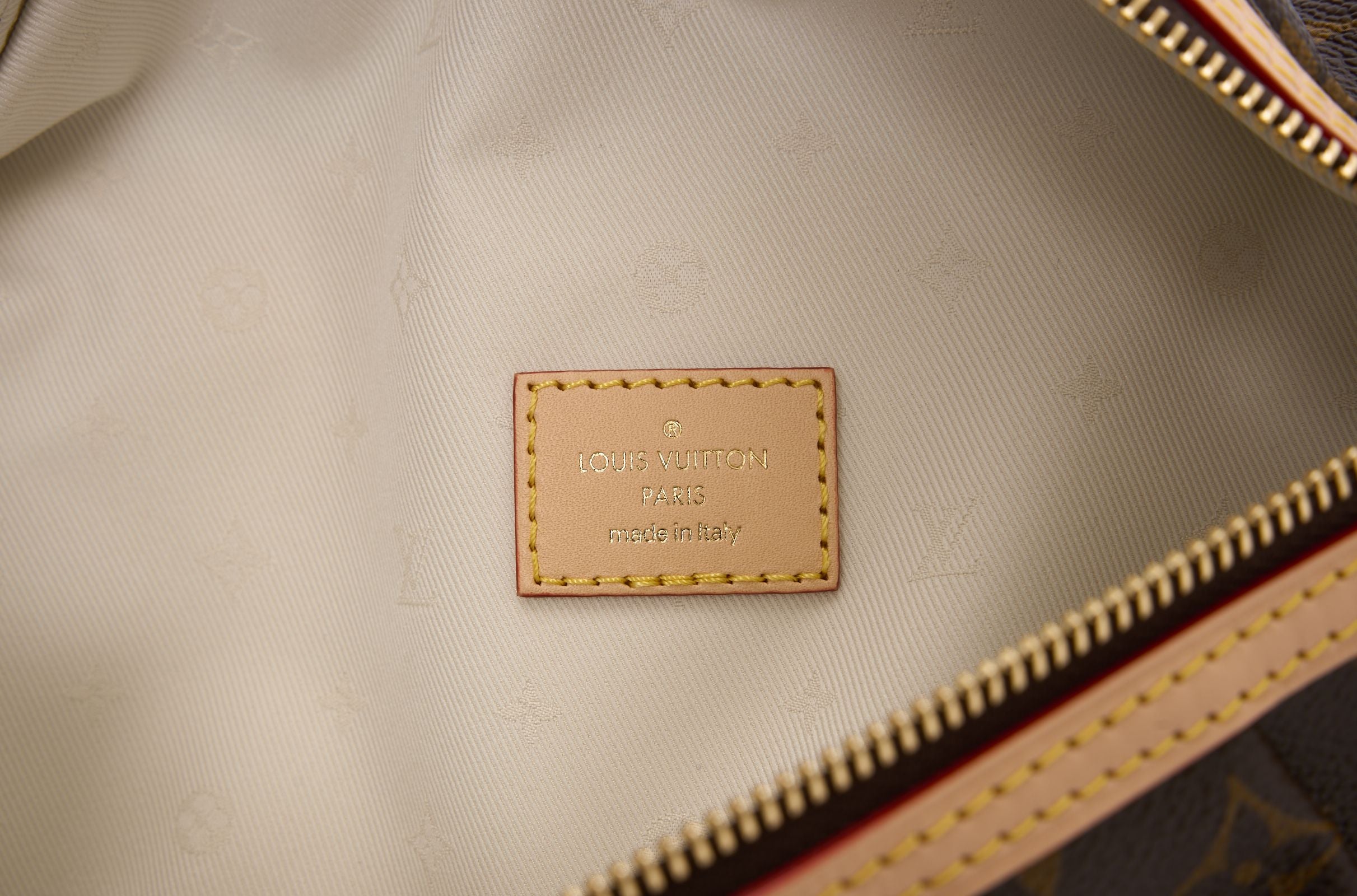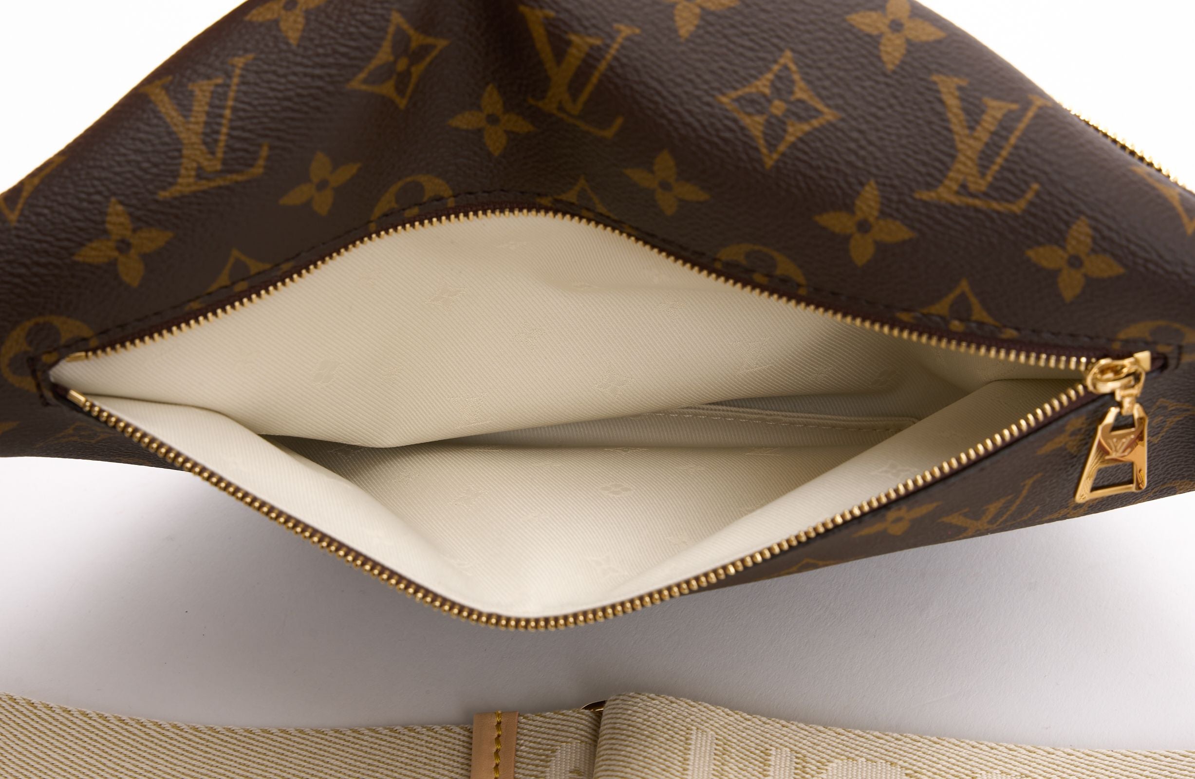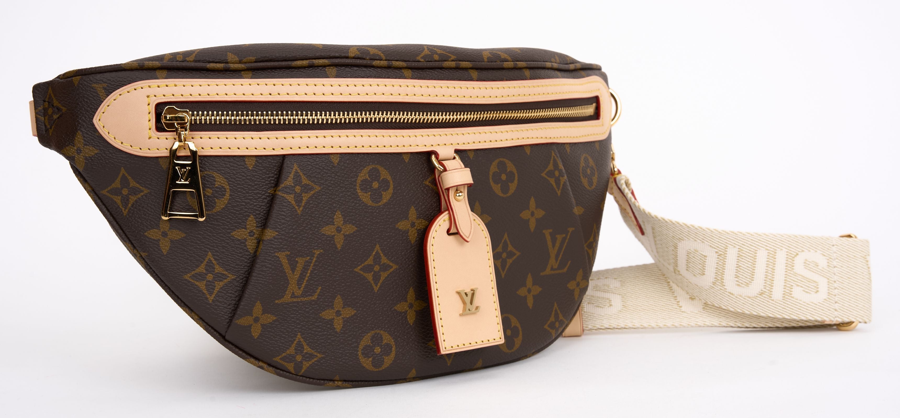 This Louis Vuitton Monogram High Rise Bumbag. This belt bag is crafted of Louis Vuitton monogram coated canvas features leather accents including zipper tape and a removable luggage tag. The bag features a front zipper pocket, a rear zipper pocket, and an adjustable beige fabric strap stitched with "Louis Vuitton". The main zipper opens to a white monogram fabric interior. Brand new with original box.
