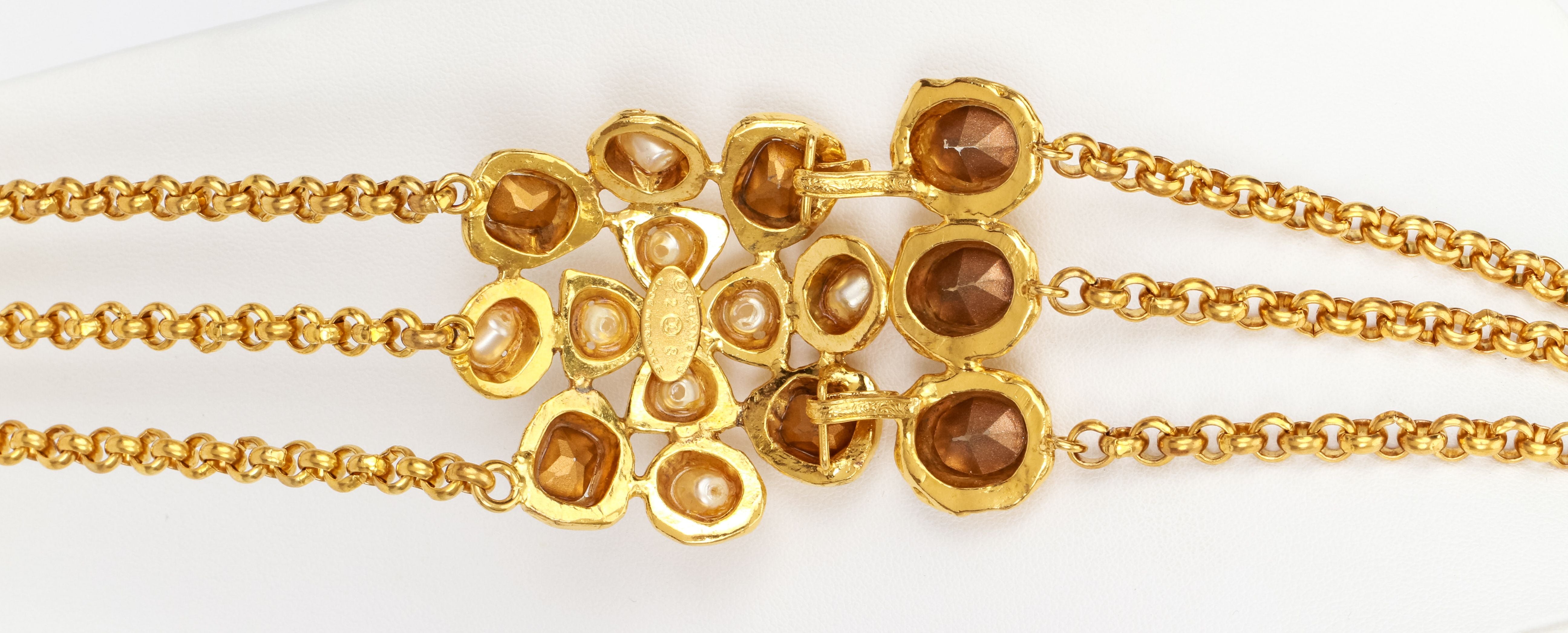 Chanel gold necklace with three chains and elaborate decorative clasp featuring cross with pearls surrounded by oval cut stones, all in abstract shape gold bezel settings. comes with original pouch.