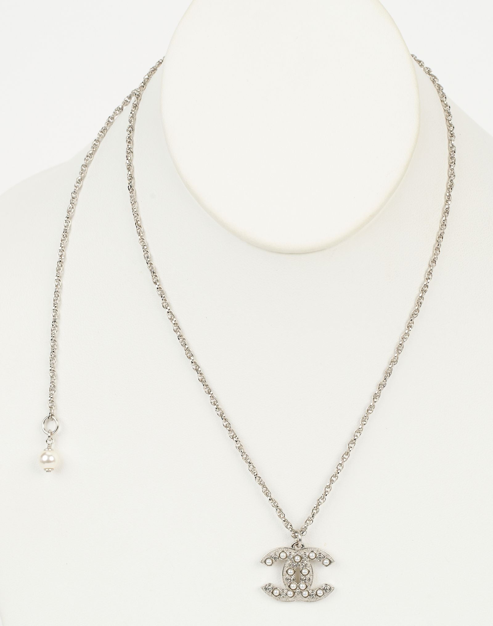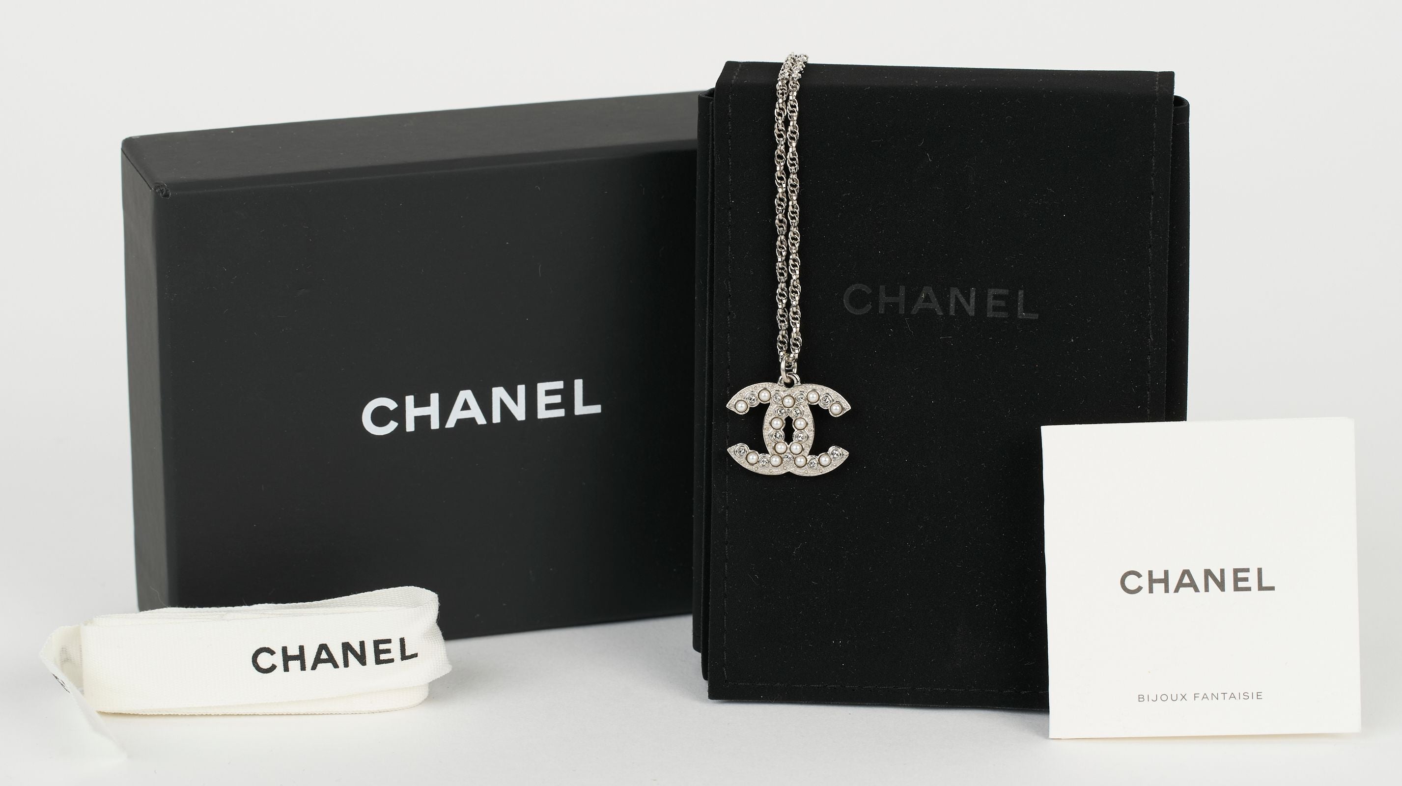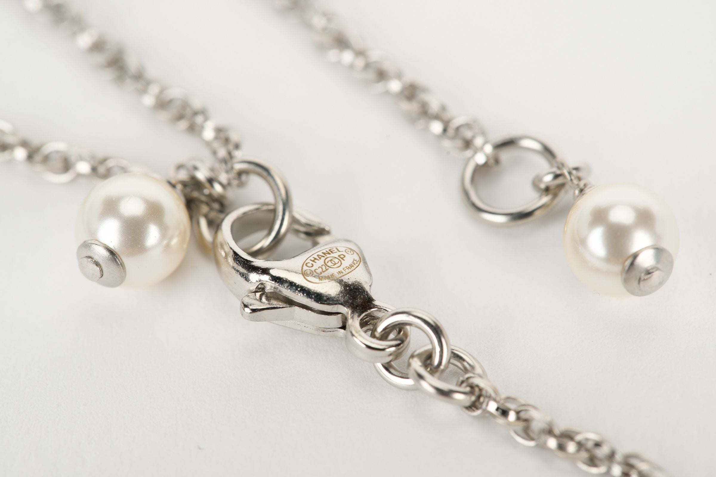 Chanel new in box delicate silver tone necklace with cc pearls pendant and back drop pearl. Maximum length 23.5. Comes with booklet and and ribbon.