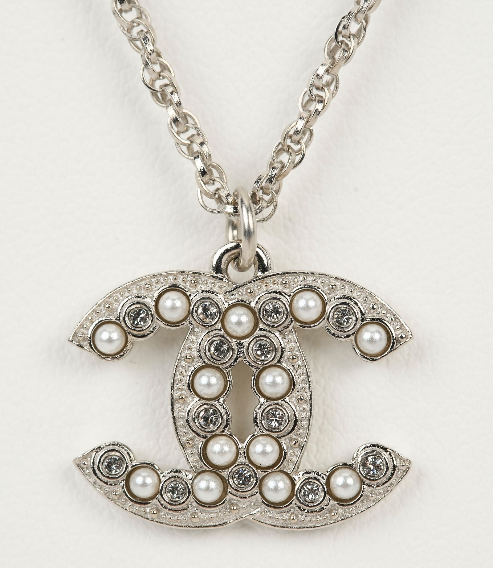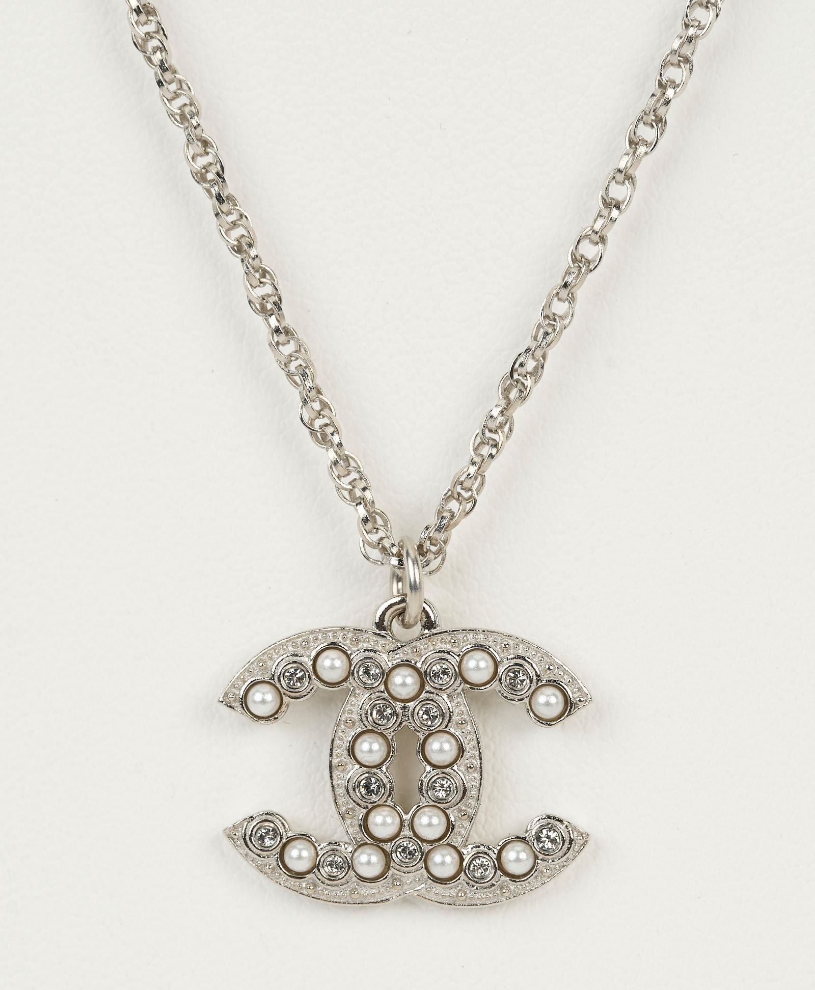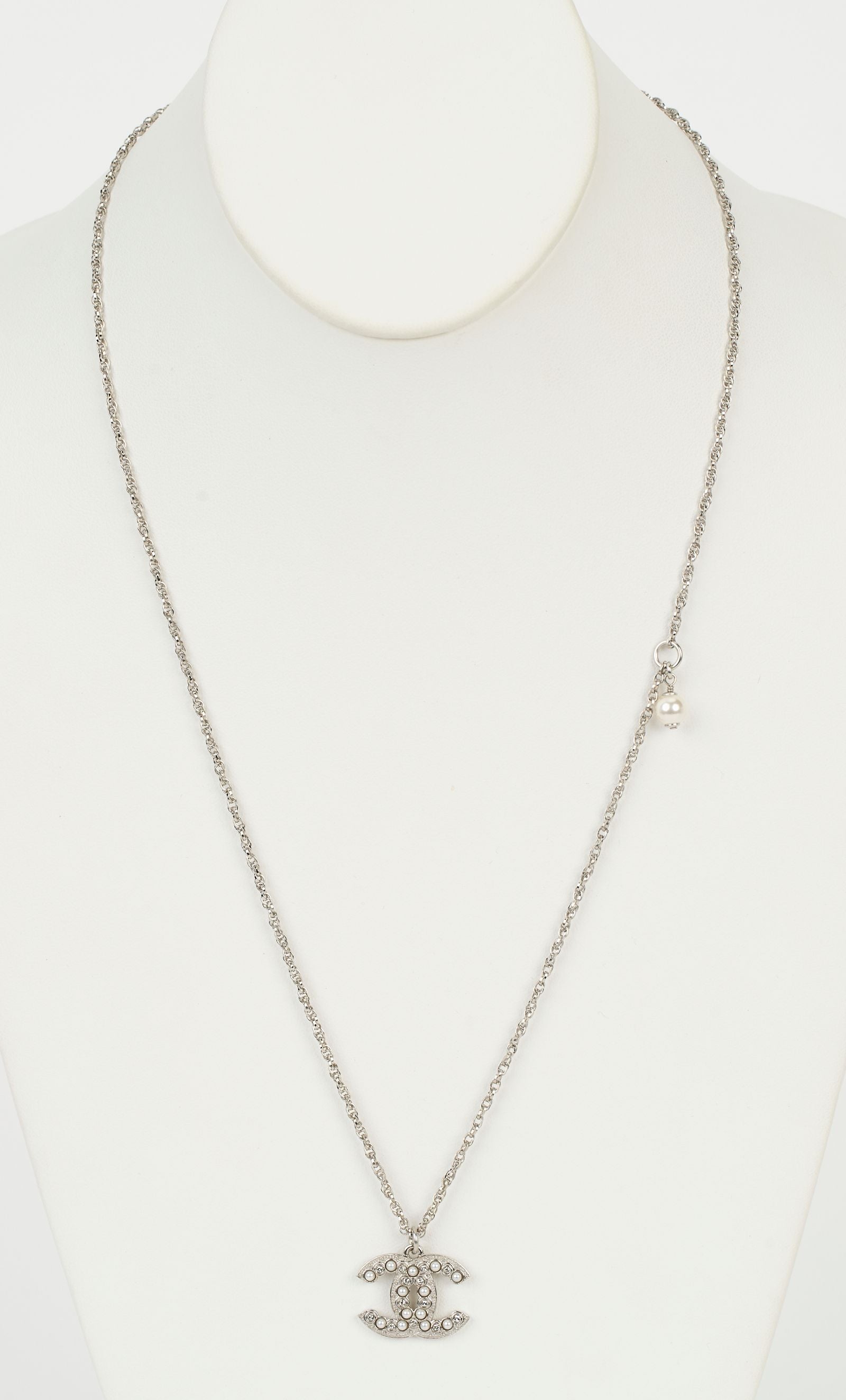 Chanel new in box delicate silver tone necklace with cc pearls pendant and back drop pearl. Maximum length 23.5. Comes with booklet and and ribbon.