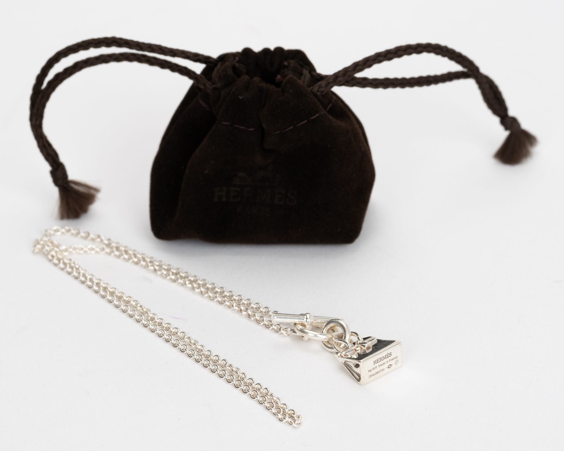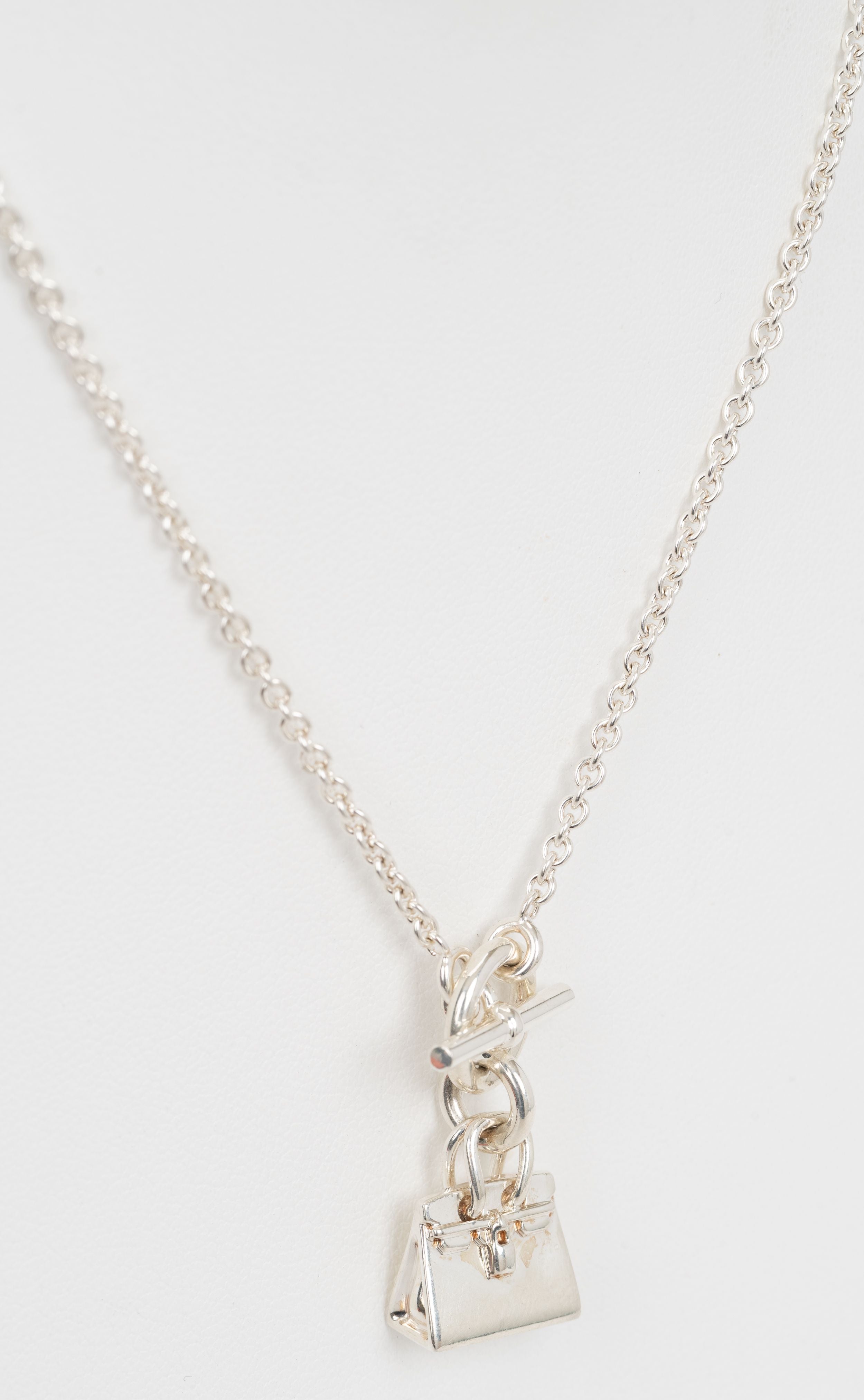 Hermes Kelly Amulette Pendant Necklace features a kelly Pendant 5/8" x 5/8" and chain length of 17.5" Sterling silver. Comes with original velvet pouch.