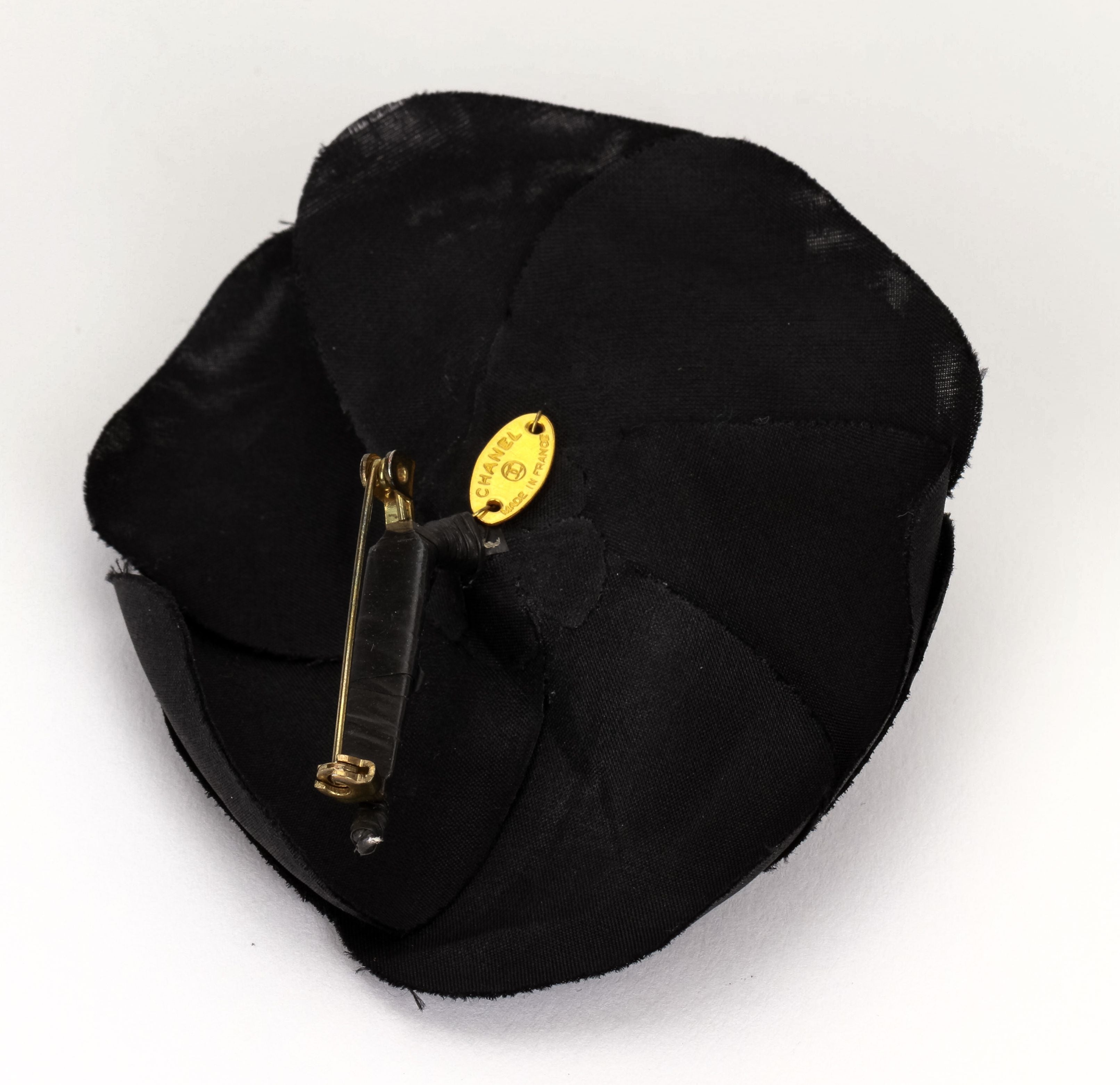 Chanel large black fabric camellia brooch, 3.5" diameter. Comes with velvet pouch.