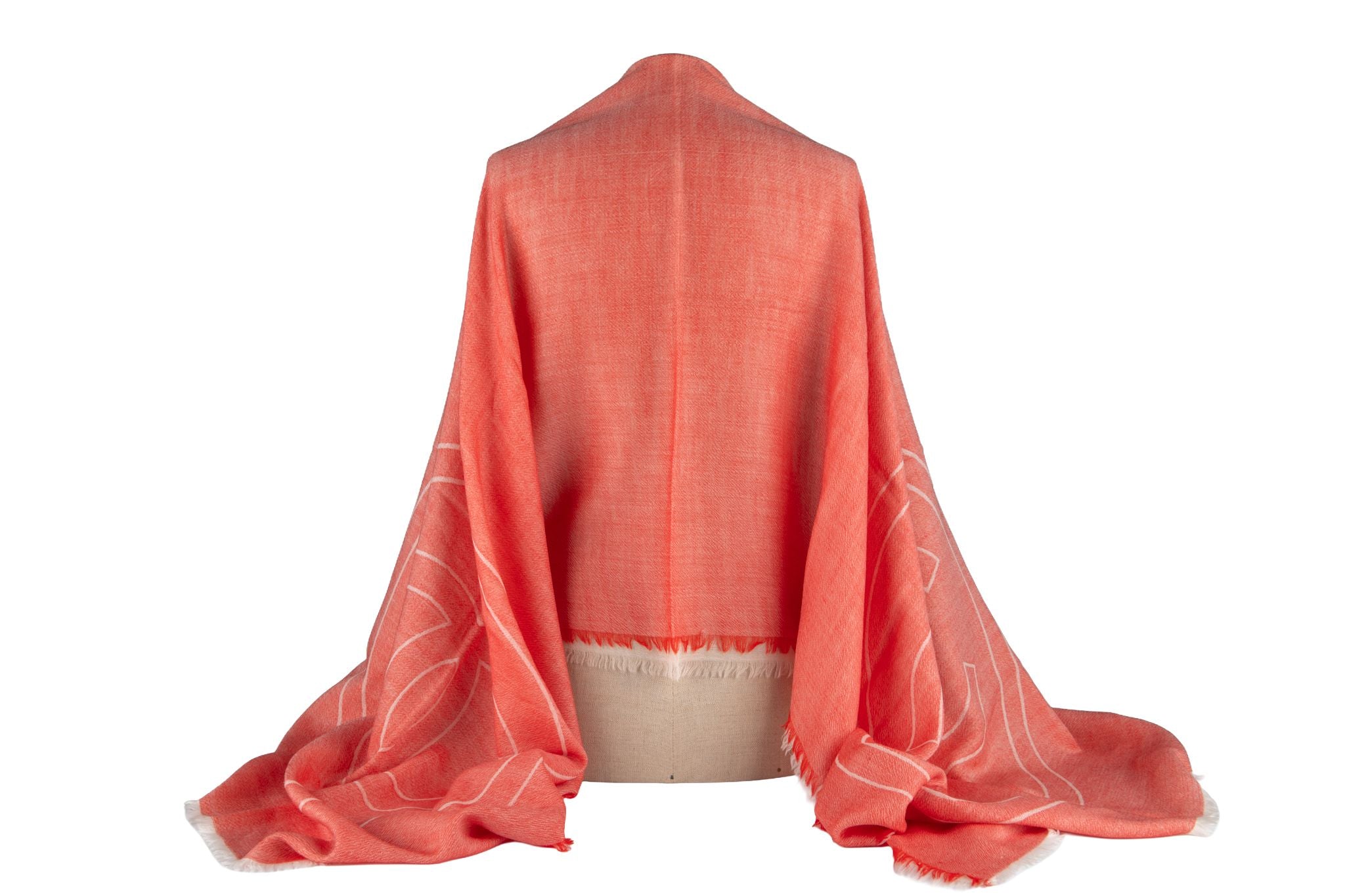 This Chanel CC Logo Cashmere Shawl is in a beautiful coral red with a CC logo cream accent. Lightweight and measuring 78" x 28".