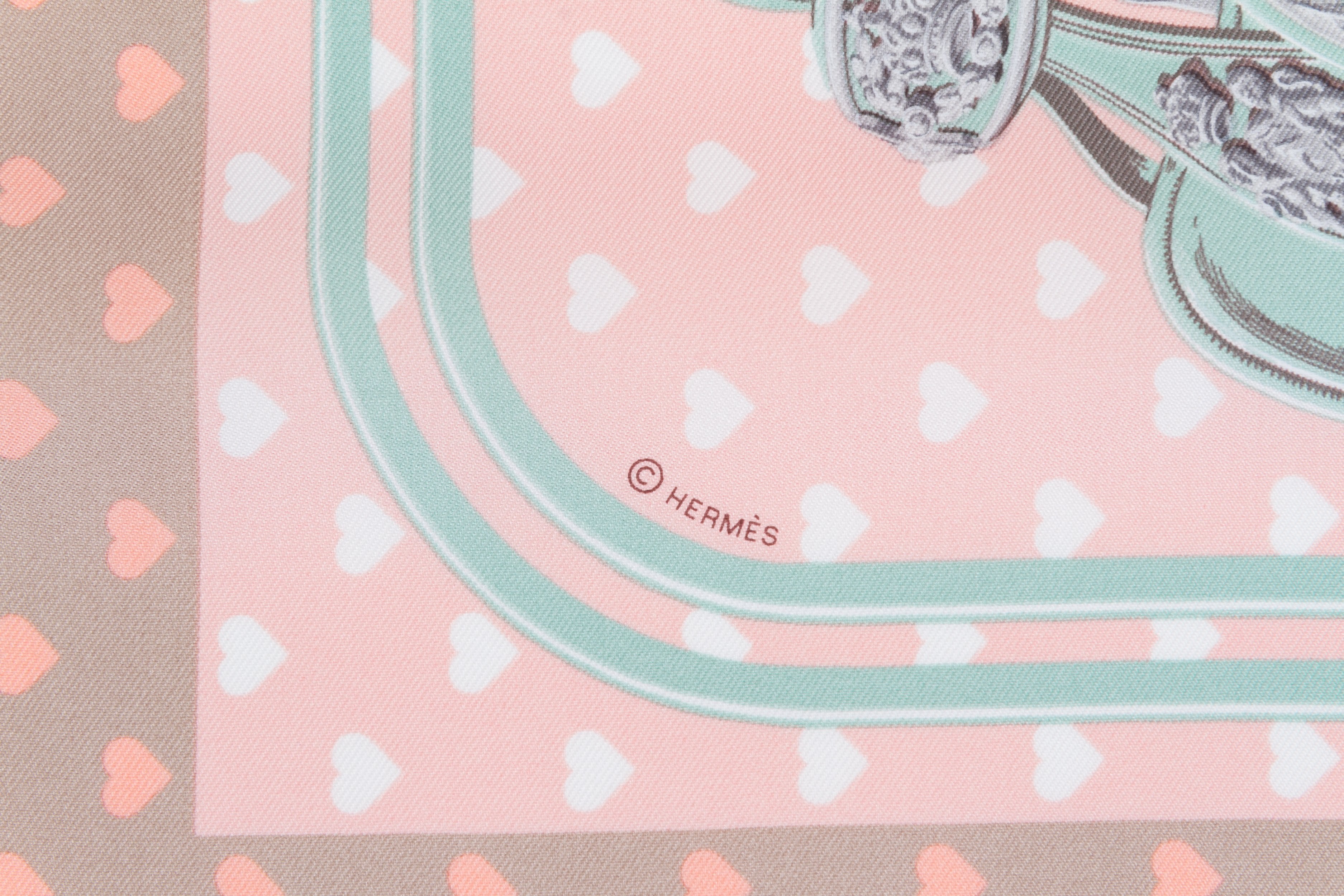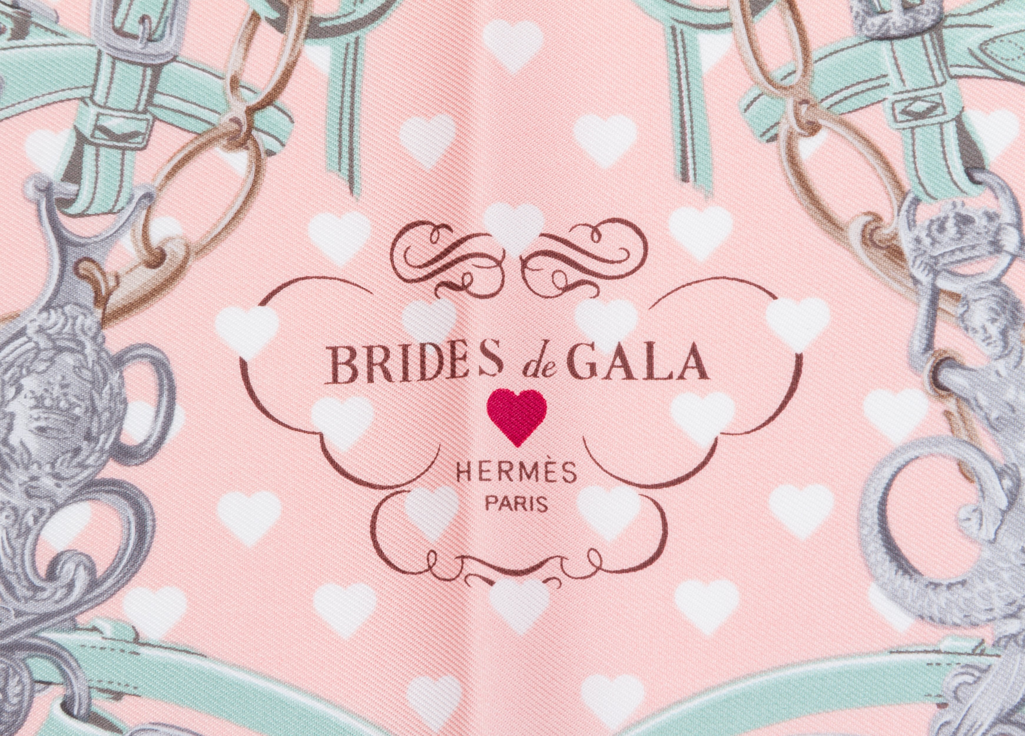 Hermès silk twill 16" square Brides de Gala pochette scarf. Limited edition with heart background. Comes with box, ribbon, and card. Unworn.