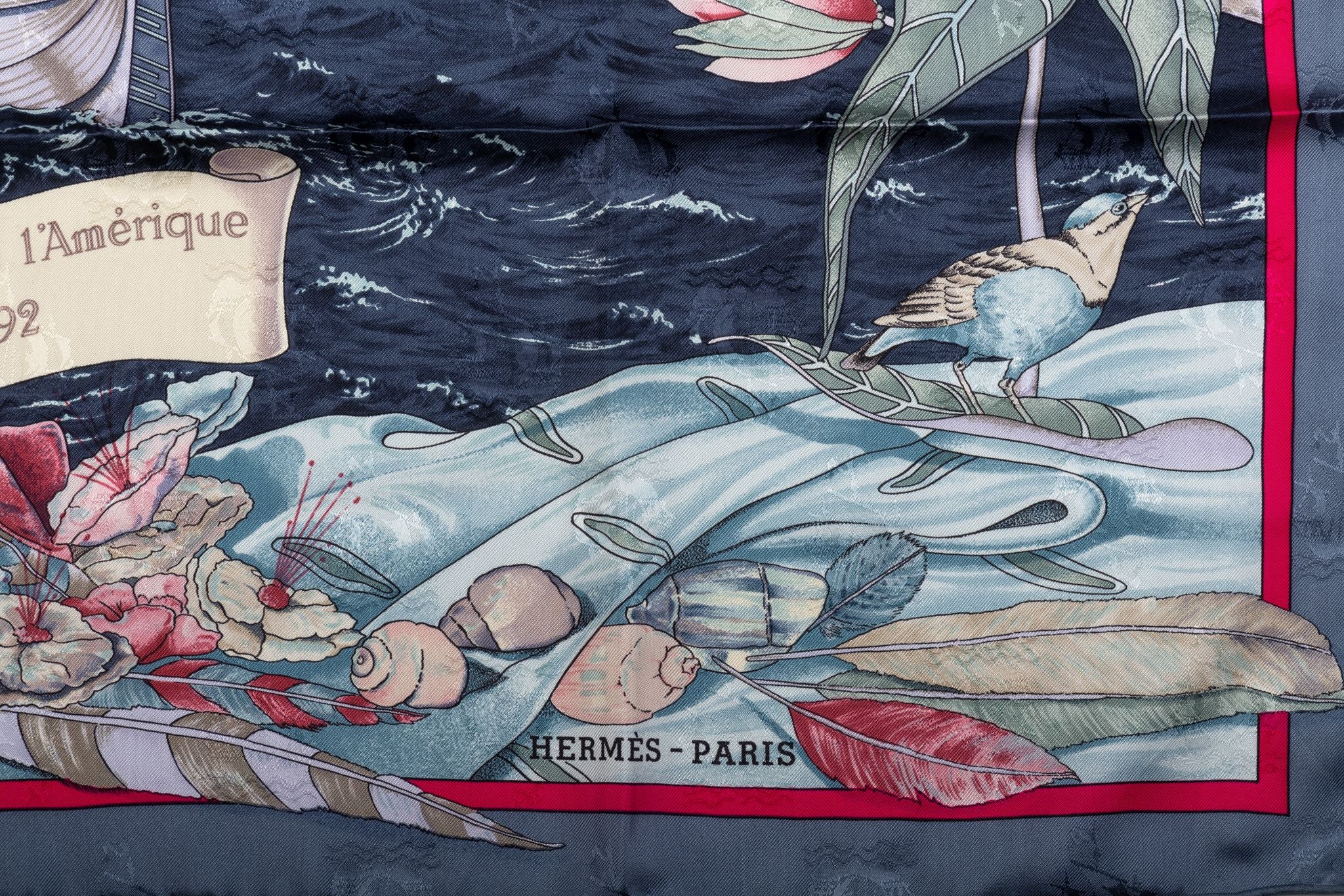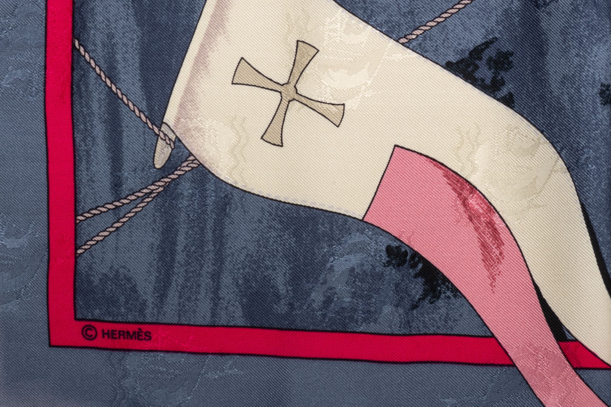 Hermes Colombe ship silk scarf in blue and gray. Hand rolled edges. No box included.
