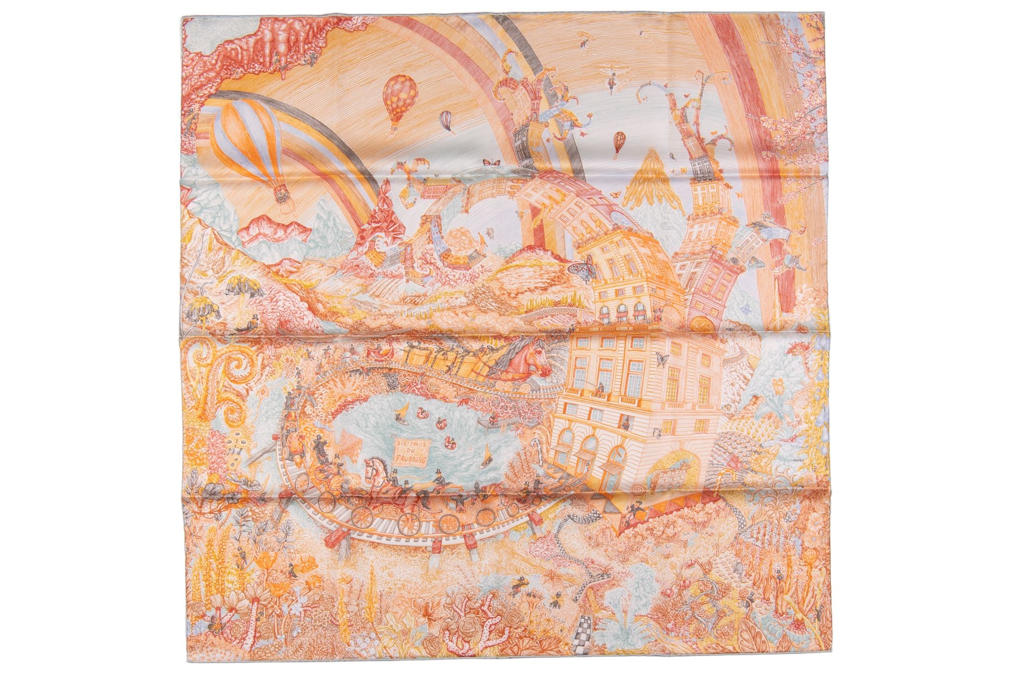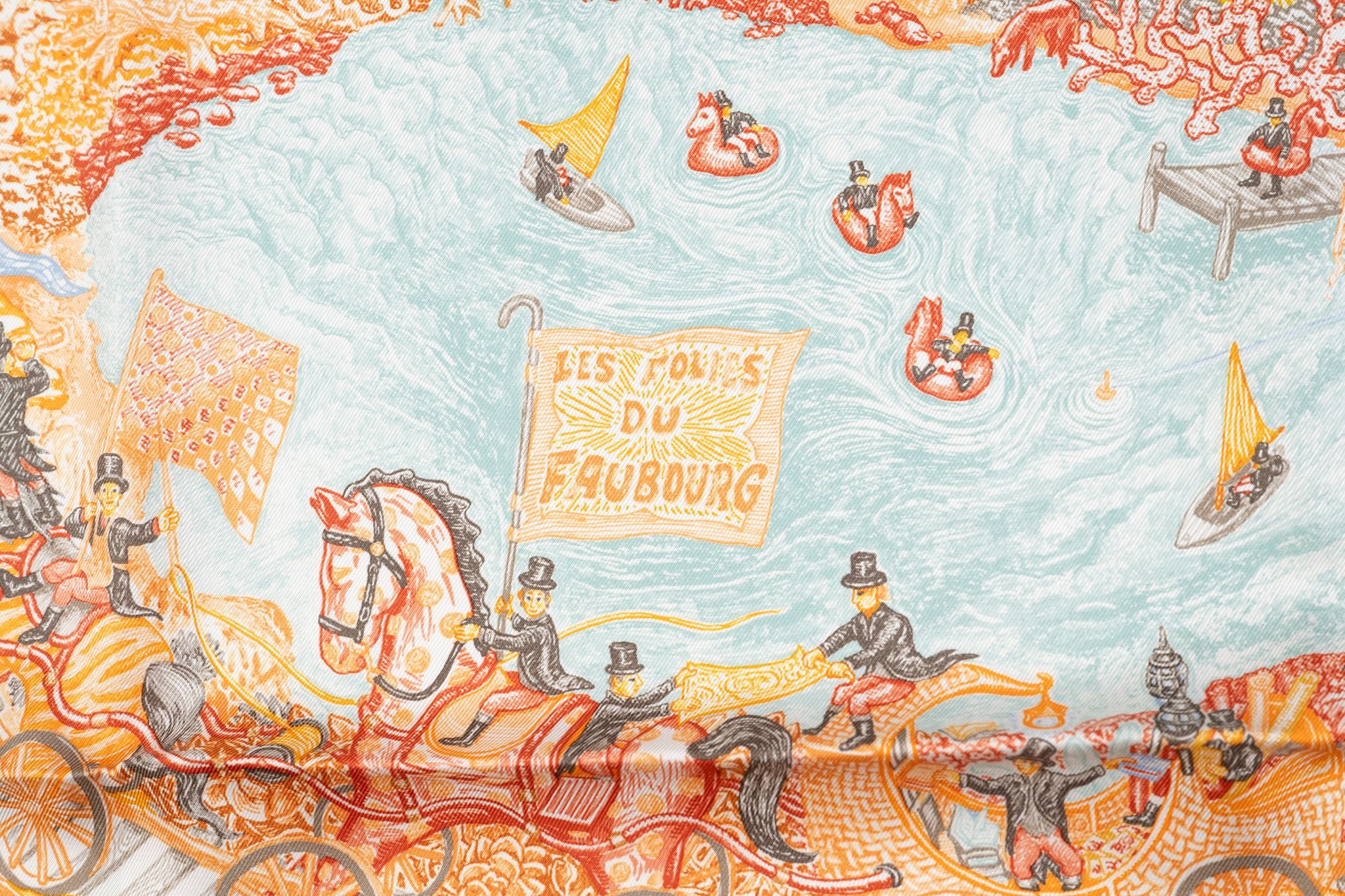 Hermès "Les Folies du Faubourg" scarves, featuring the vibrant and whimsical design by Elias Kafouros. Comes original box.