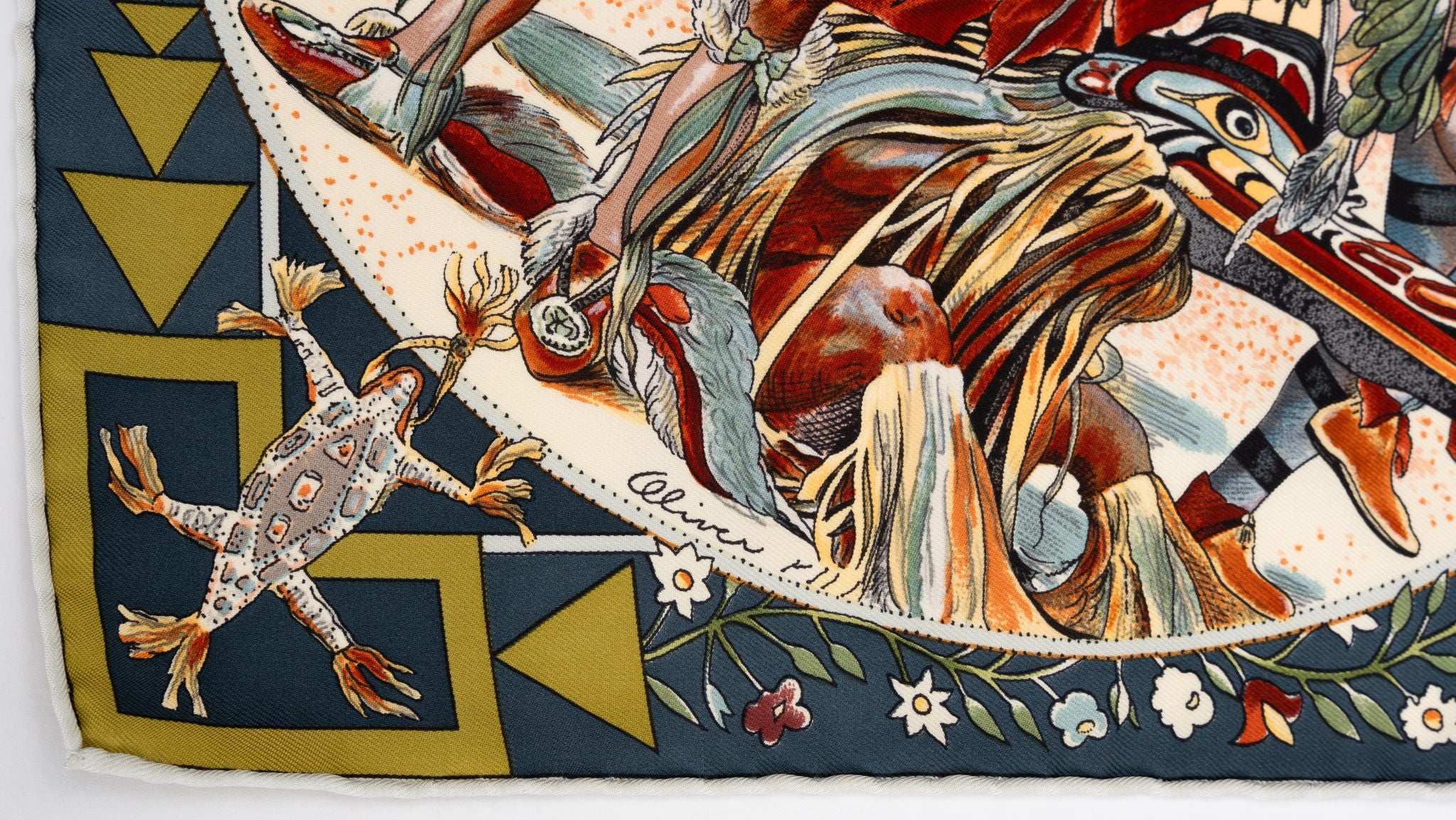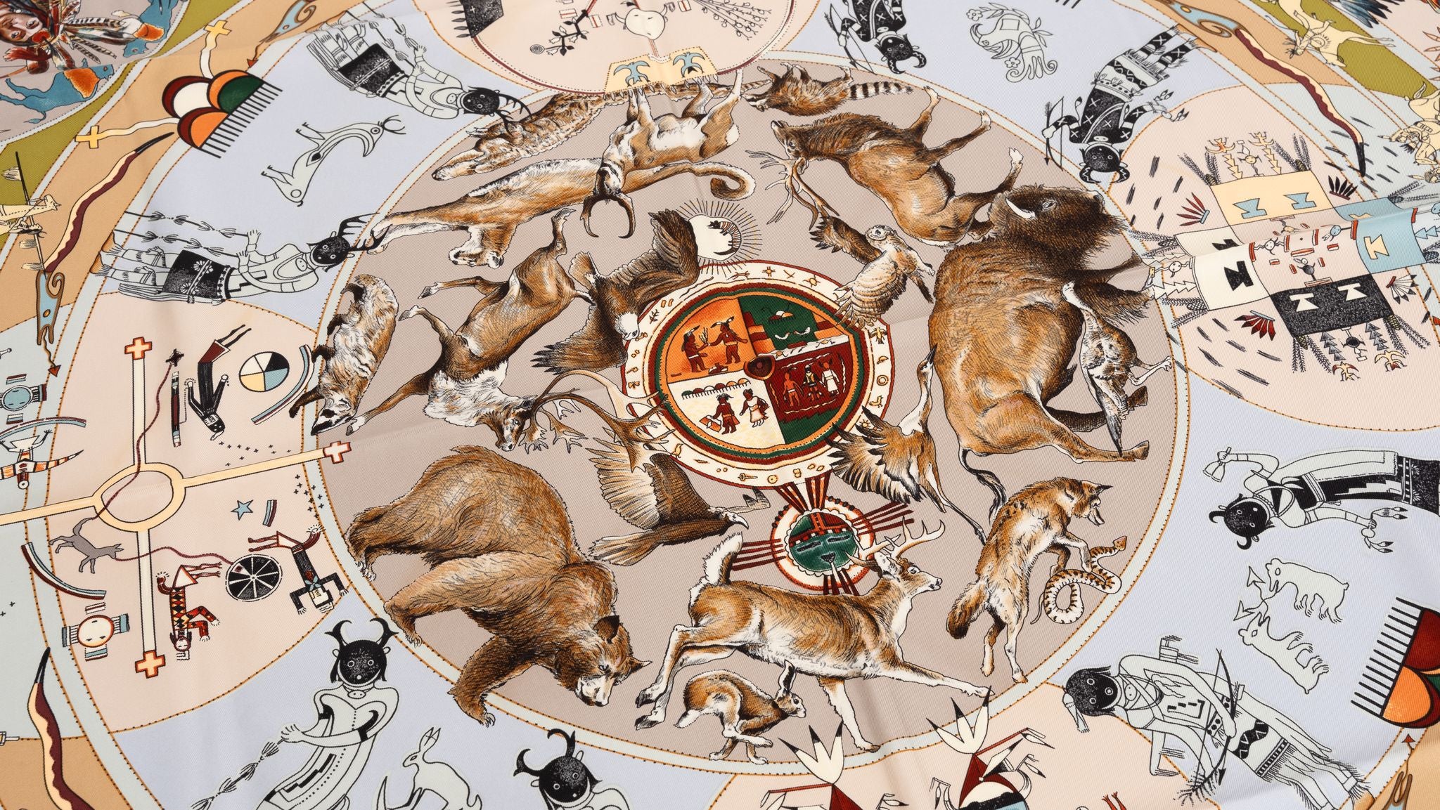 Hermès silk Les Mythologies des Hommes Rouges scarf designed by Kermit Oliver. Hand rolled edges. Excellent condition.