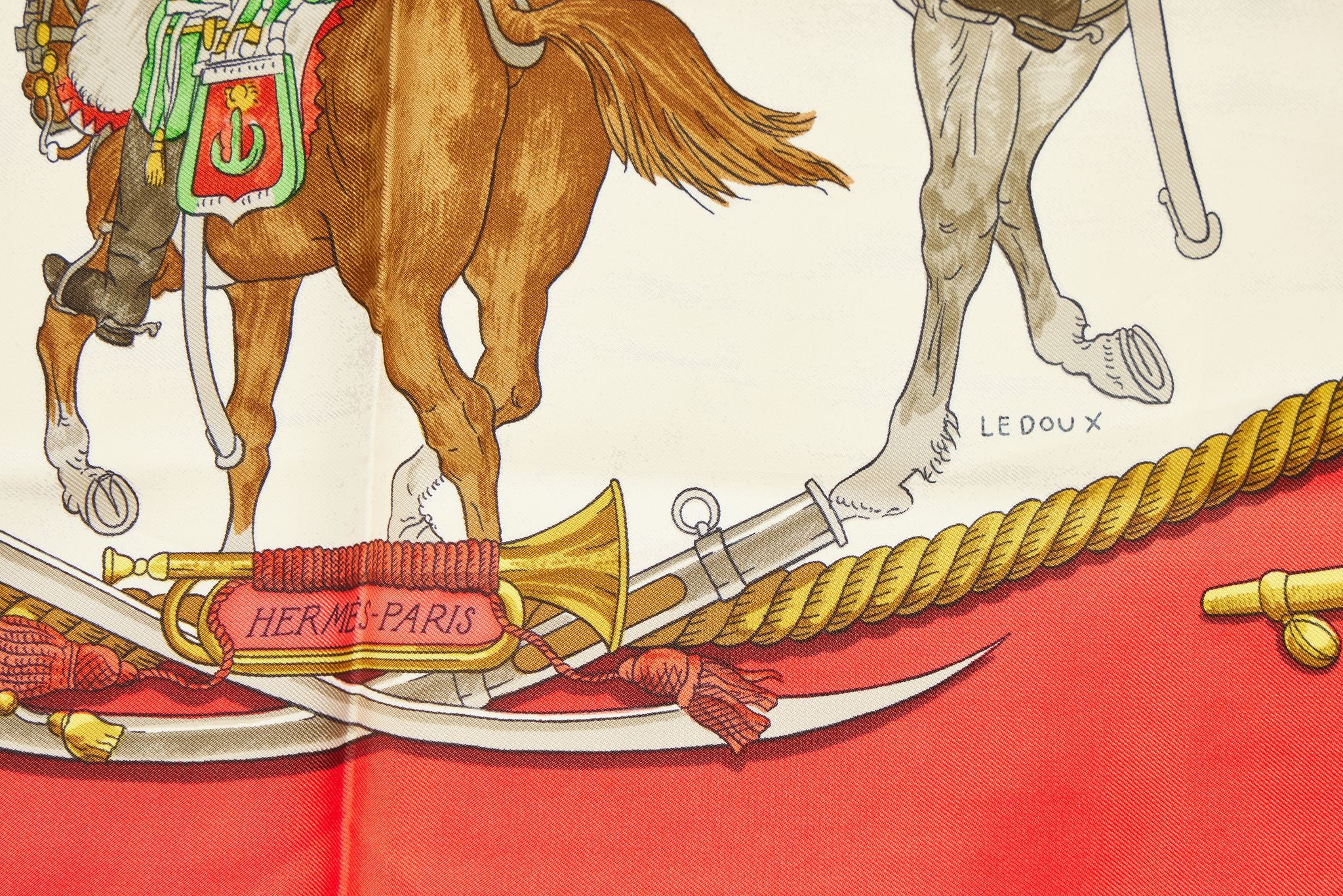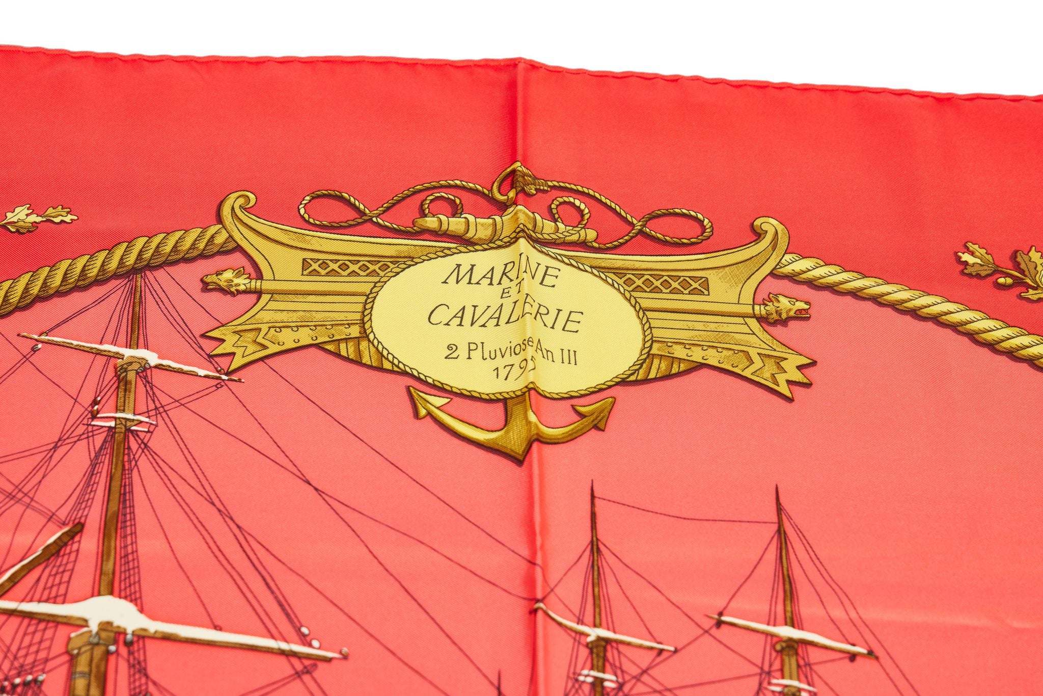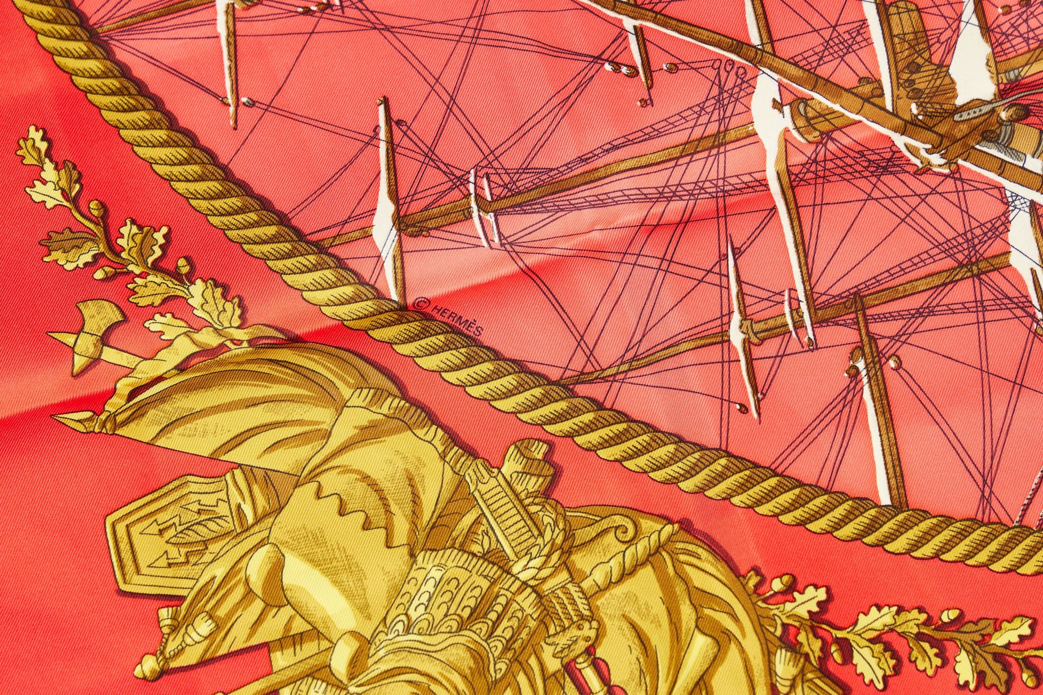 Hermès Marine et Cavalerie red silk scarf by Ledoux. Hand-rolled edges. Dry clean only. Does not include box.