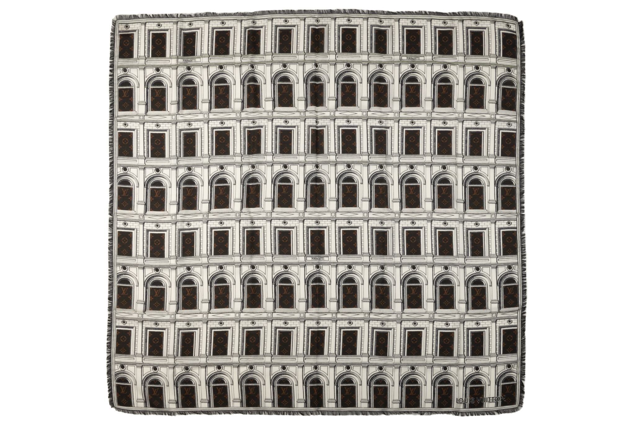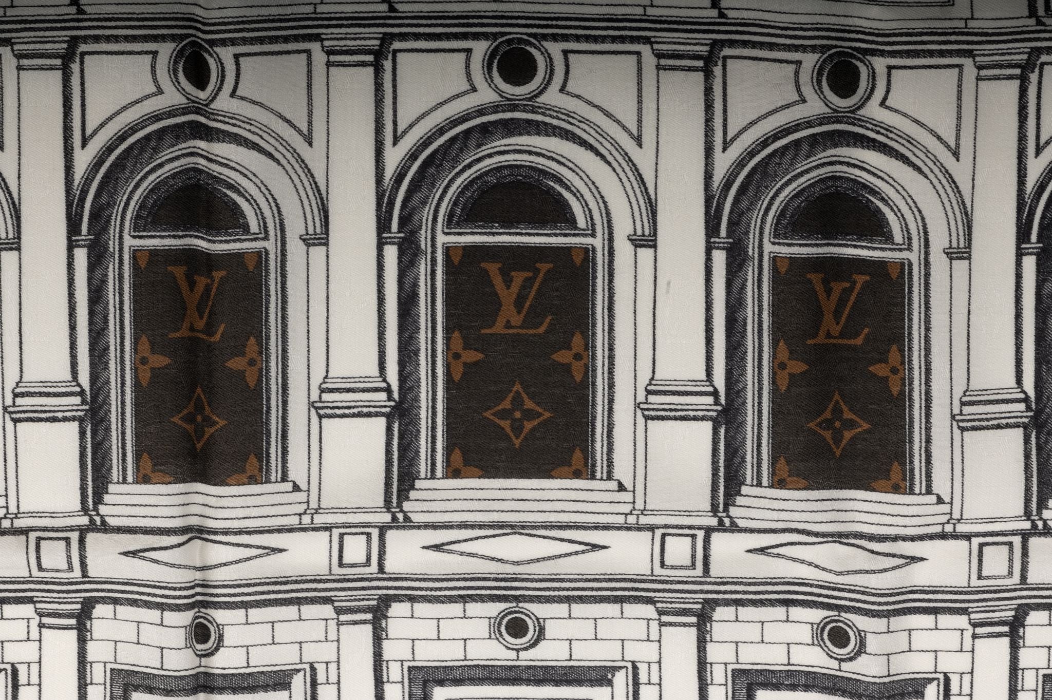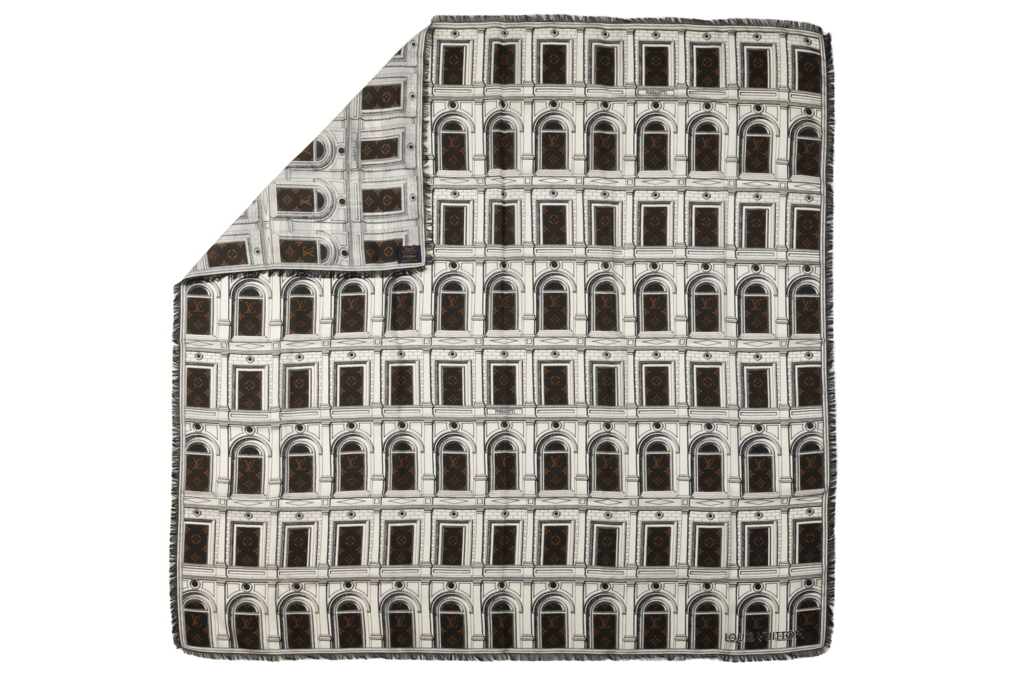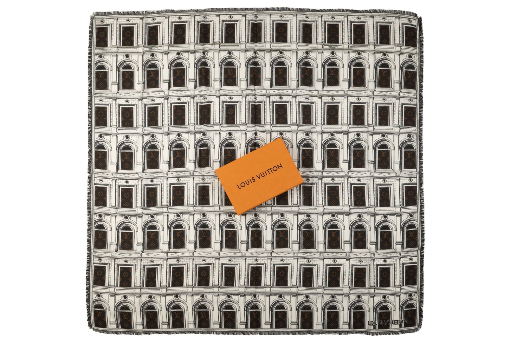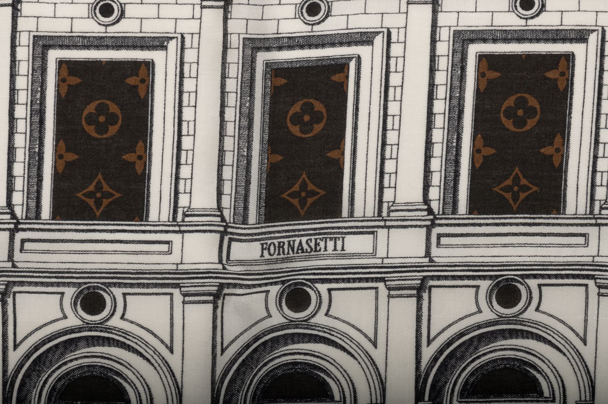 This is an authentic LOUIS VUITTON X FORNASETTI Wool Silk Architettura Shawl in Brown. This stylish large shawl is finely crafted of 61% wool and 39% silk. This shawl features an intricate building illustration from the archives of the artistic atelier in brown on a white background. New with original box .