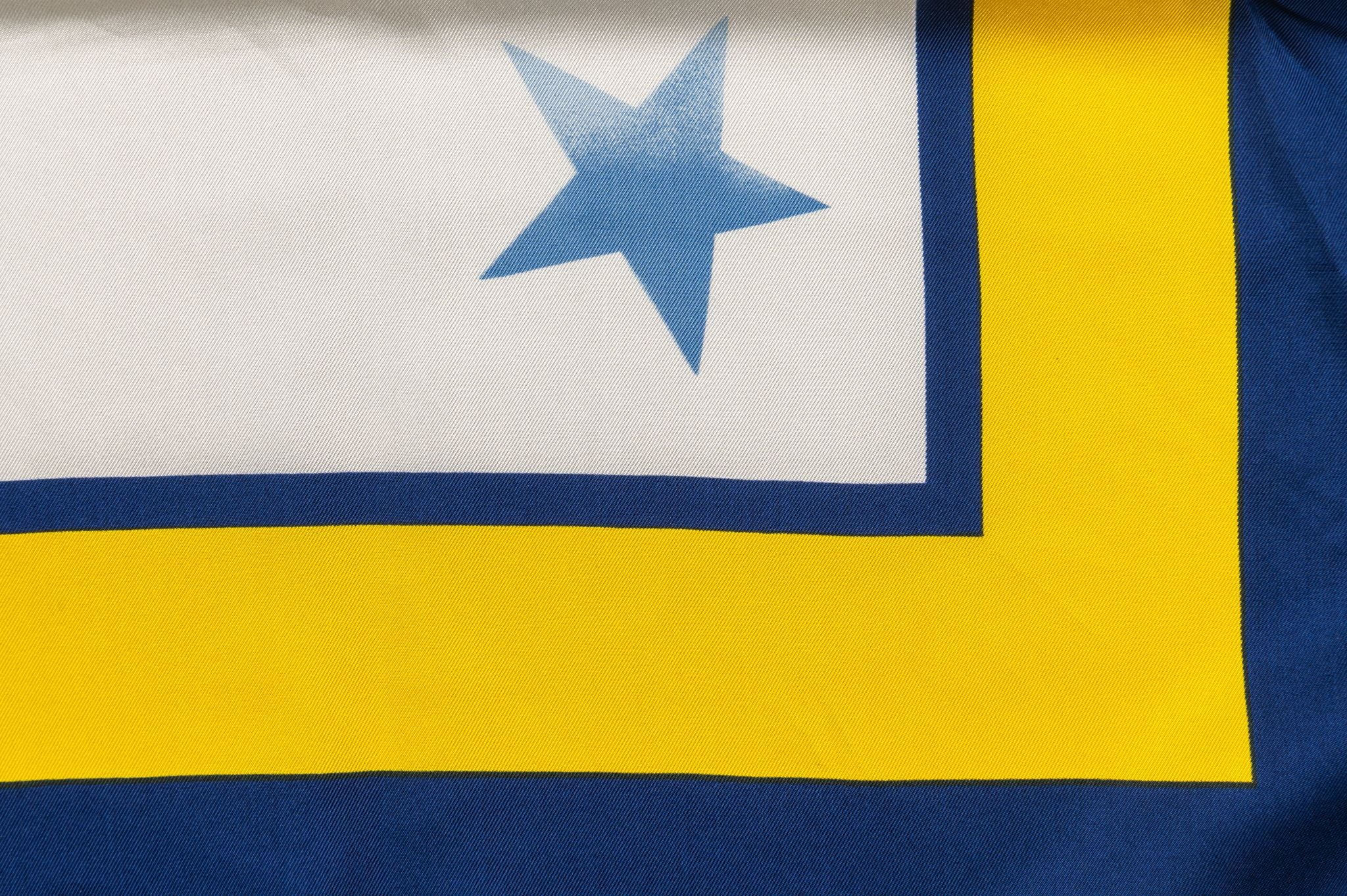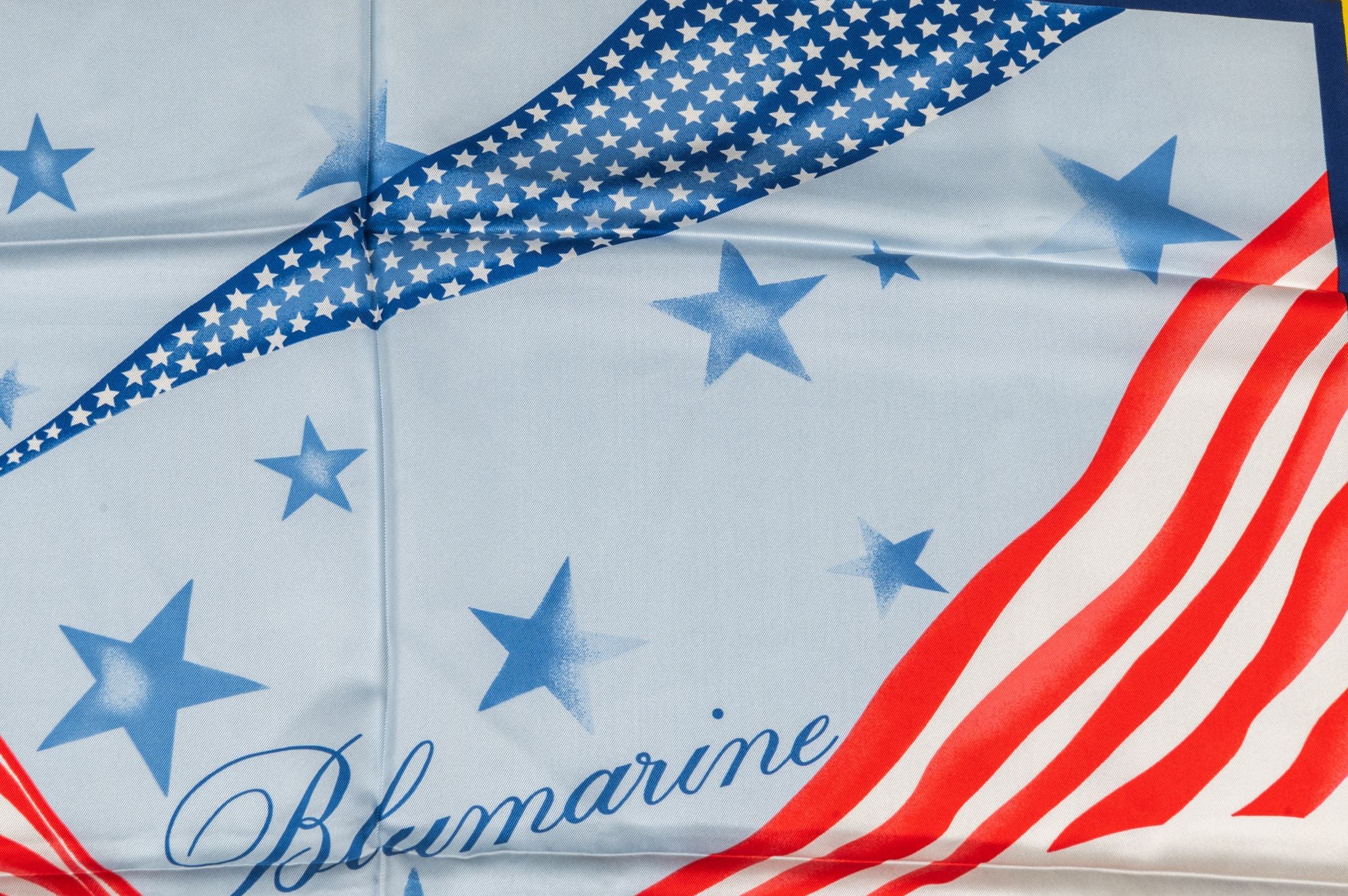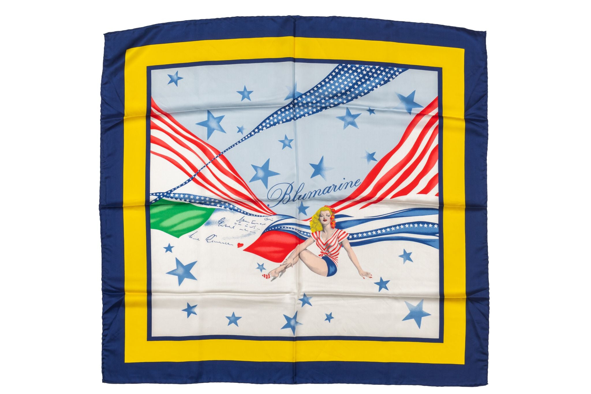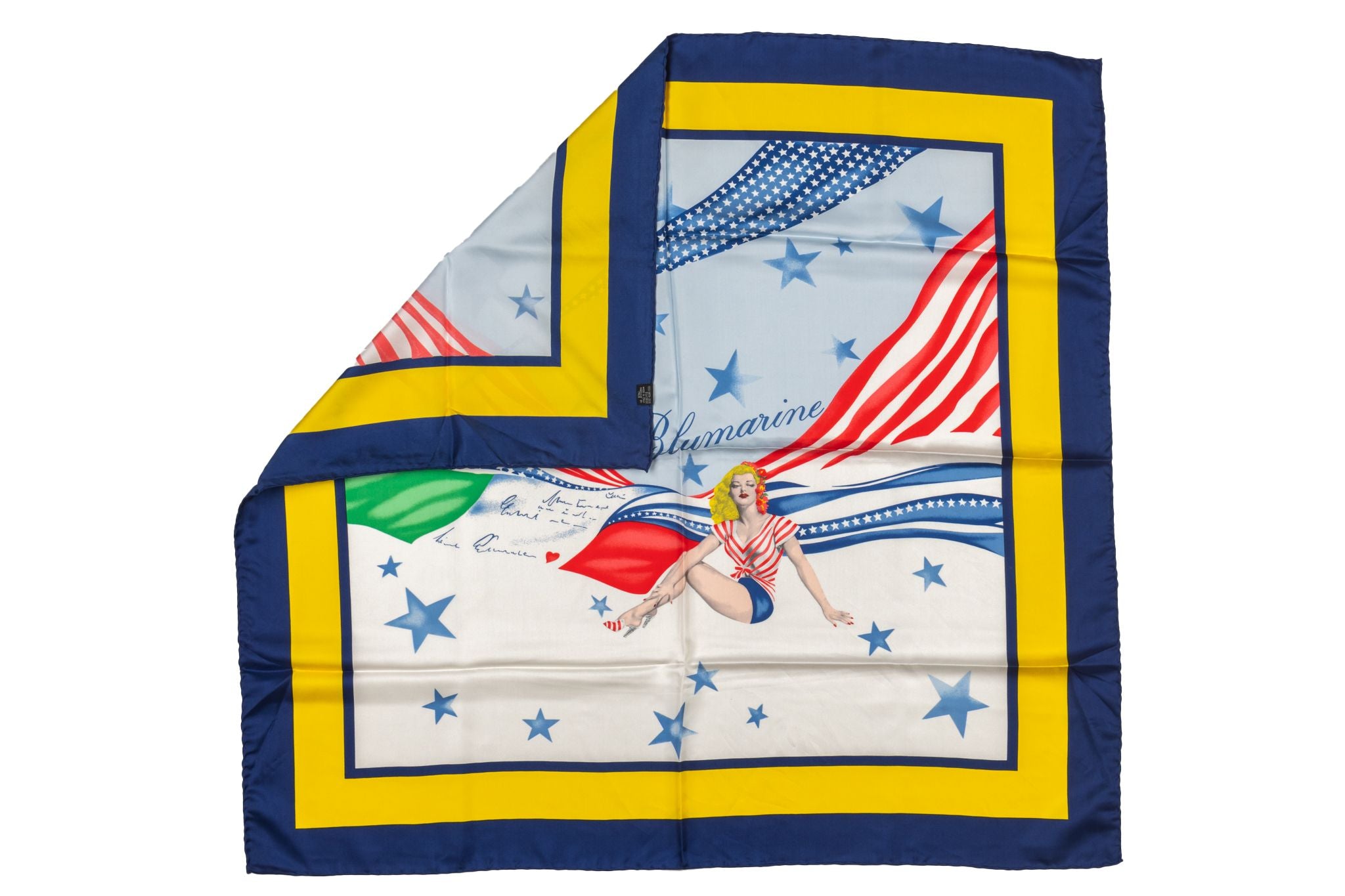 Blumarine Vintage Italy Silk Scarf in blue and yellow. The pattern features a lady holding an Italian flag. The item is in excellent condition.