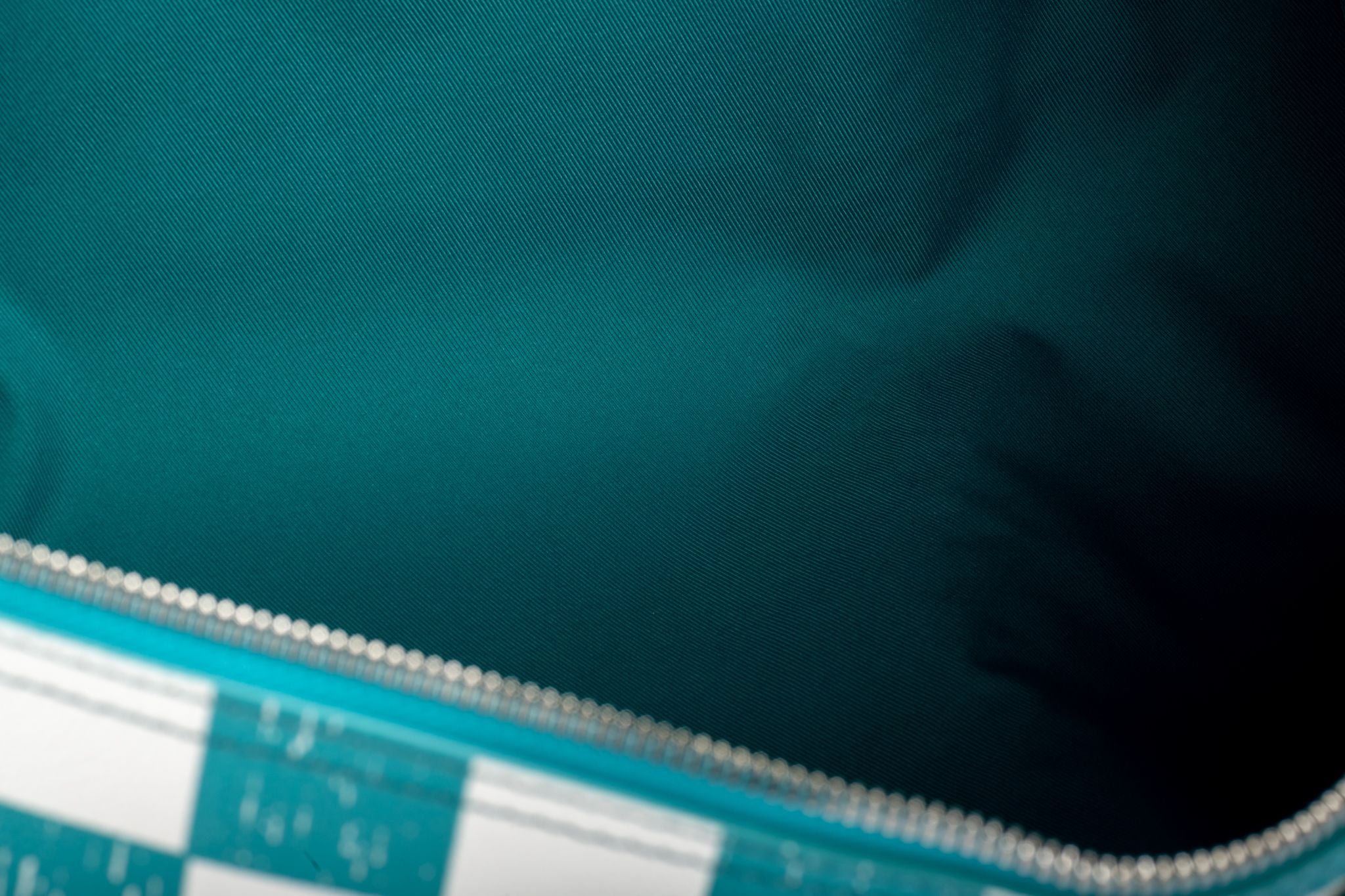 This Keepall Bandoulière 45 bag is fashioned from leather with a Damier checkerboard pattern in teal and white. The leather top handles, side bands, and nametag are also in teal. The squares look as if they were drawn and filled in with a colored pencil. The Vuitton signature in certain squares also has a hand-drawn aspect. The bag comes with a shoulder strap which has a maximum length of 19.6'. It includes original dust cover and box.