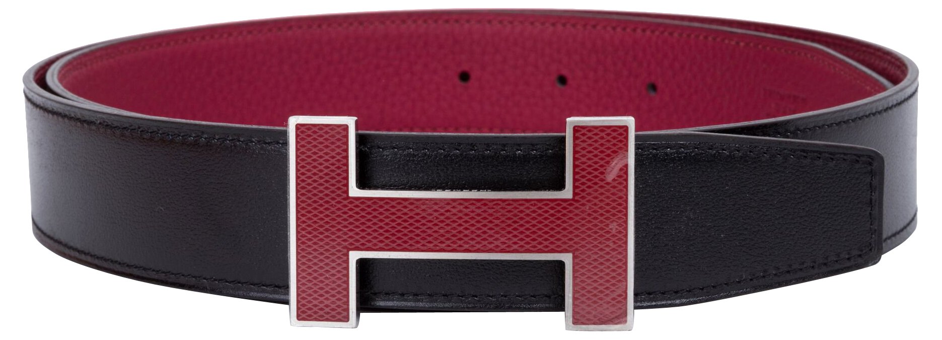 Hermès reversible unisex H belt. Black box calf leather and togo leather. Palladium and ruby enamel buckle. European size 90cm. Date stamp A for 2017. Brand new with dust cover, box, ribbon, and shopping bag.