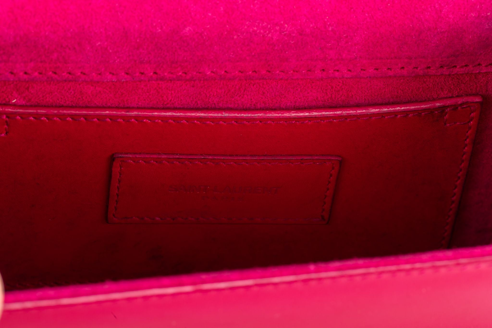 Yves Saint Laurent preloved fuchsia leather cross body bag with gold tassel and chain. Shoulder drop 23”. Comes with booklet and original dust cover.