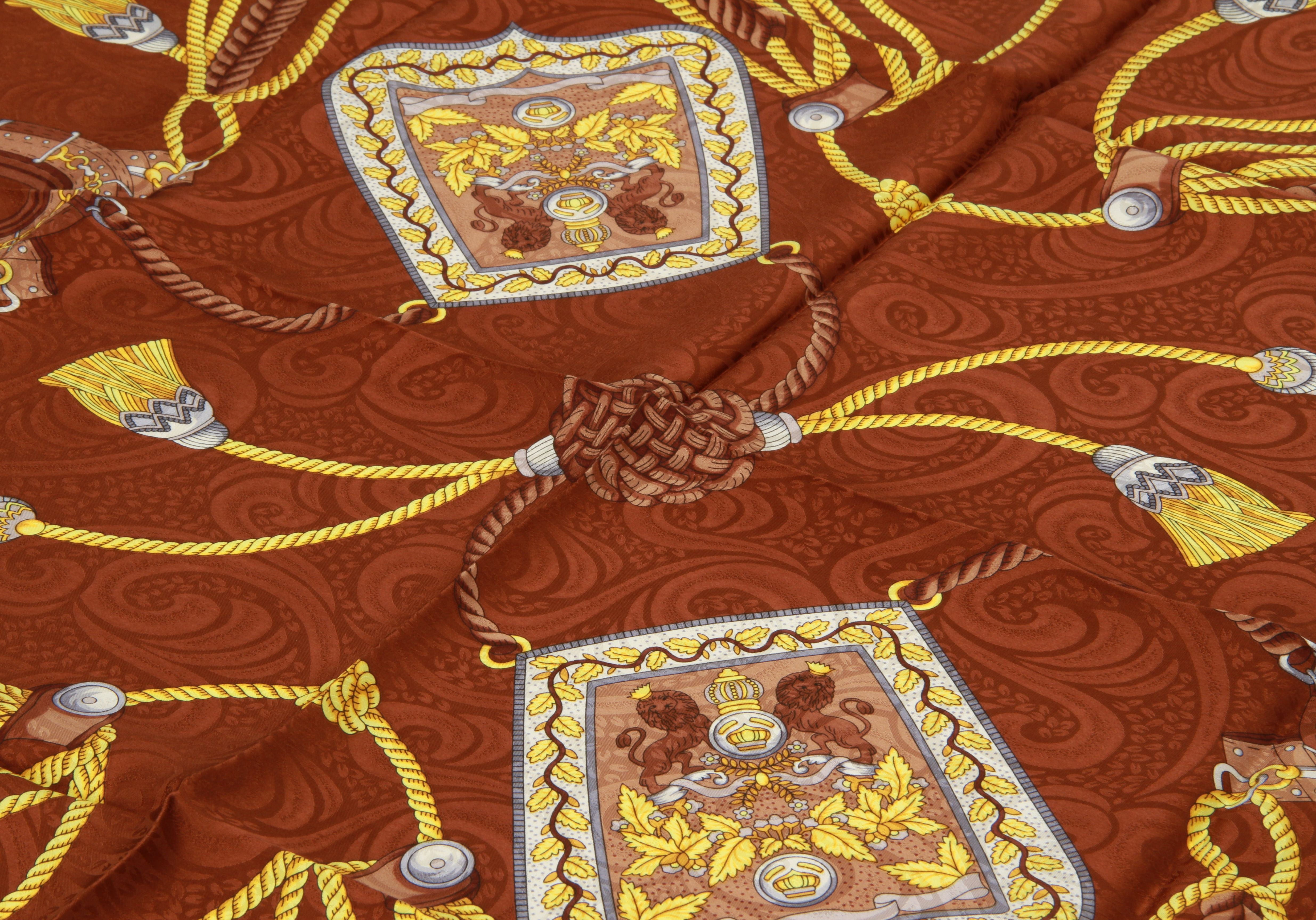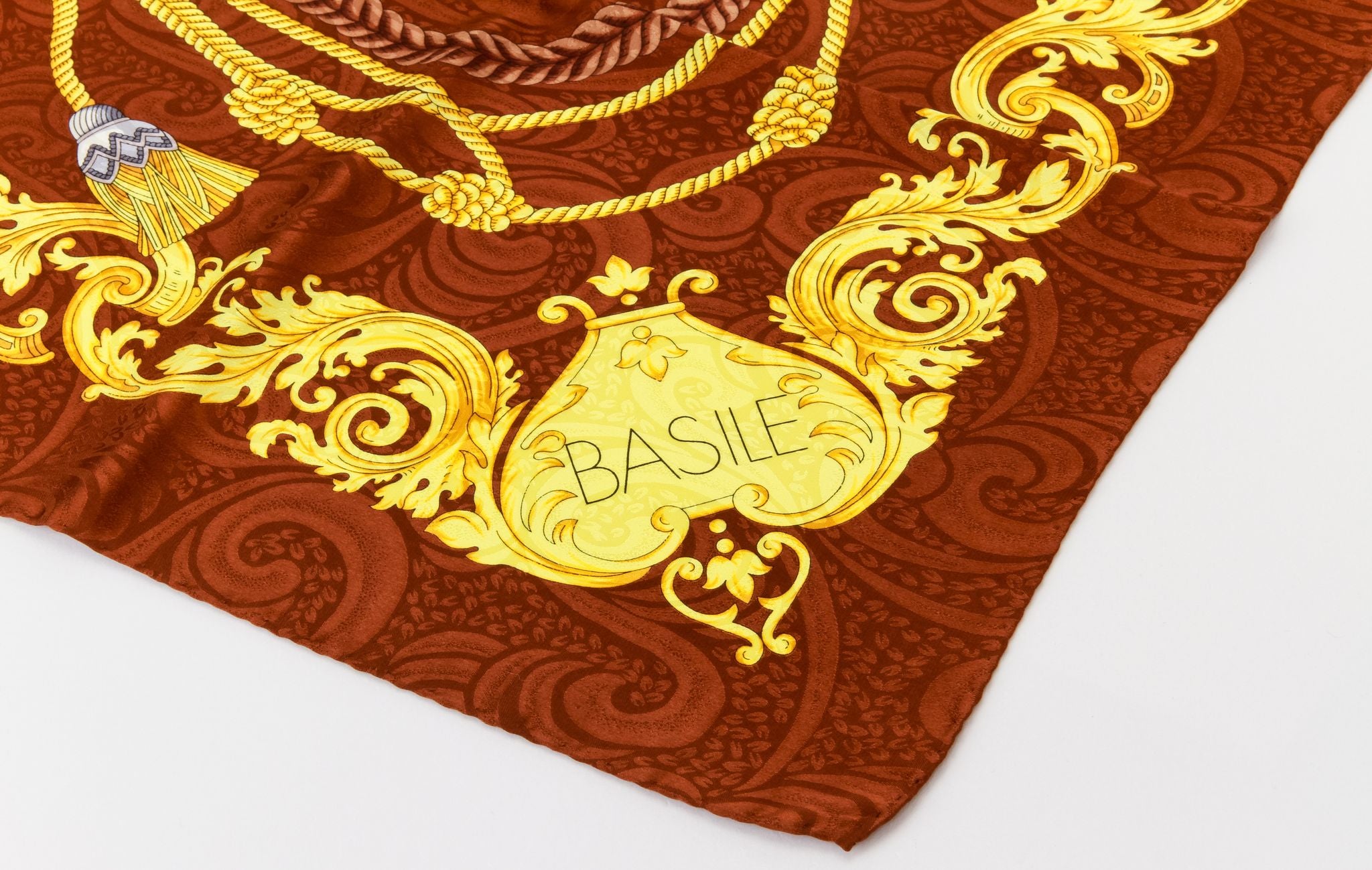 Basile 80s vintage silk scarf with ribbons design, brown and yellow combination. Care tag still attached. Hand rolled edges.