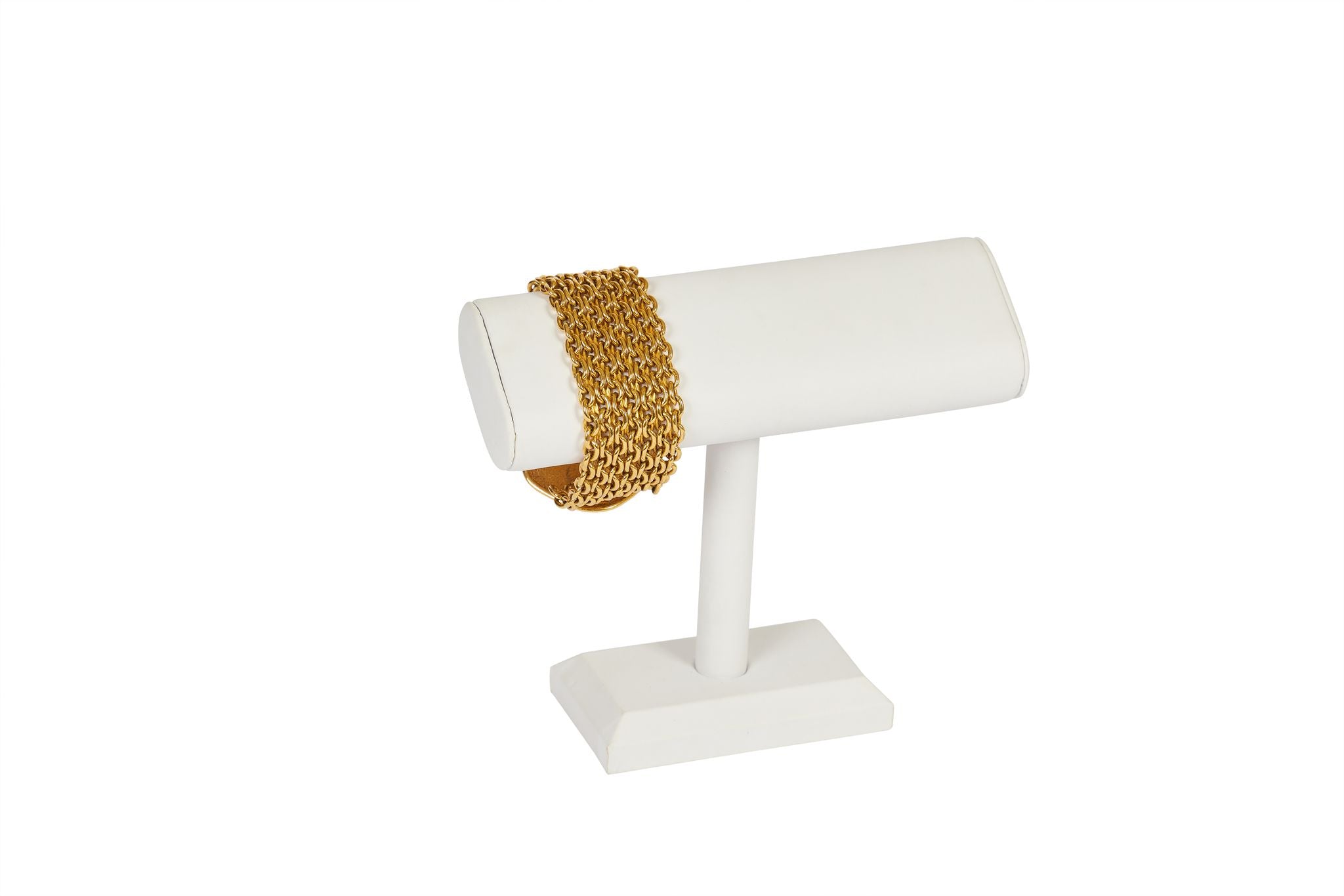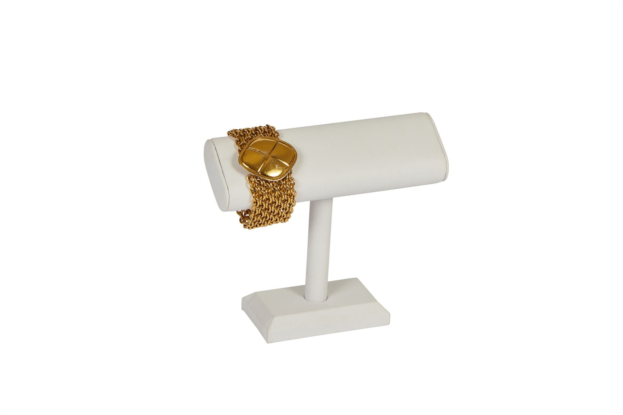 Condition: ExcellentEra: Vintage; 1970s: 8" L x 1" WMaterials: metal/glassColor: gold/red/green1970s Chanel triple-strand manchette bracelet,...