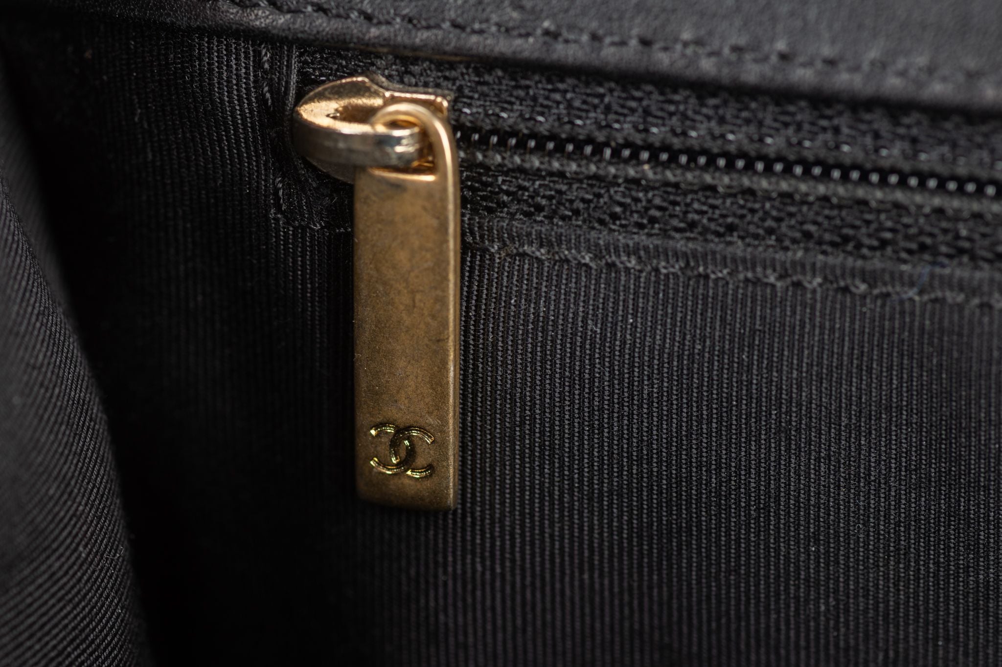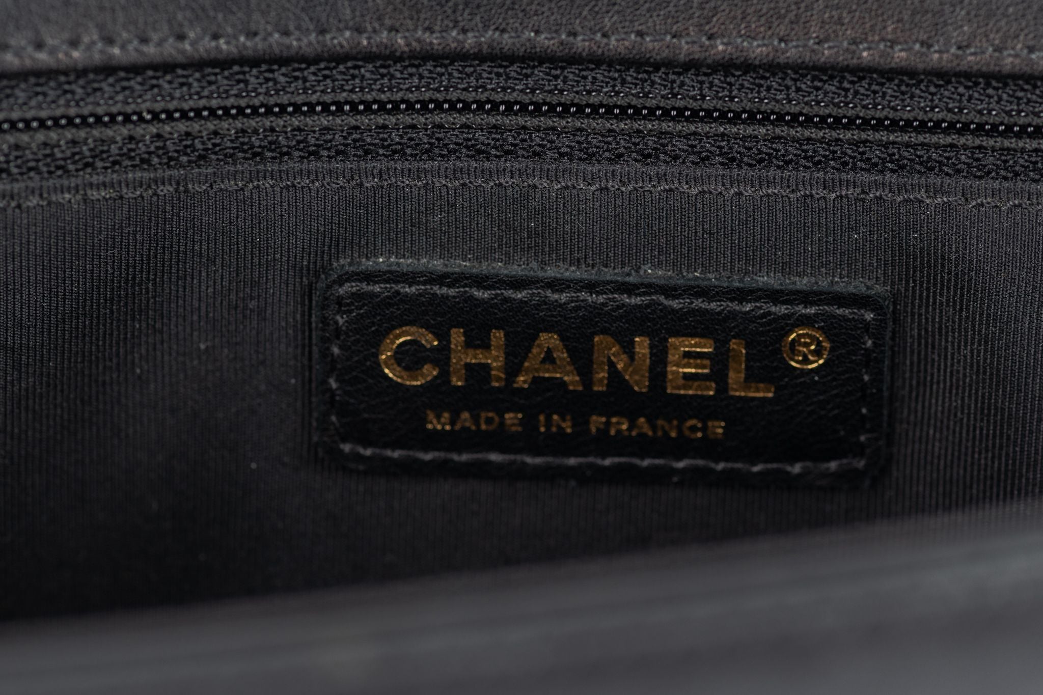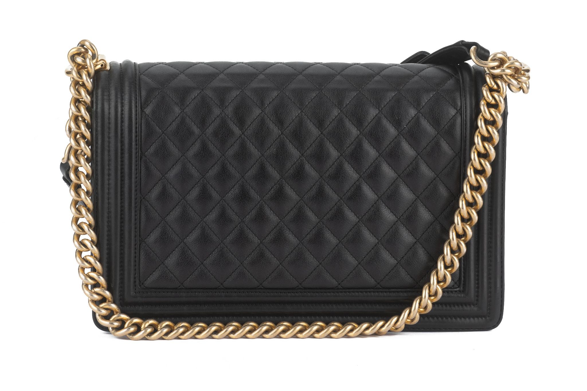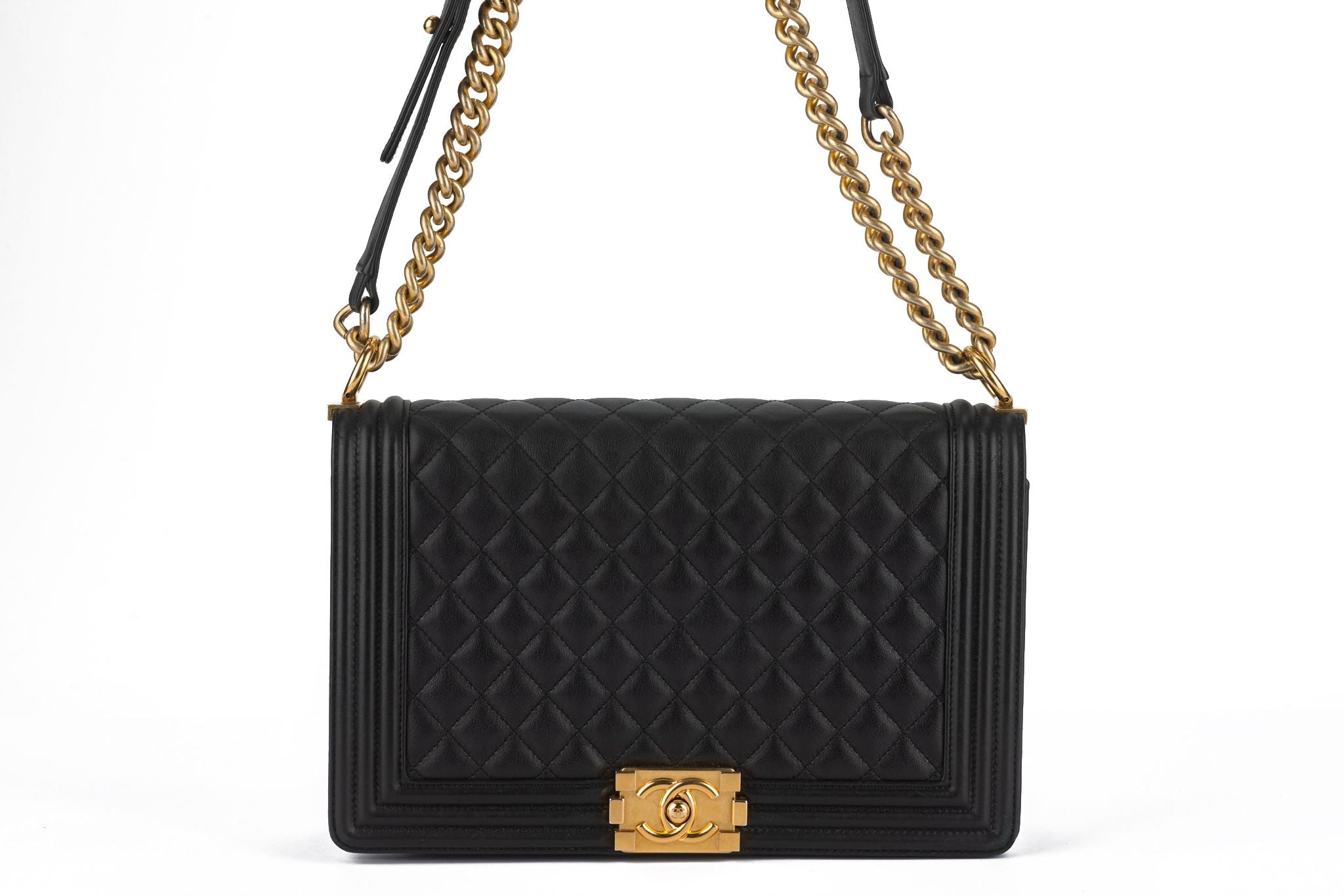 This Chanel Quilted Large Boy Flap in black features diamond quilted leather, a gold chain-link shoulder strap with a leather shoulder pad and a Chanel boy CC push lock. This opens the full flap to a black fabric interior with zipper and patch pockets. Comes with original dust bag, hologram and identity card. Hologram starts with 20. Strap drop - 11.5"/20"