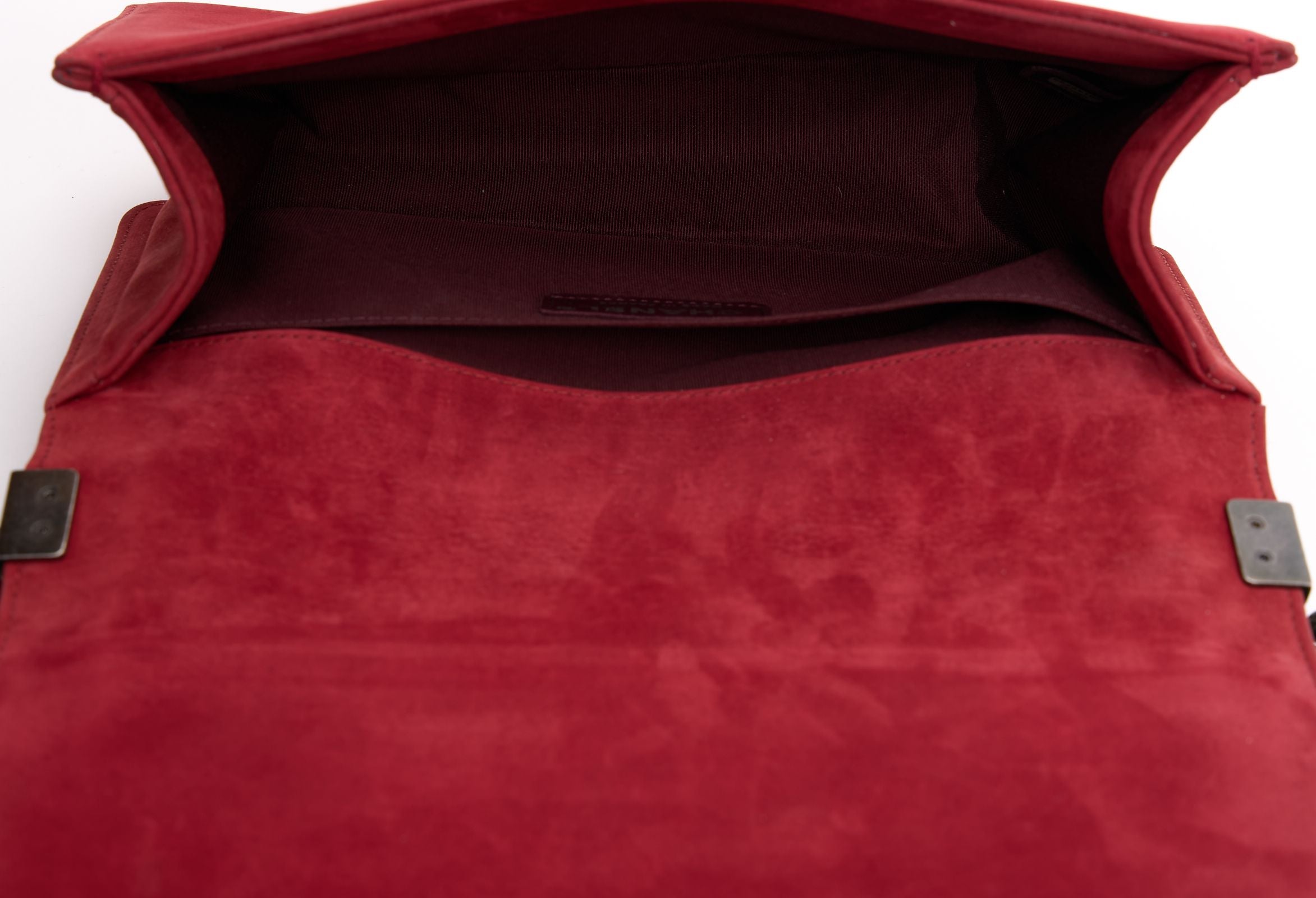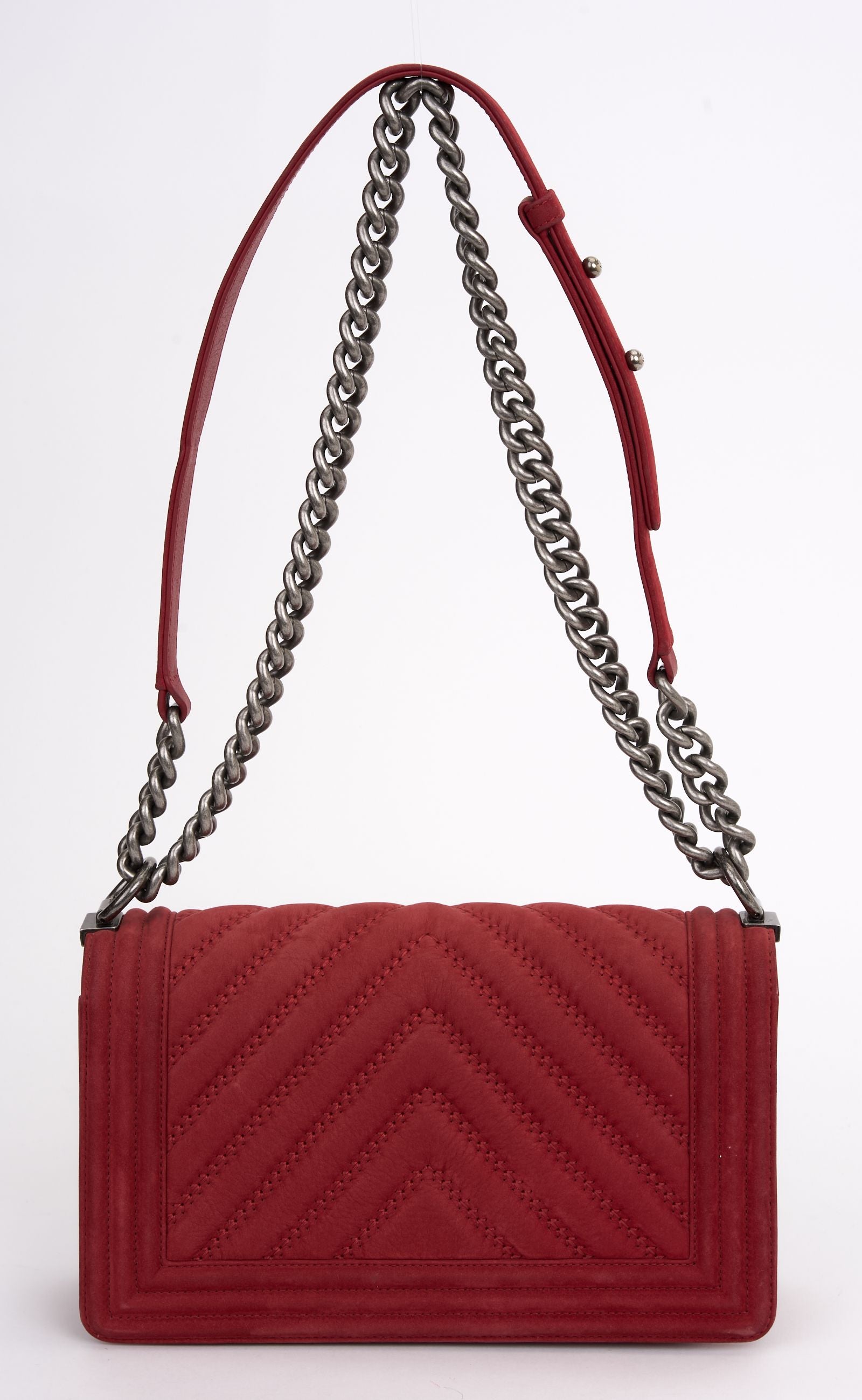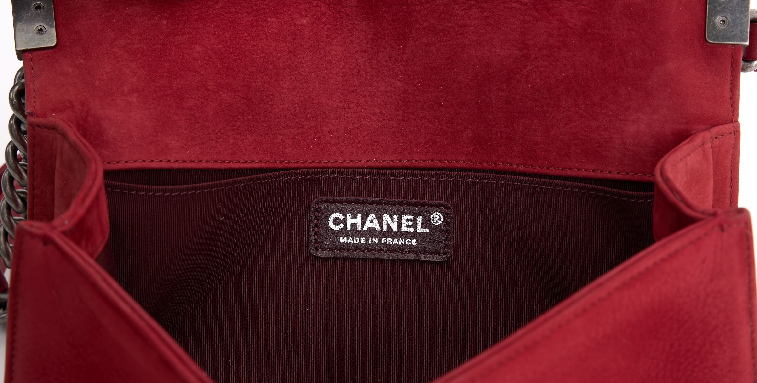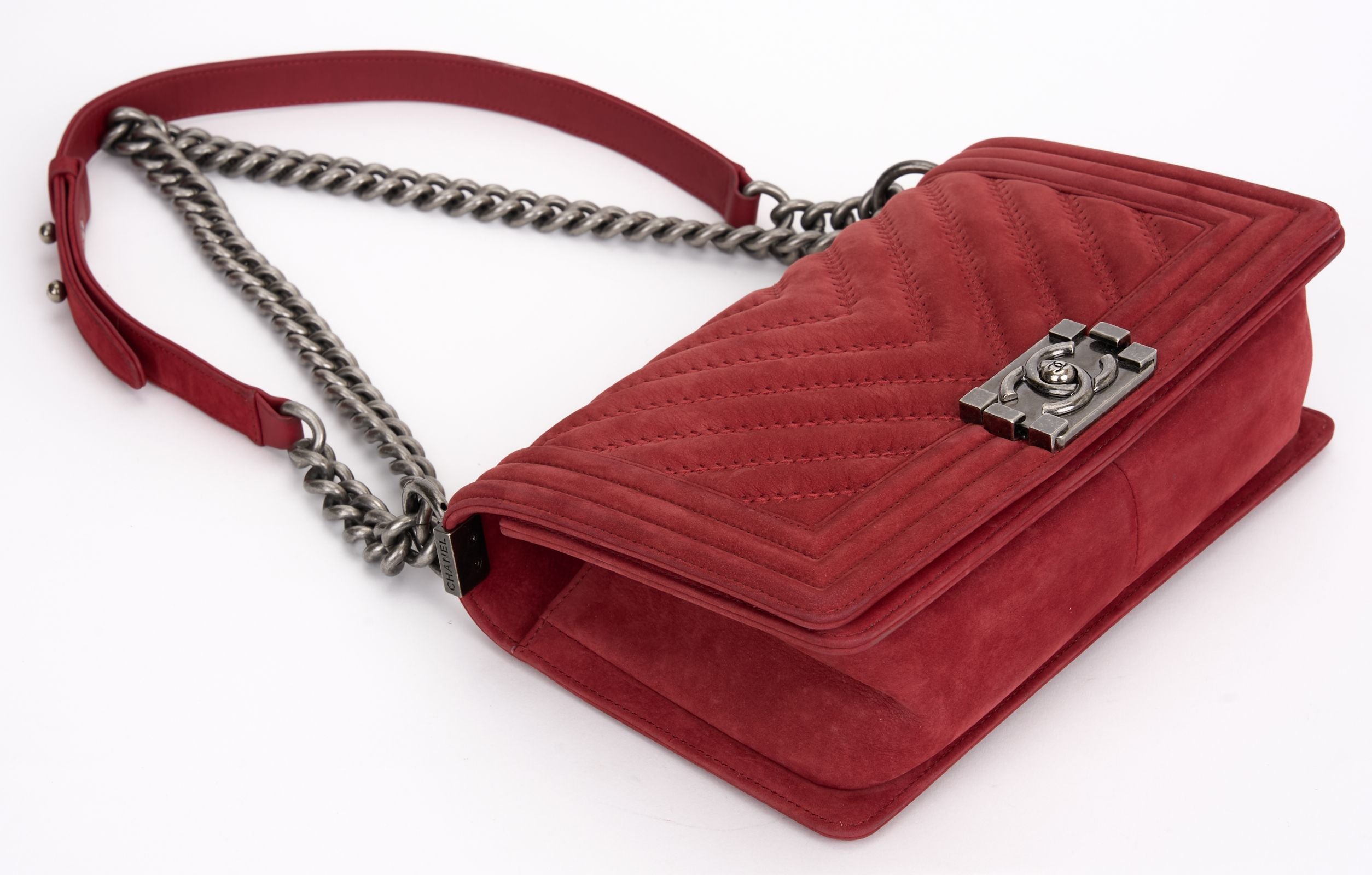 This Chanel Suede Boy Bag features red suede, interlocking CC Logo, antiqued silver-tone hardware, chain link handles and shoulder strap, and a push lock closure at the front. Comes with dust cover. Hologram first two numbers are 23. Strap drop - 12".