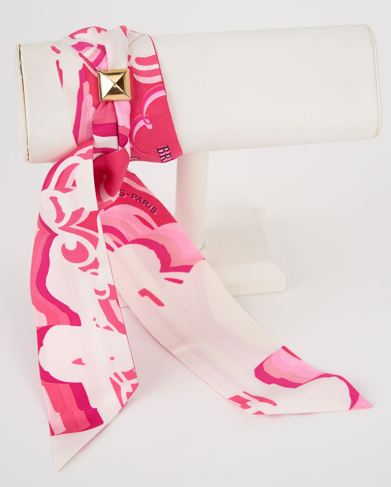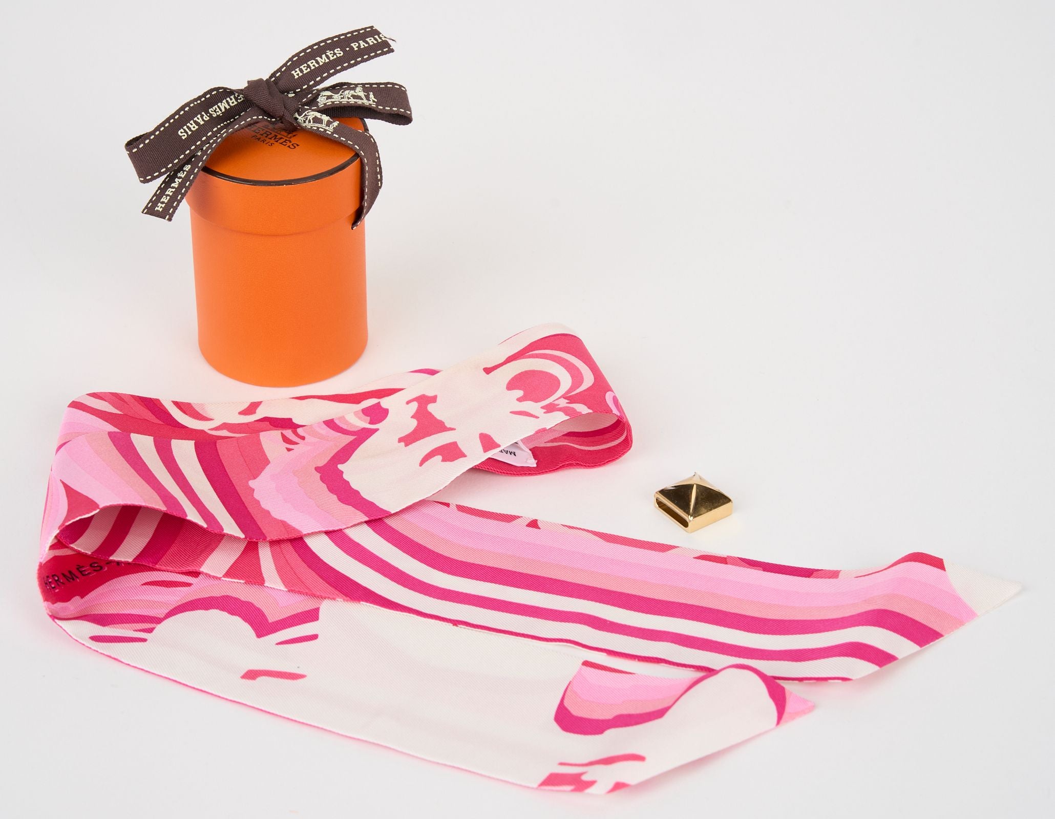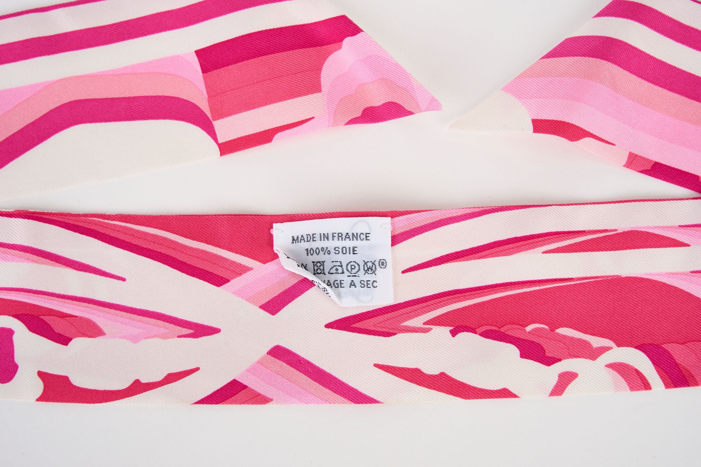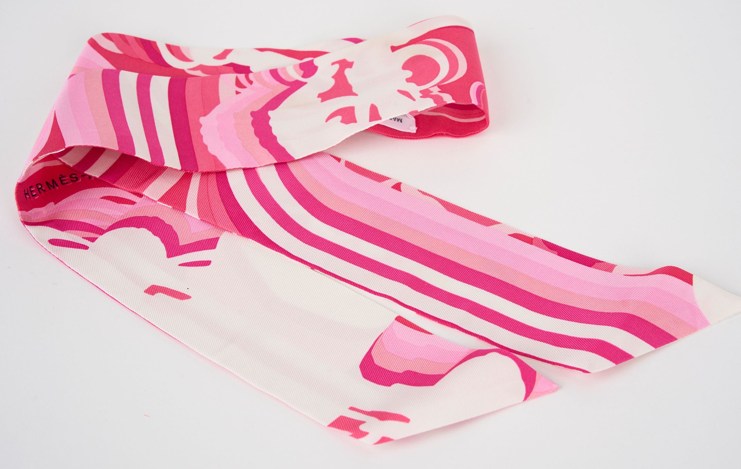 This Hermès Bridges De Gala Shadow Twilly is in Rose, White and Fuchsia. Made from 100% silk. It can be worn in different ways with a slide medor in gold tone hardware. Comes with original box. Brand new.