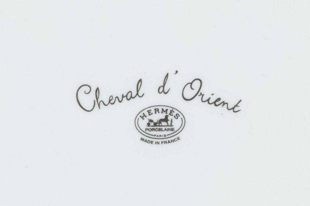 The piece is a part of the Hermès Porcelain, Cheval d'Orient Collection. The beautiful dish is a rare collectible. Comes with booklet, ribbon and original box.