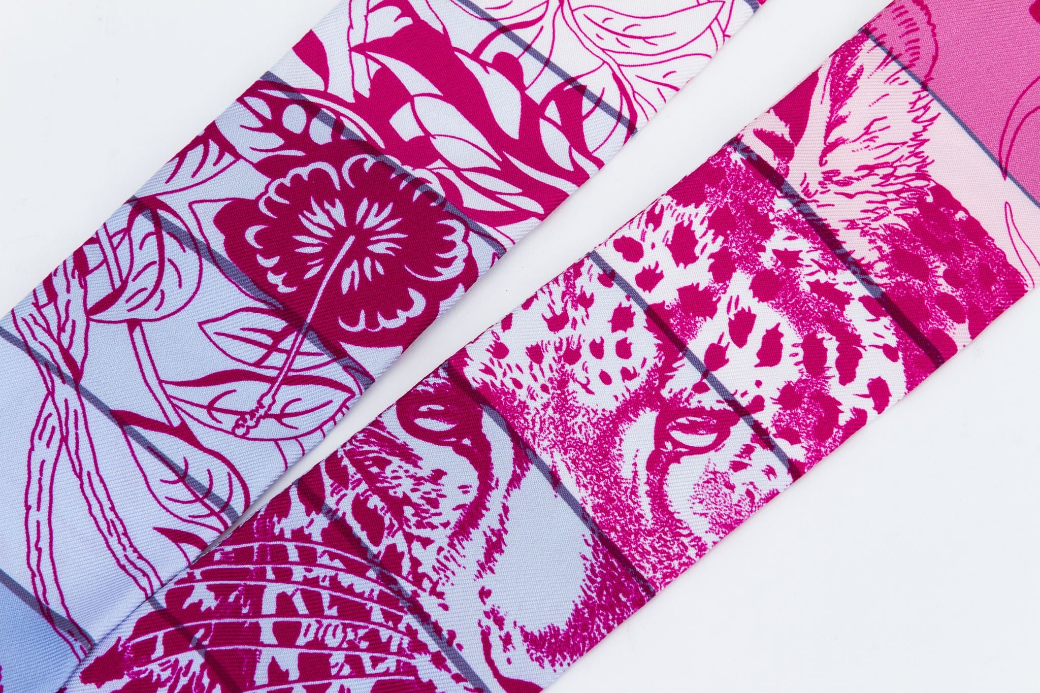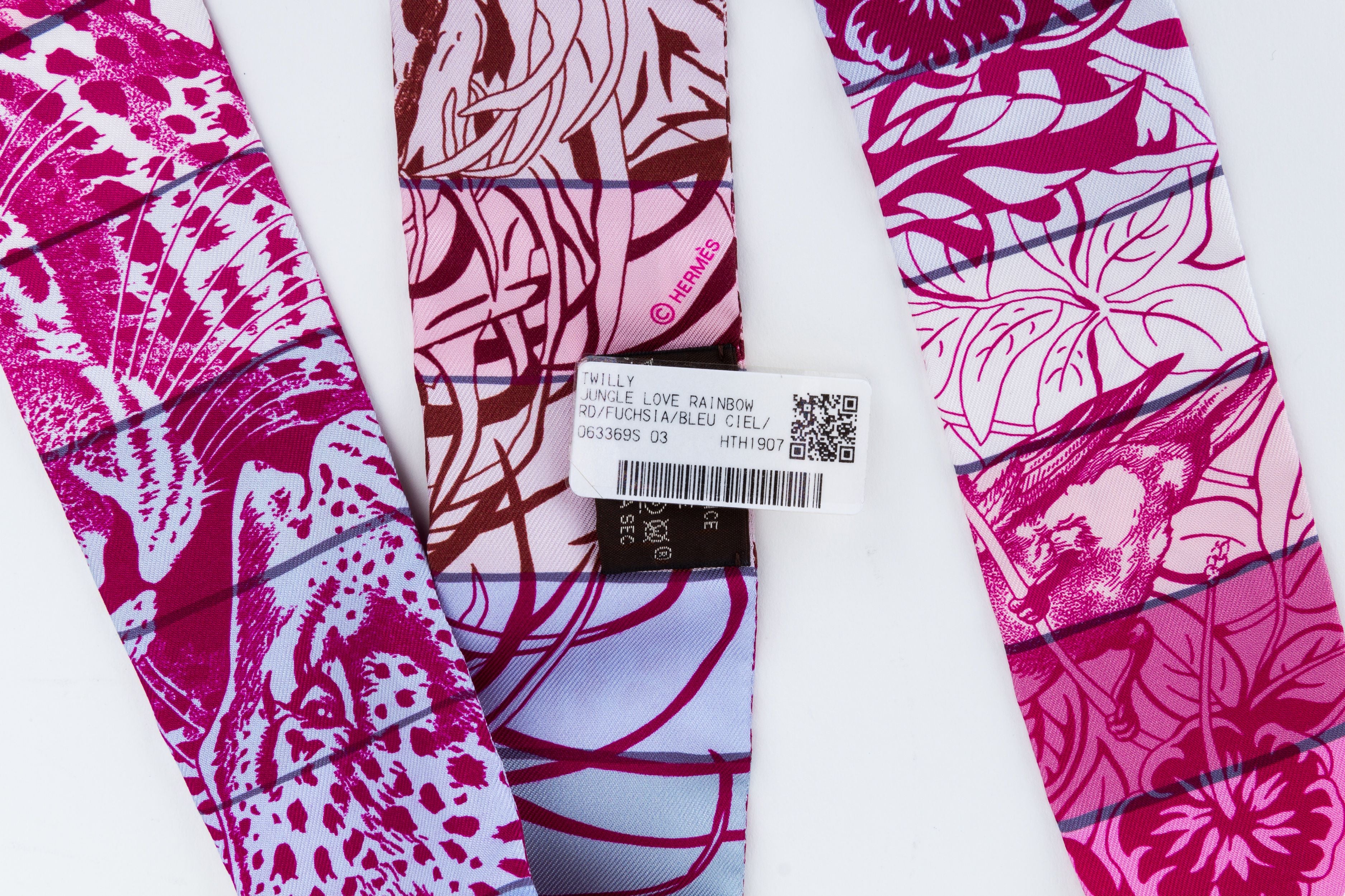 Hermès ghepard pink print design twilly scarf with gold tone hardware. Comes in box.