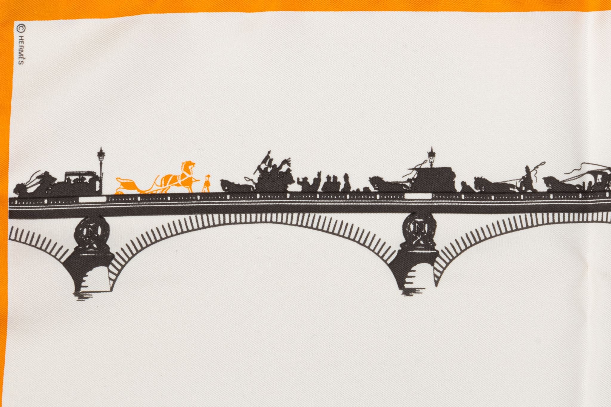 Hermes collectible "Les ponts de Paris" 100% silk gavroche, black, white and orange. Hand rolled trim.