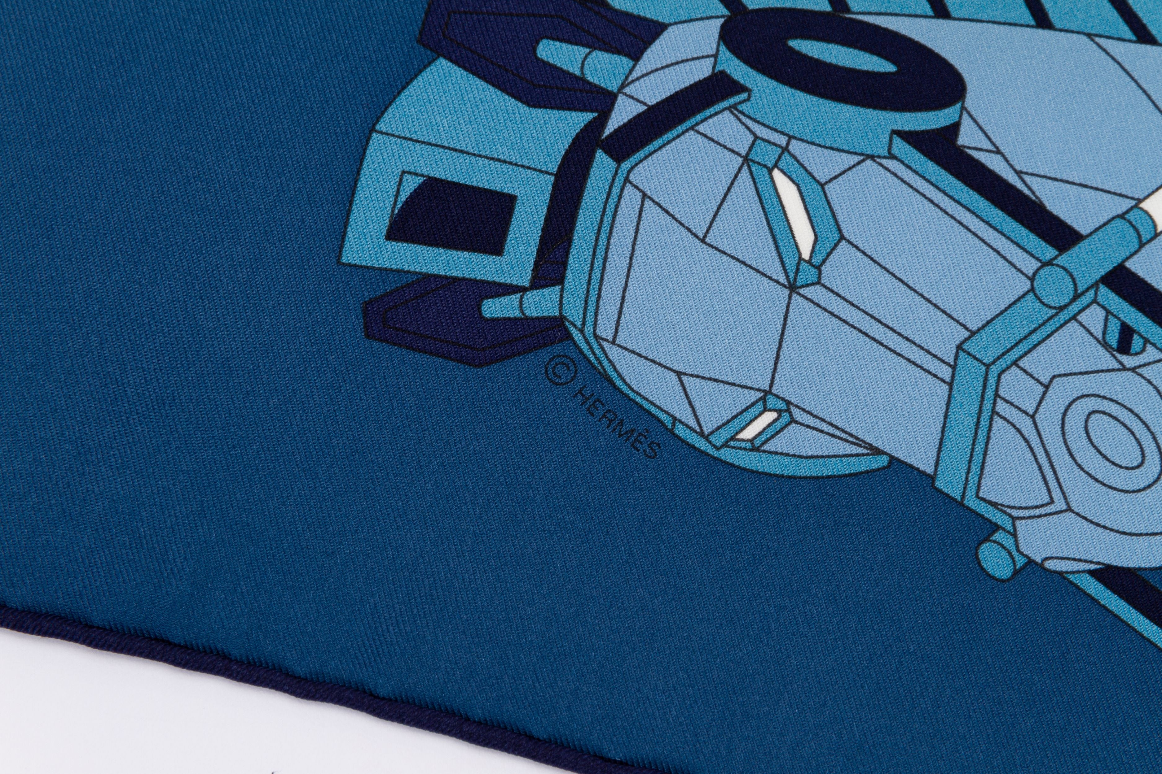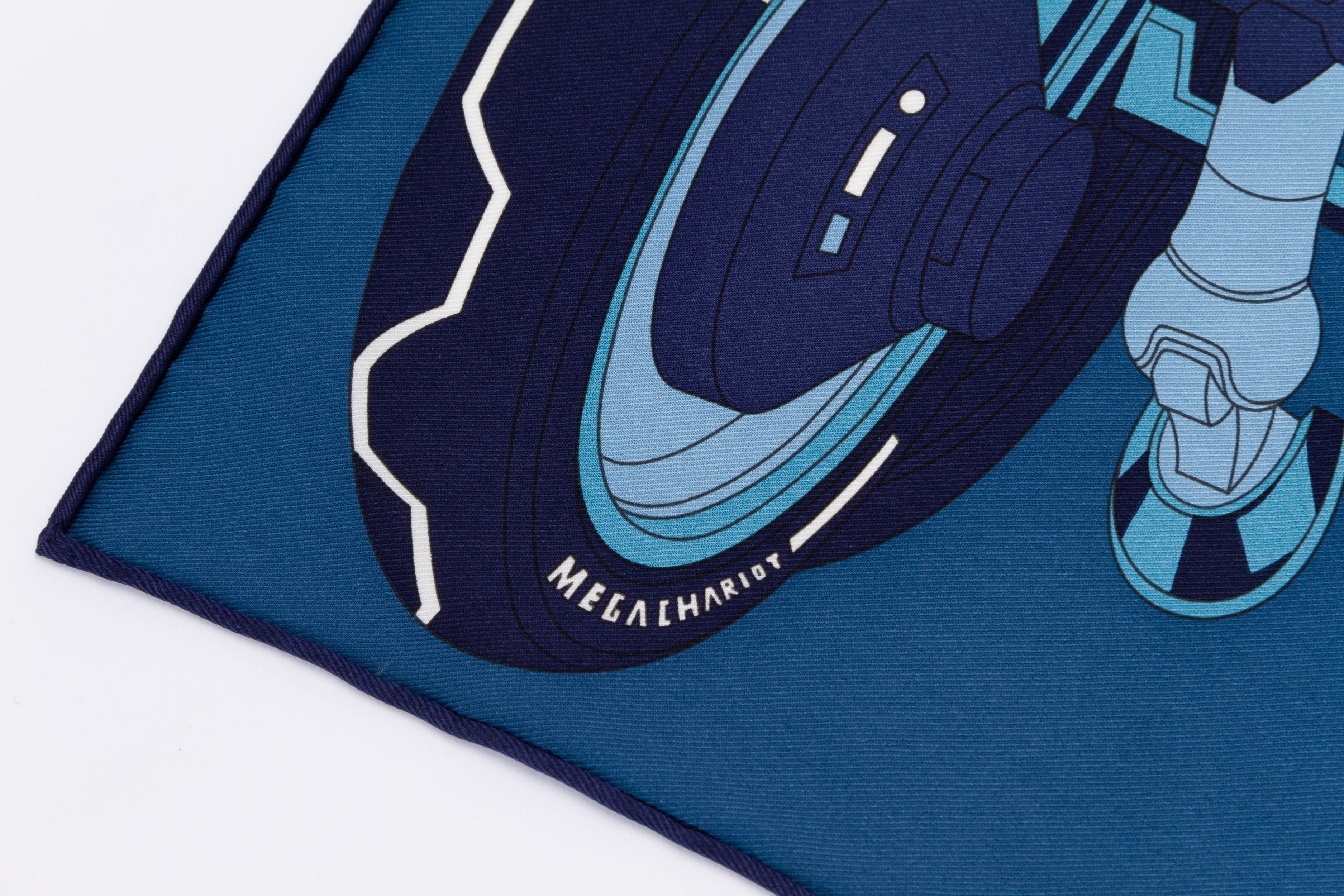 Hermès Mega Chariot by Daisuke Nomura Scarf. Nomura was inspired by a children's horse tricycle from the Emile Hermes collection. He shows the god Hermes who is said to have taken Apollo's chariot without permission. Transformed into a robot, the tricycle hurtles towards Mount Olympus, home of the Greek gods. The piece comes with the original box.