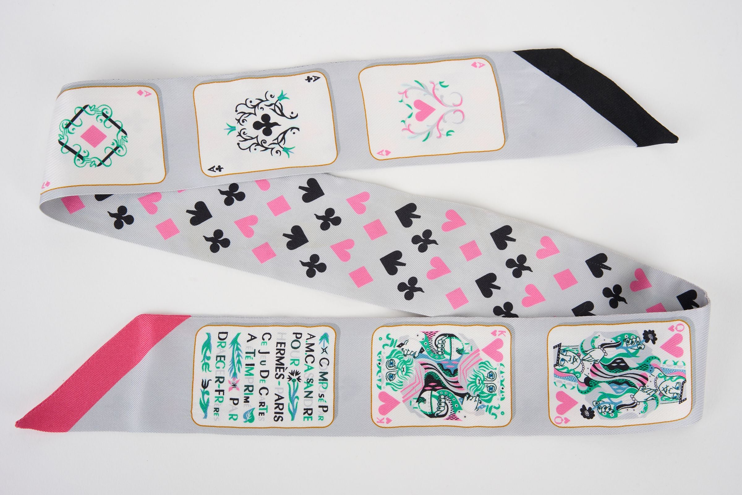 This Hermès Jeu de Cartes Twilly in Gris, Rose, and Black is made from 100% silk. Featuring a playful card design it is playfully perfect. It can be worn in different ways with a slide medor in palladium hardware. Comes with original box. Brand new.