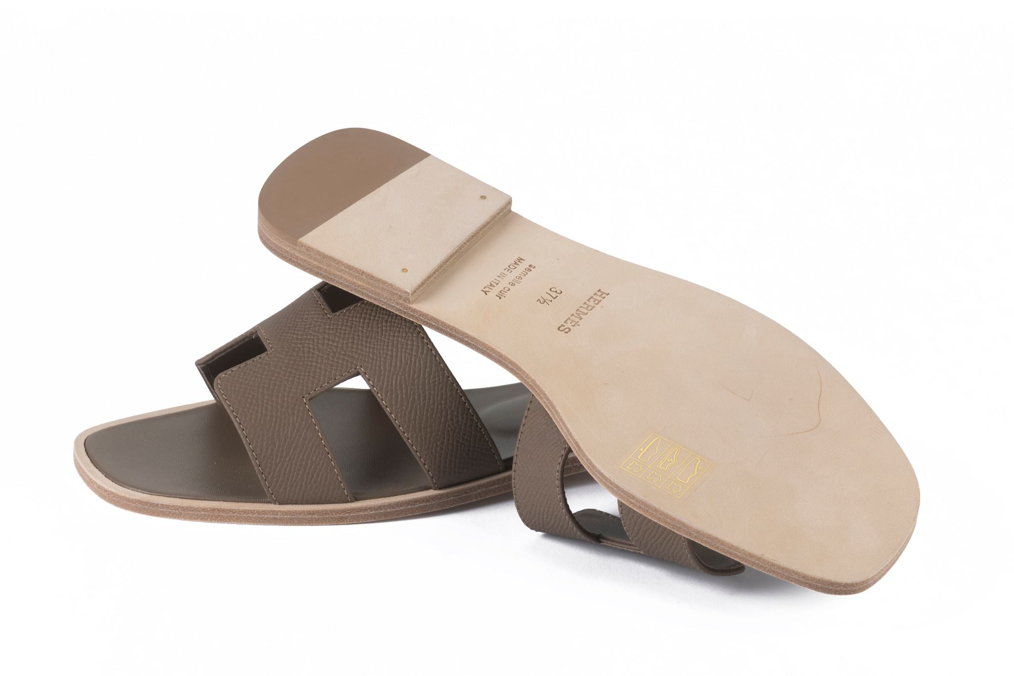 This Hermès Oran Sandal Natural leather sole with a Grezzo leather heel, features etoupe goatskin insole and lining. New in unused condition. Italian number 37.5. Come with ribbon, original dustcover and box.