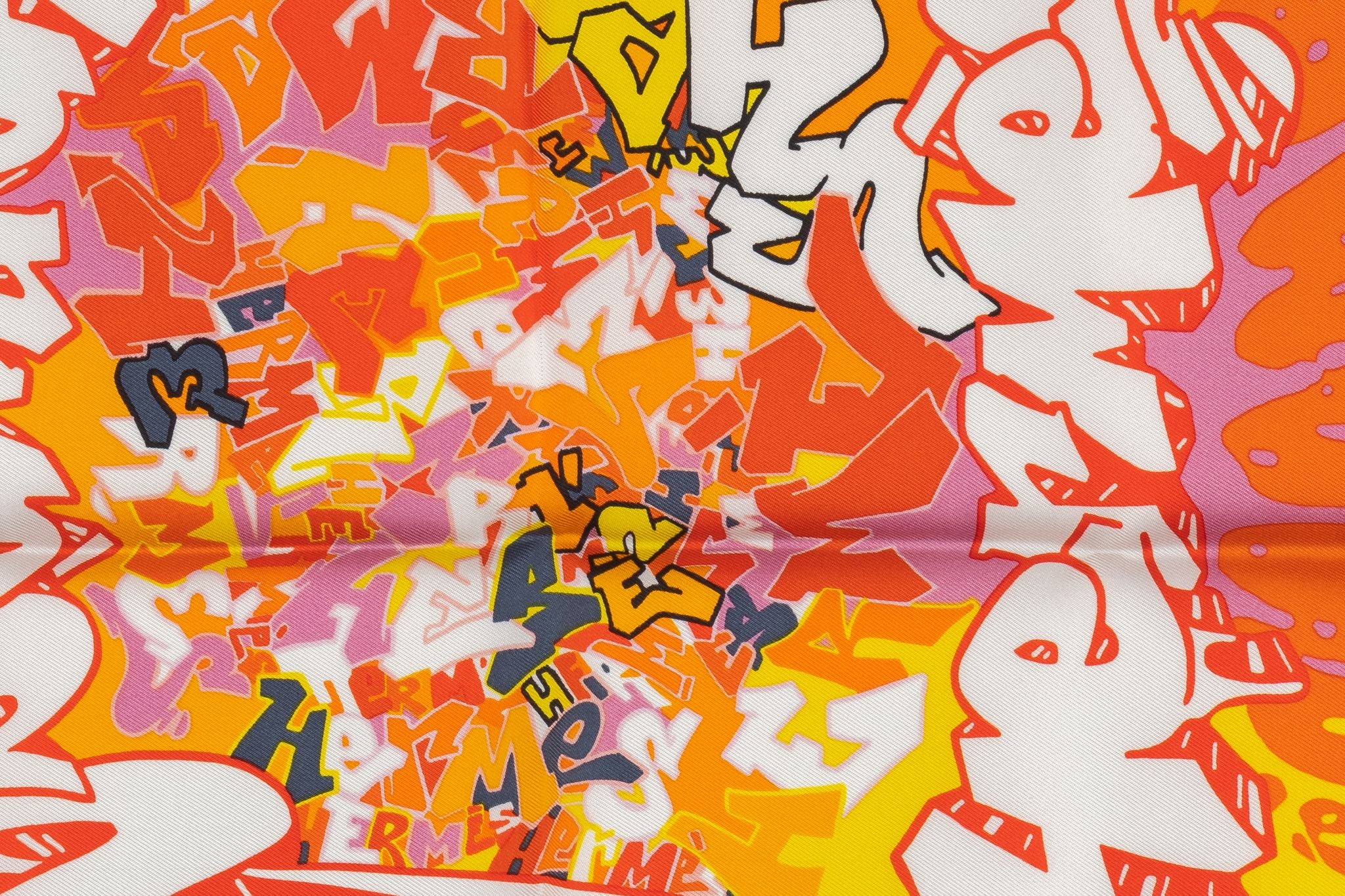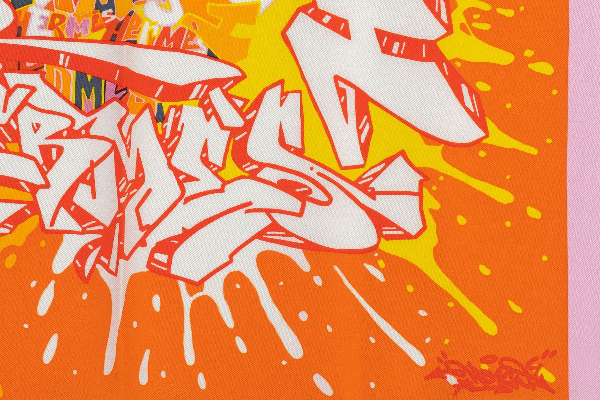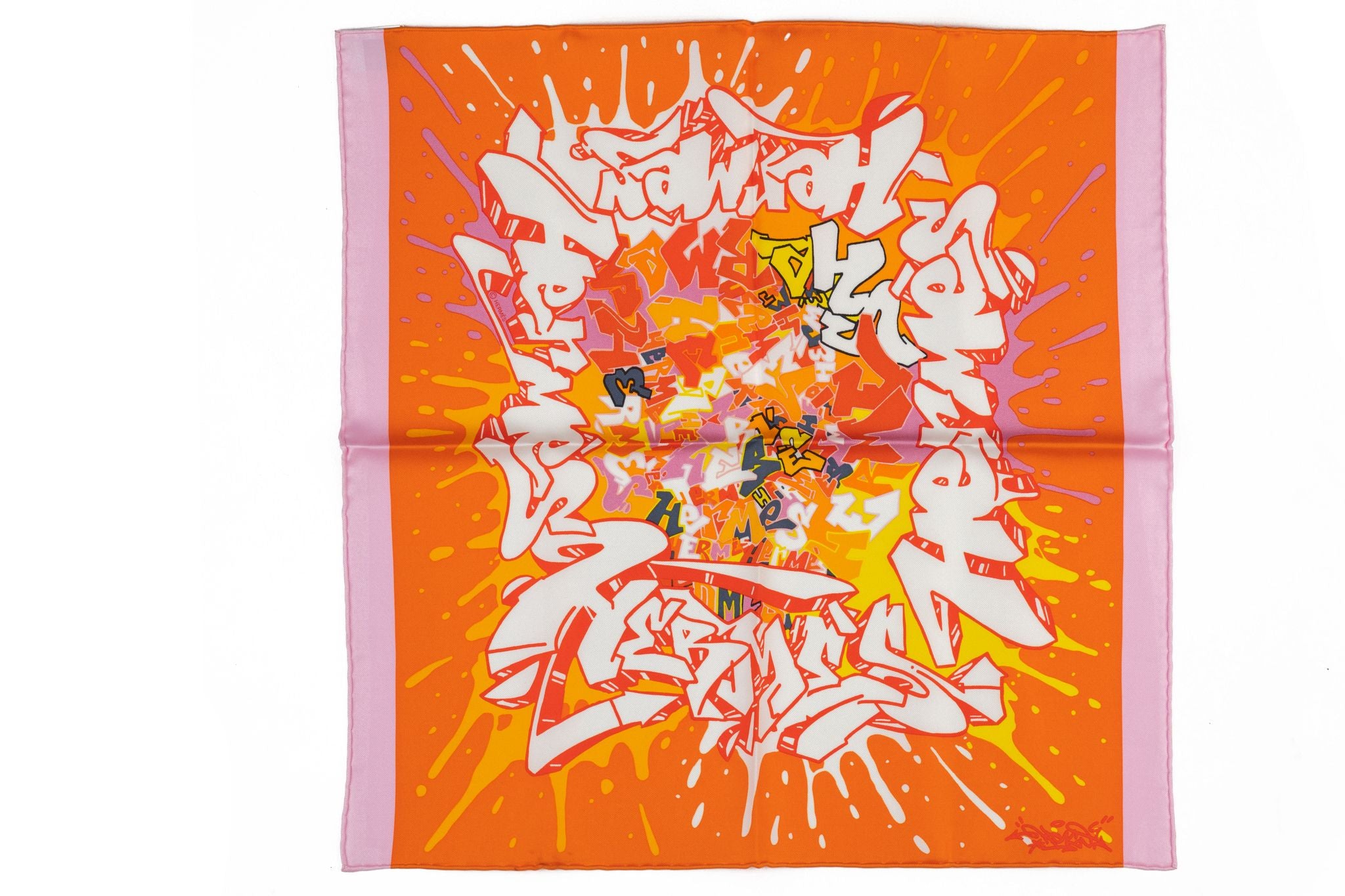 Hermès brand new collectible orange pink graffiti silk gavroche. Hand oiled trim. Comes with original box.