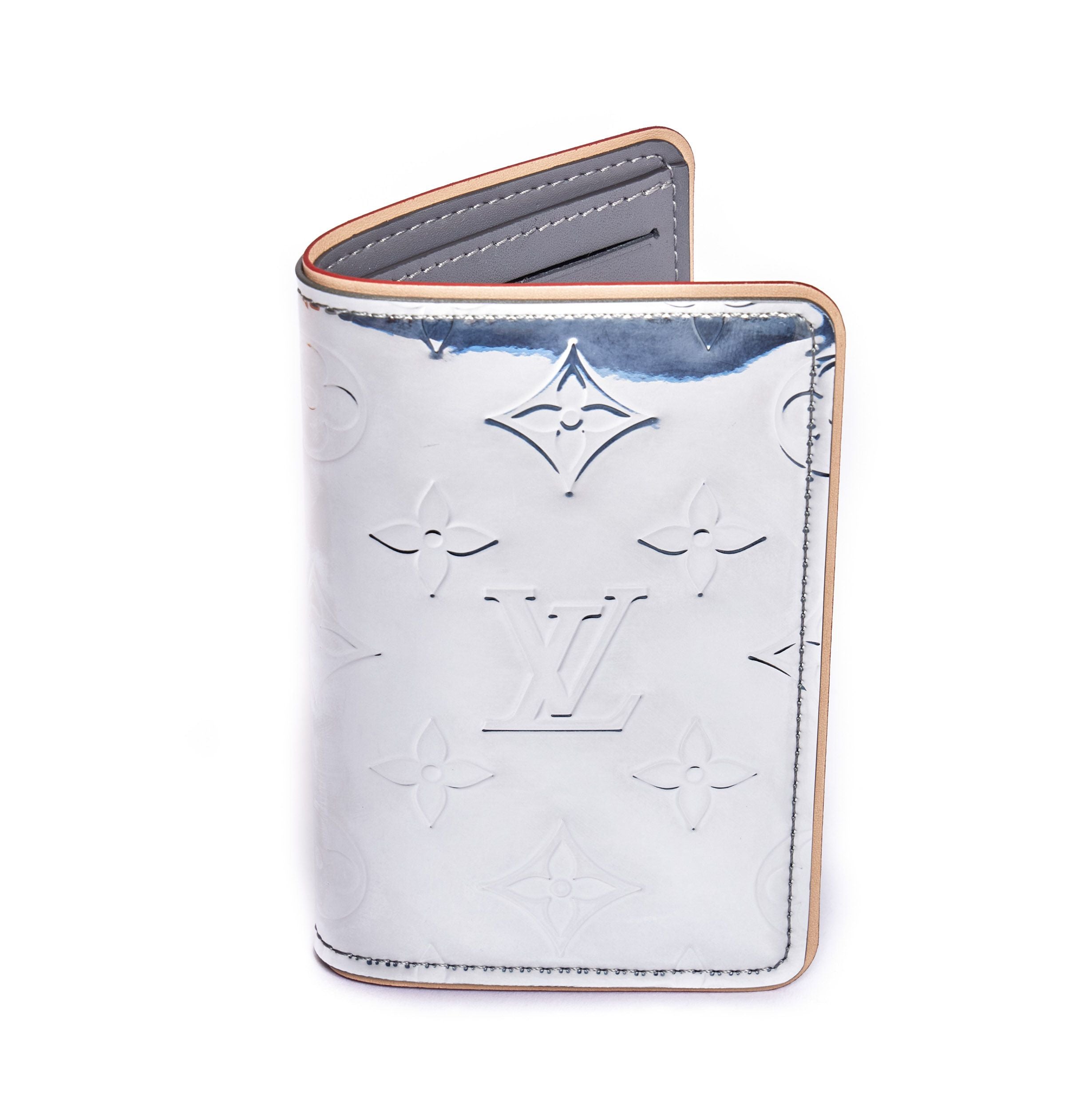 Louis Vuitton reflective monogram mirror canvas organizer with monogram flowers and LVs. Natural cowhide leather trim and grey leather inside. It has 6 card slots and 2 bill compartments. Comes with the original box and dust cover.