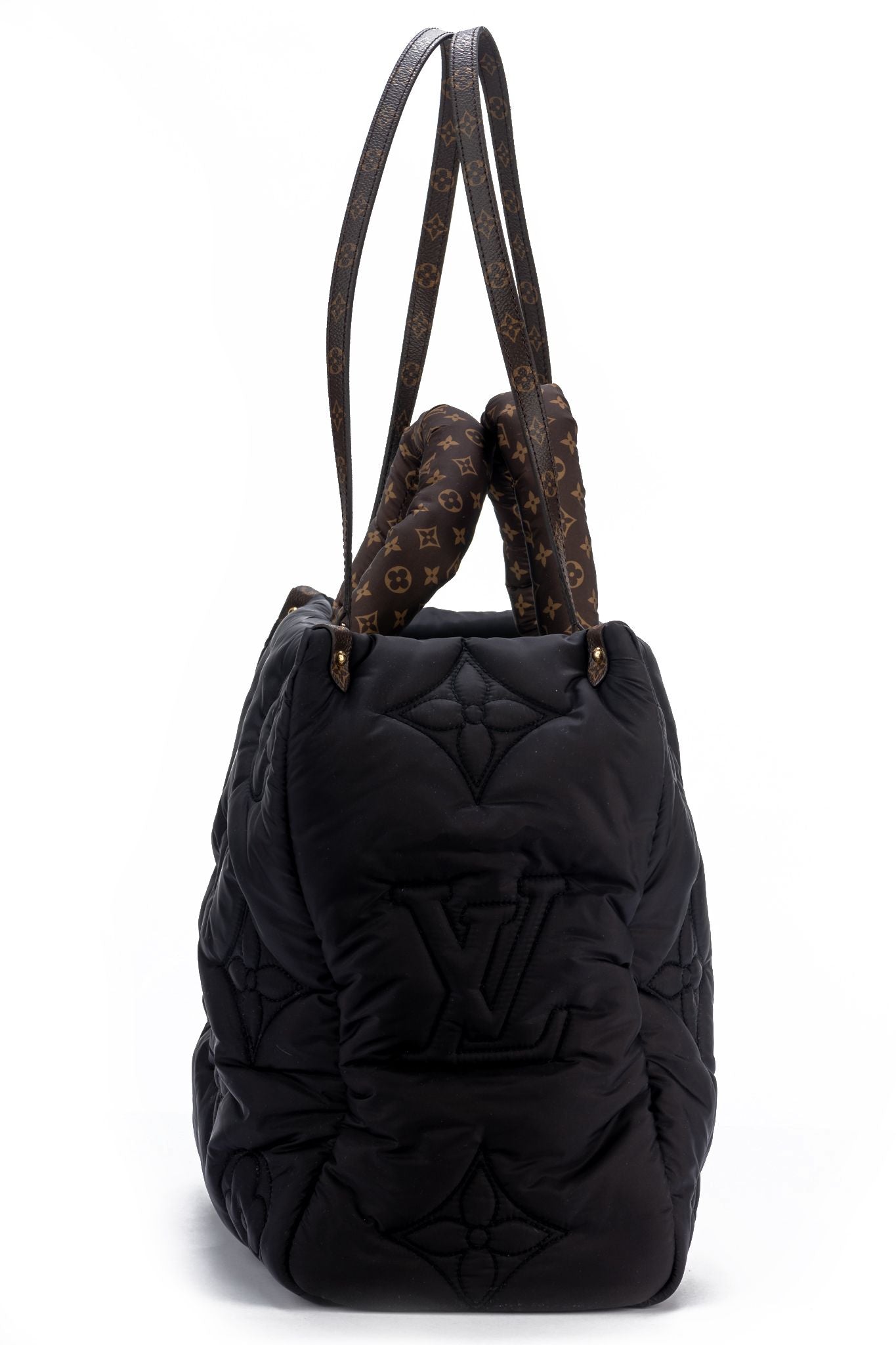 Louis Vuitton sold out worldwide econyl nylon on the go puffer GM in black and brown. Econyl is Vuitton's regenerated nylon. Convenient double straps. Handle drop 3.5", shoulder drip 11.75". Comes with original dust cover and box