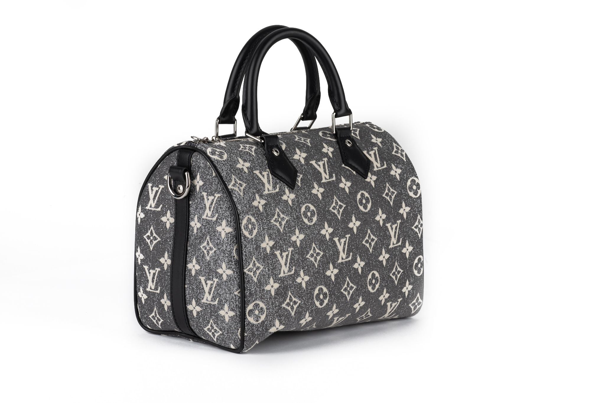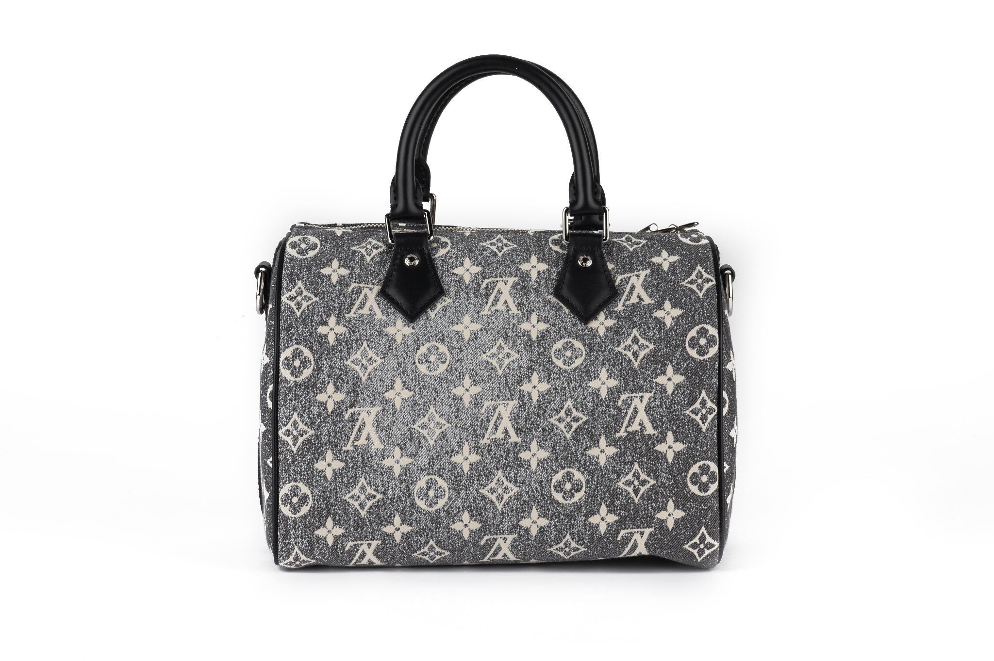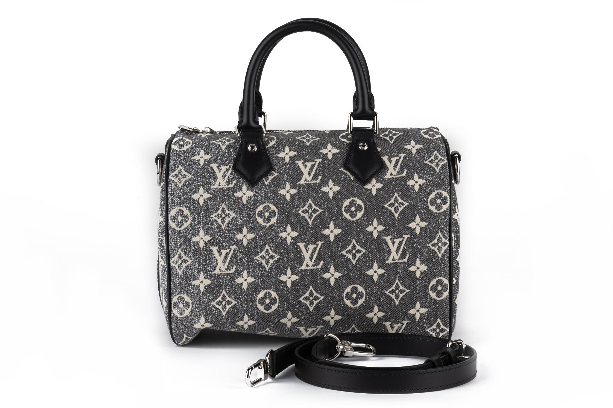 Louis Vuitton new speedy 25 in grey denim monogram toile and black cowhide trim. Handle drops 3”, detachable and adjustable shoulder strap 20.5”. Comes with original dust cover and box.