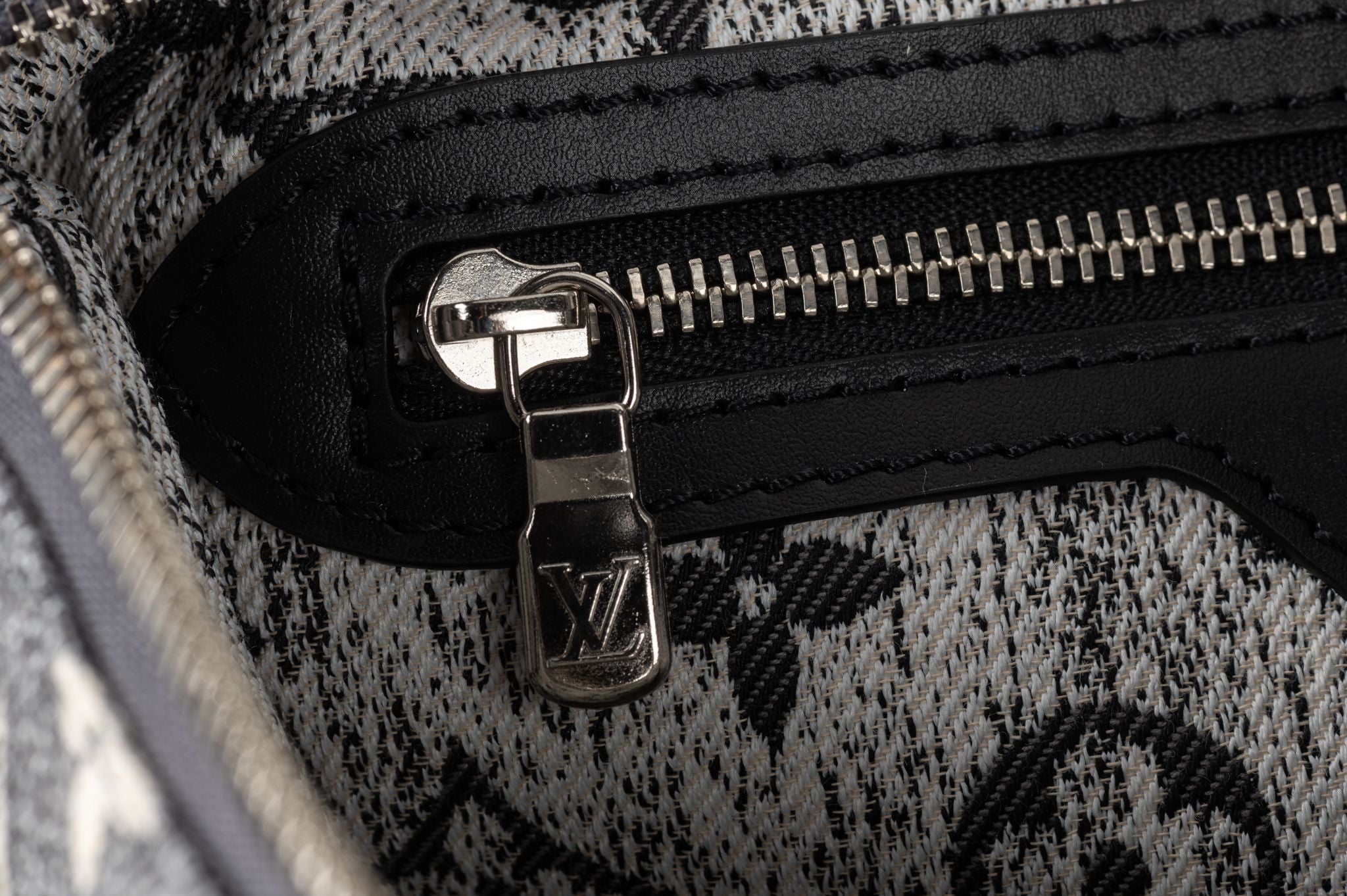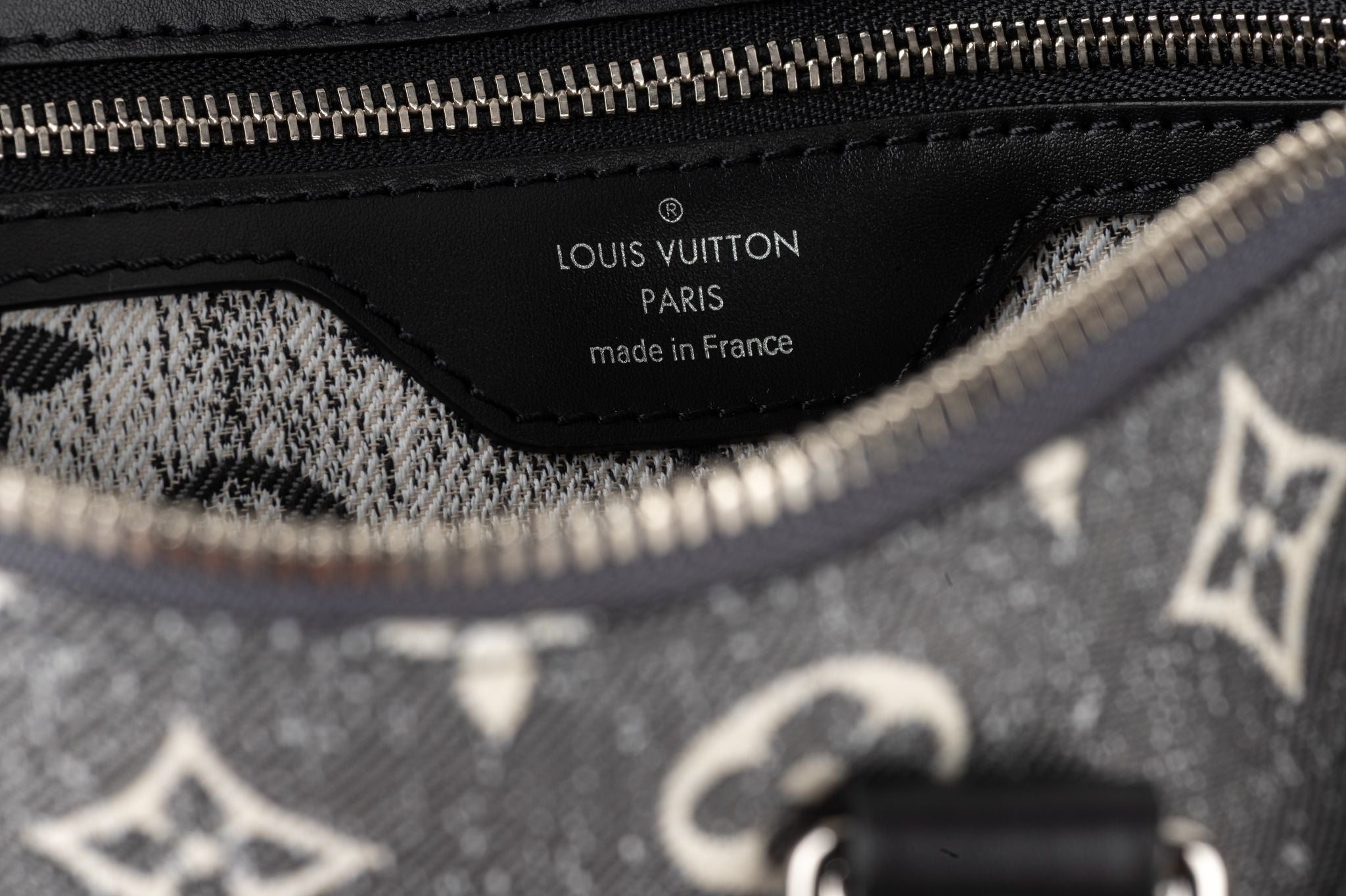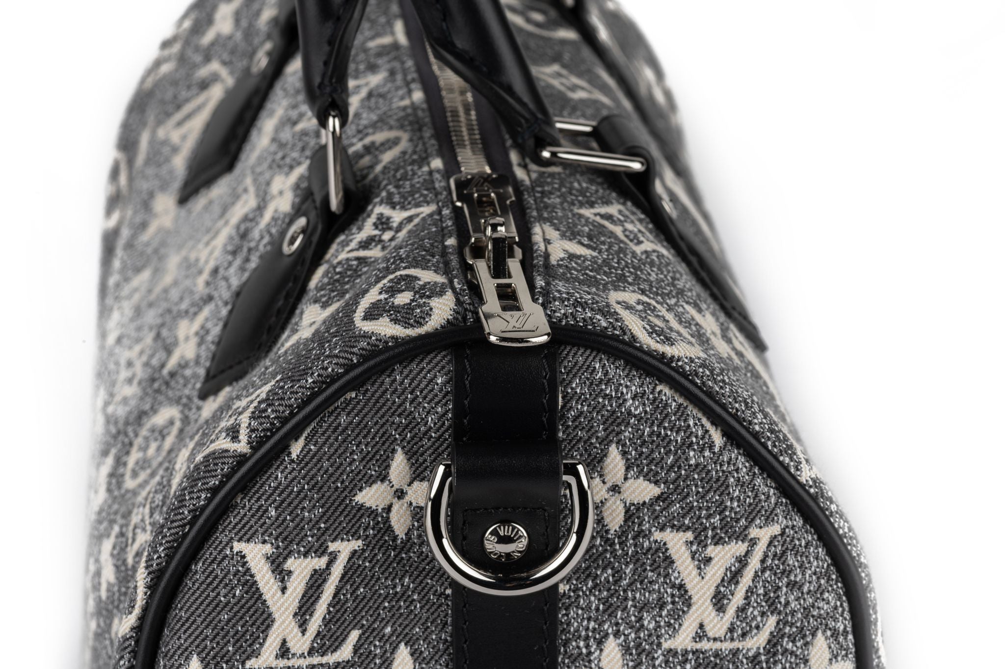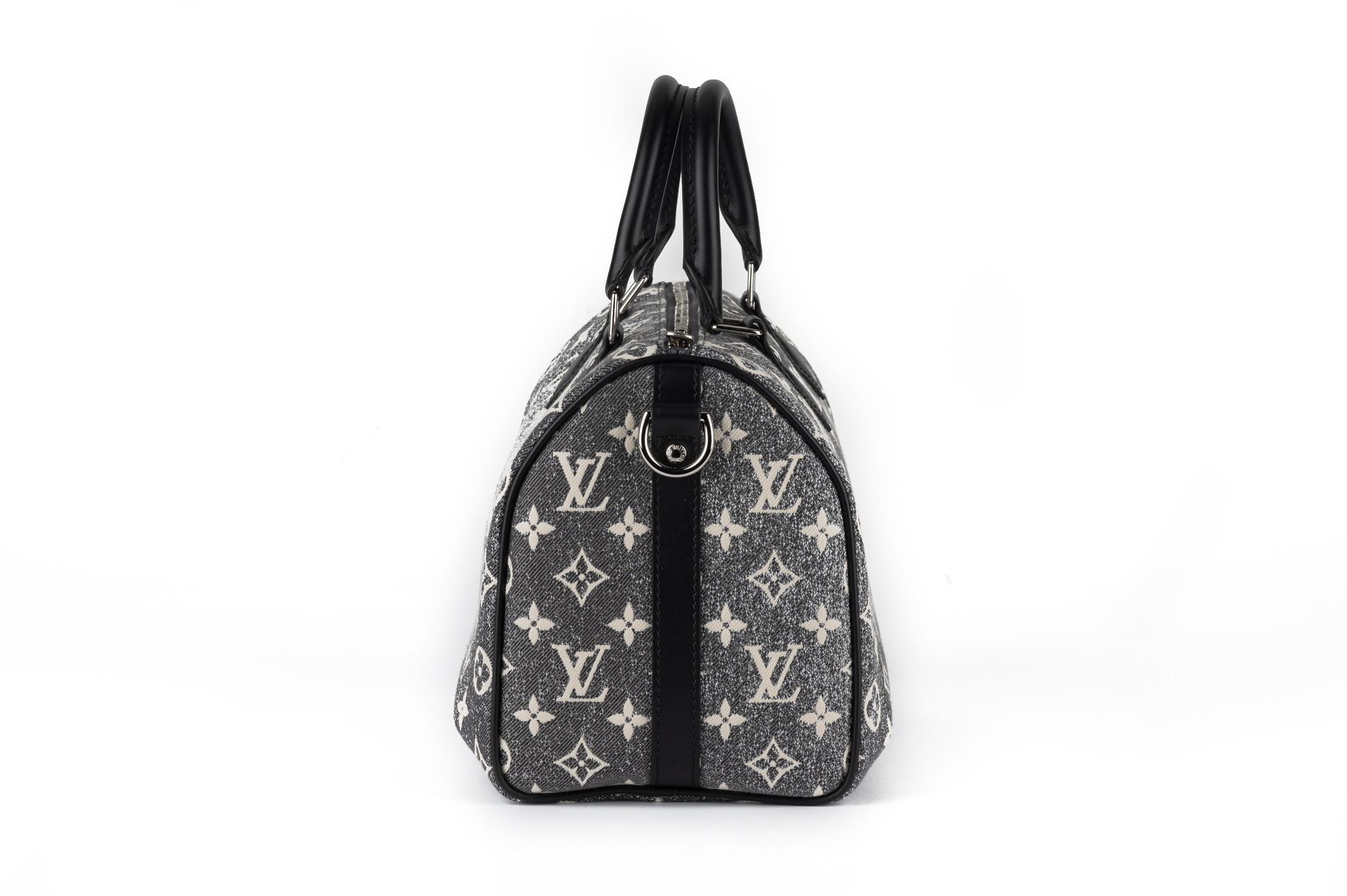 Louis Vuitton new speedy 25 in grey denim monogram toile and black cowhide trim. Handle drops 3”, detachable and adjustable shoulder strap 20.5”. Comes with original dust cover and box.