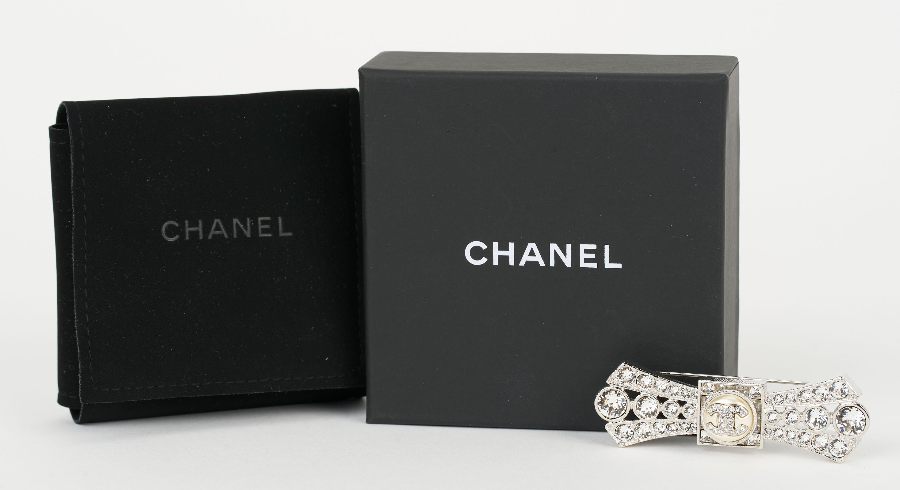 Condition: ExcellentEra: Contemporary; 2000s: 2.2" L x 1.7" WMaterials: Metal, glassColor: silver, white, greyChanel Pin...