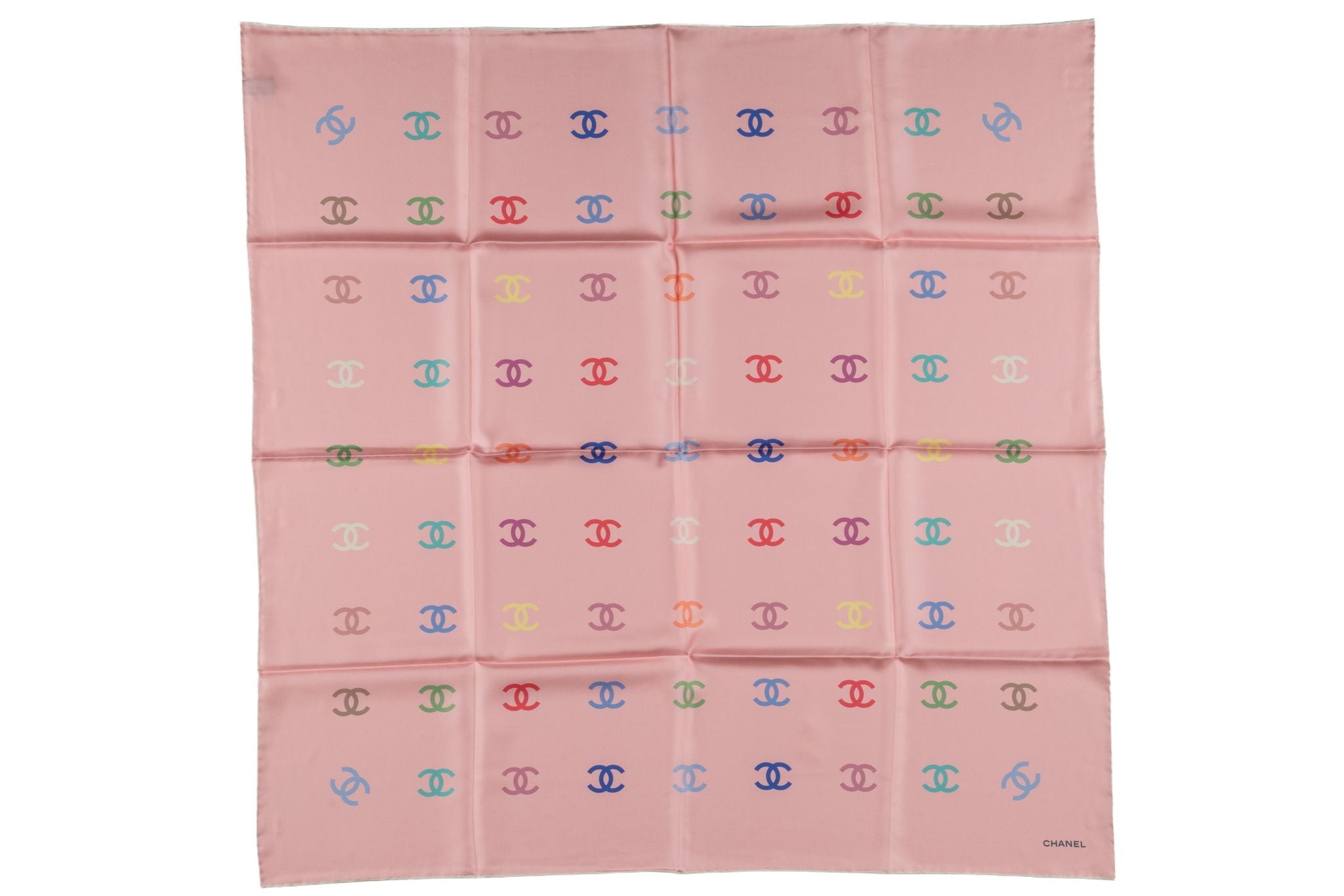 This Chanel Pink CC printed logo scarf is in 100% silk that displays a multicolor CC print. Brand new in unused condition.