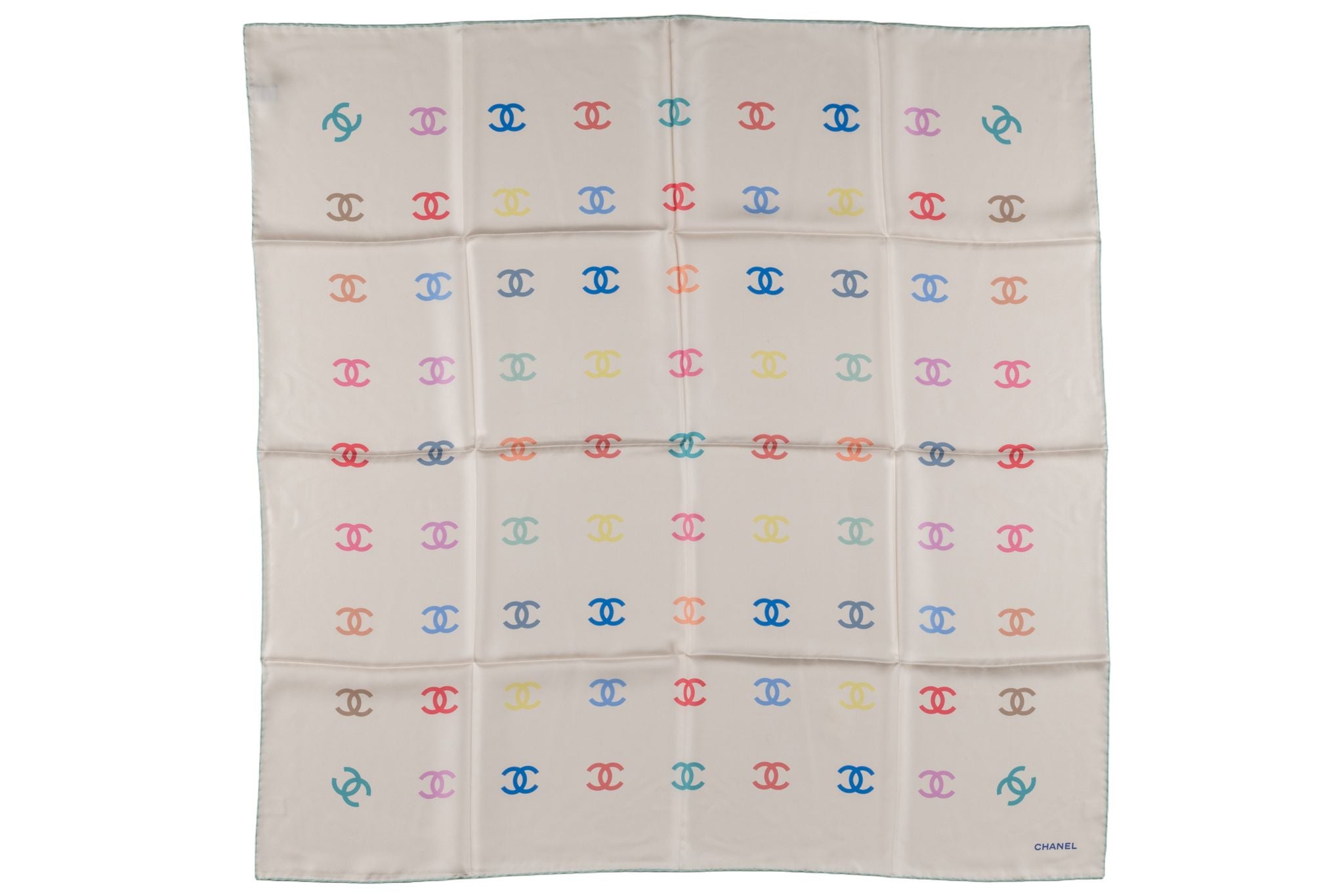 This Chanel White CC printed logo scarf is in 100% silk that displays a multicolor CC print. Brand new in unused condition.