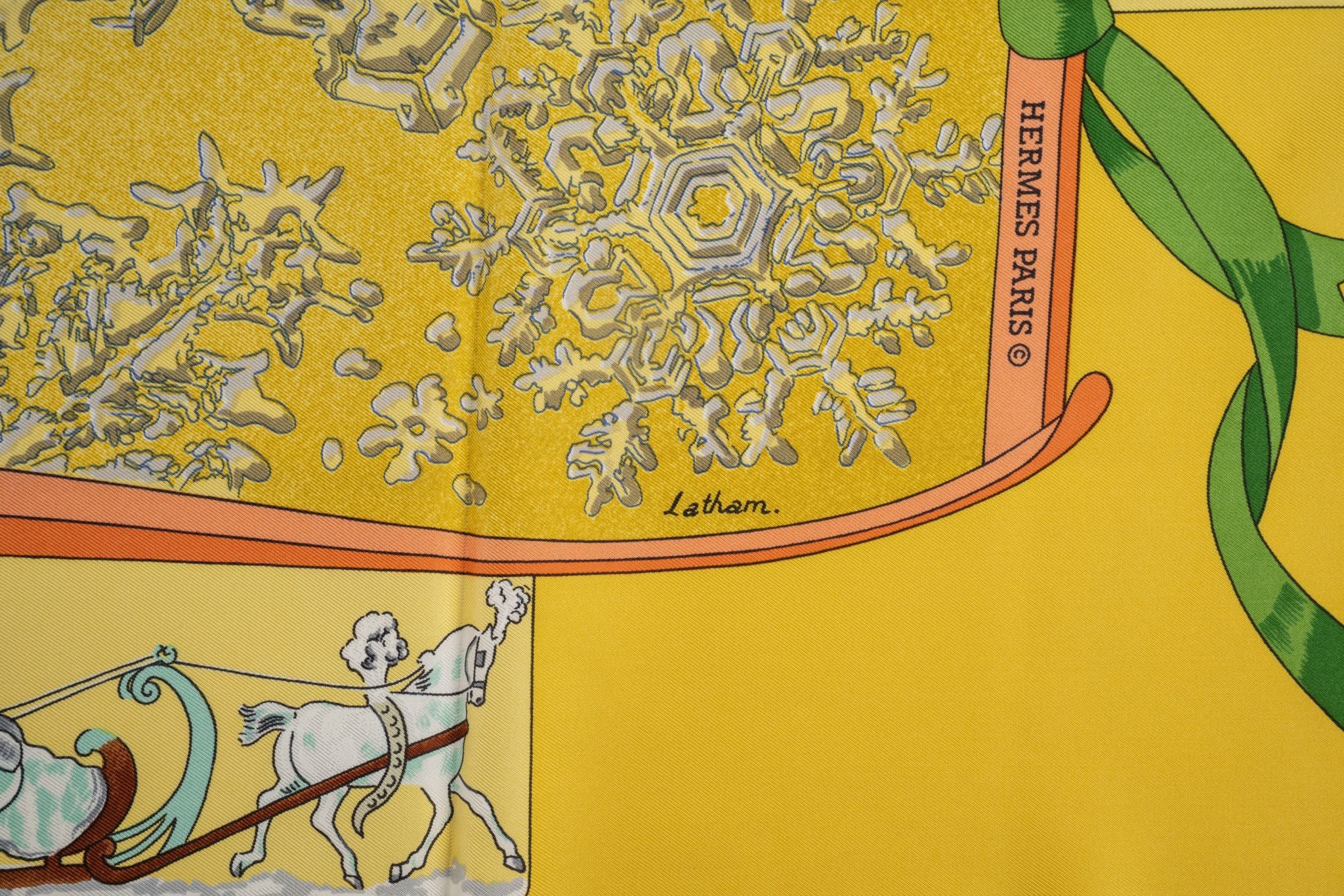 Hermès Highly Collectible "Niege D'Antan" is from 100% silk scarf with hand-rolled edges. Please note there is a little stain in a corner.