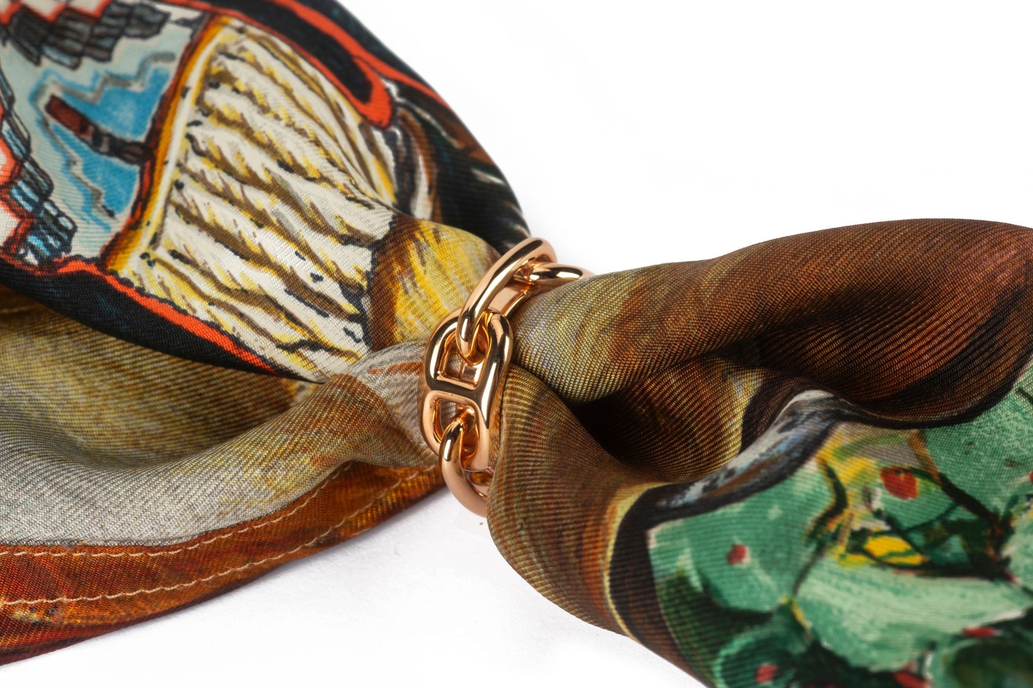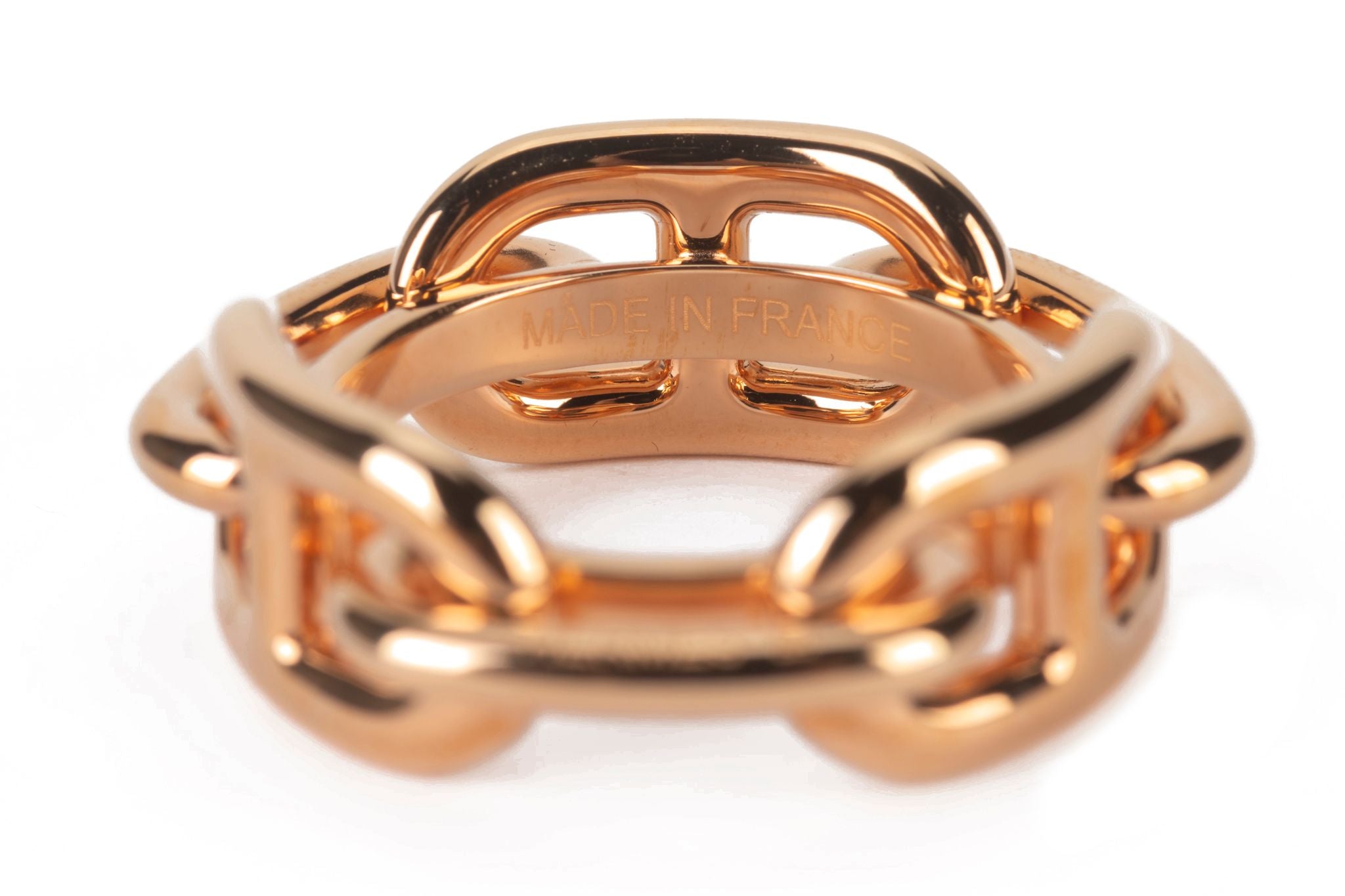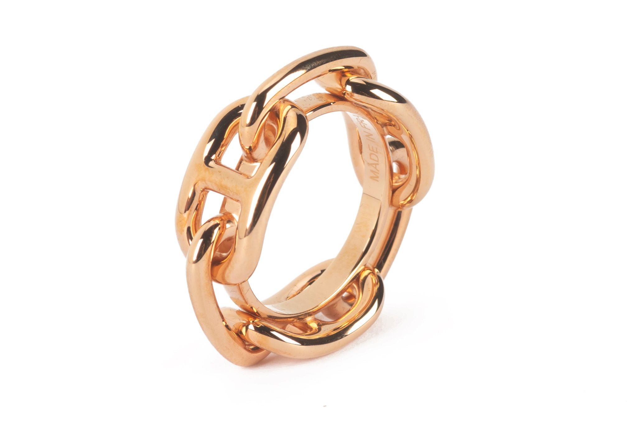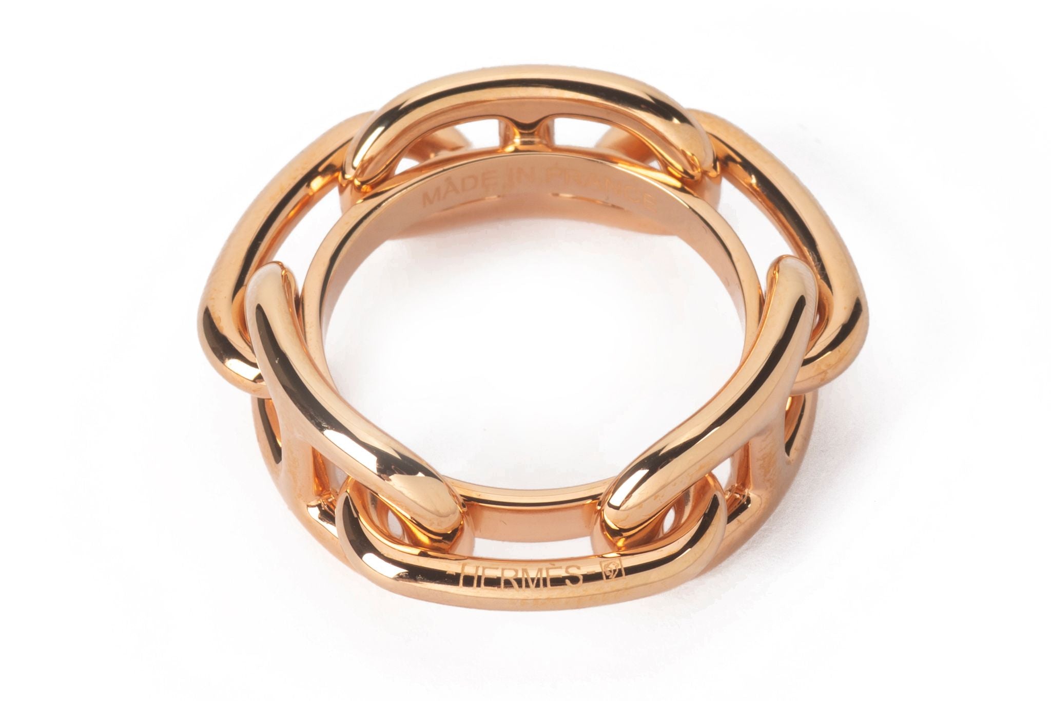 This Hermès Regate Scarf 90 Ring is in rose gold-plated brass. Use the ring to try new ways to wear your scarf with this small accessory that glides right on. Suitable for 90 scarf format. Comes with original box and dust cover.